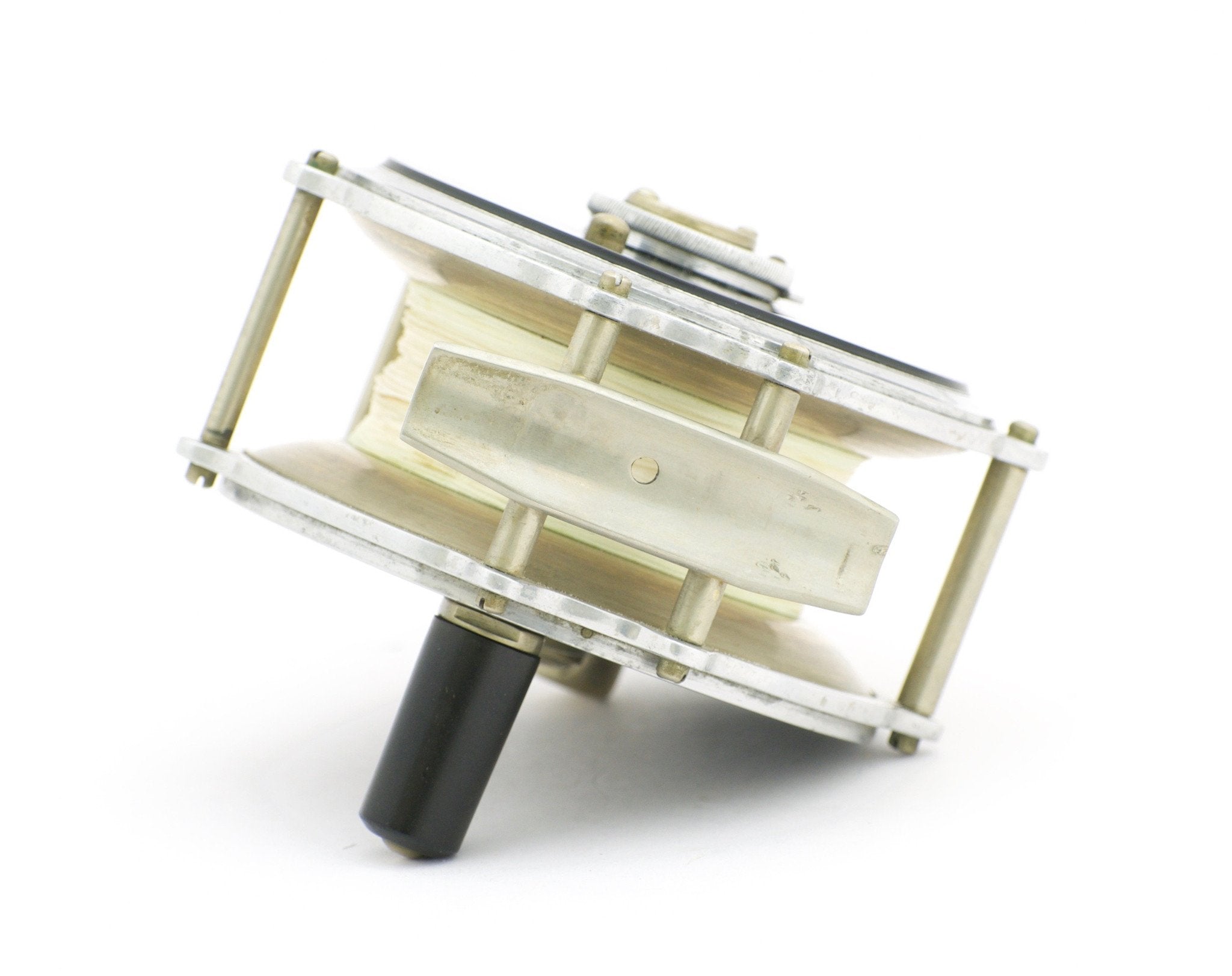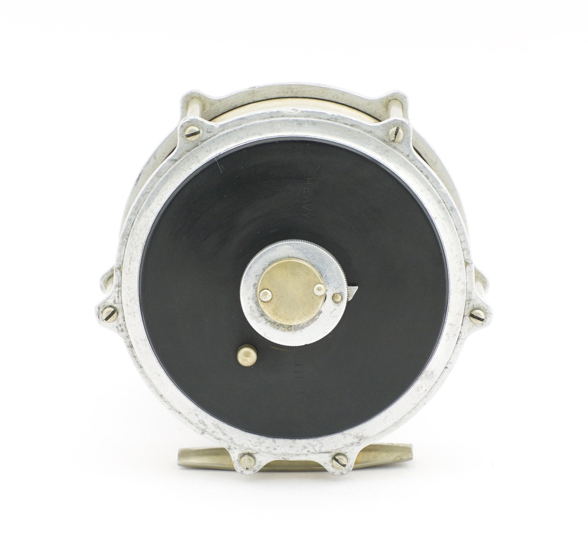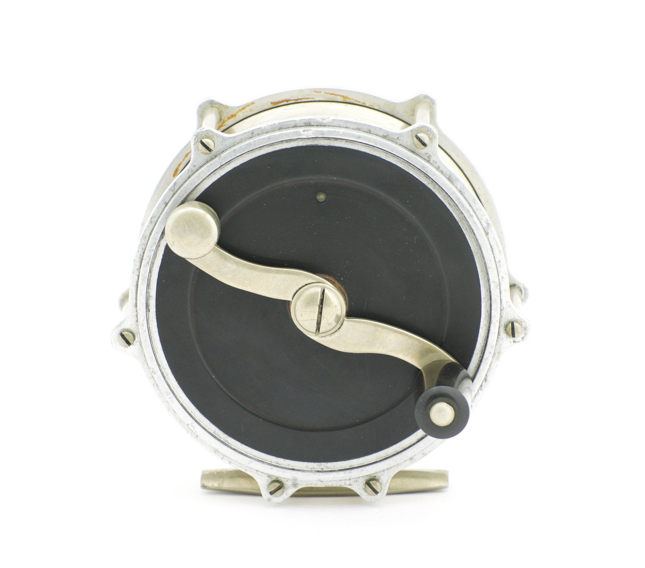 For sale here is a Leonard Mills raised pillar salmon reel made by Julius Vom Hofe. Stamped "Leonard Mills" on the faceplate. Aluminum frame, german silver components. "Light" and "Heavy" markings on the backplate on either side of the adjustable drag mechanism. The reel remains in very good condition. No cracks exist in the sideplates. The screwheads are in fine condition. The reel foot has been neatly altered. Mechanically, the reel operates as intended but the drag in its "heavy" position isn't as strong as it once was. The reel measures 3 3/4" in diameter (4 1/4" pillar to pillar) with a 1 3/8" width between inner frame edges. The reel weighs 19 3/8 oz. with the included backing. Comes with an old leather case in poor condition but worthy of restoration.