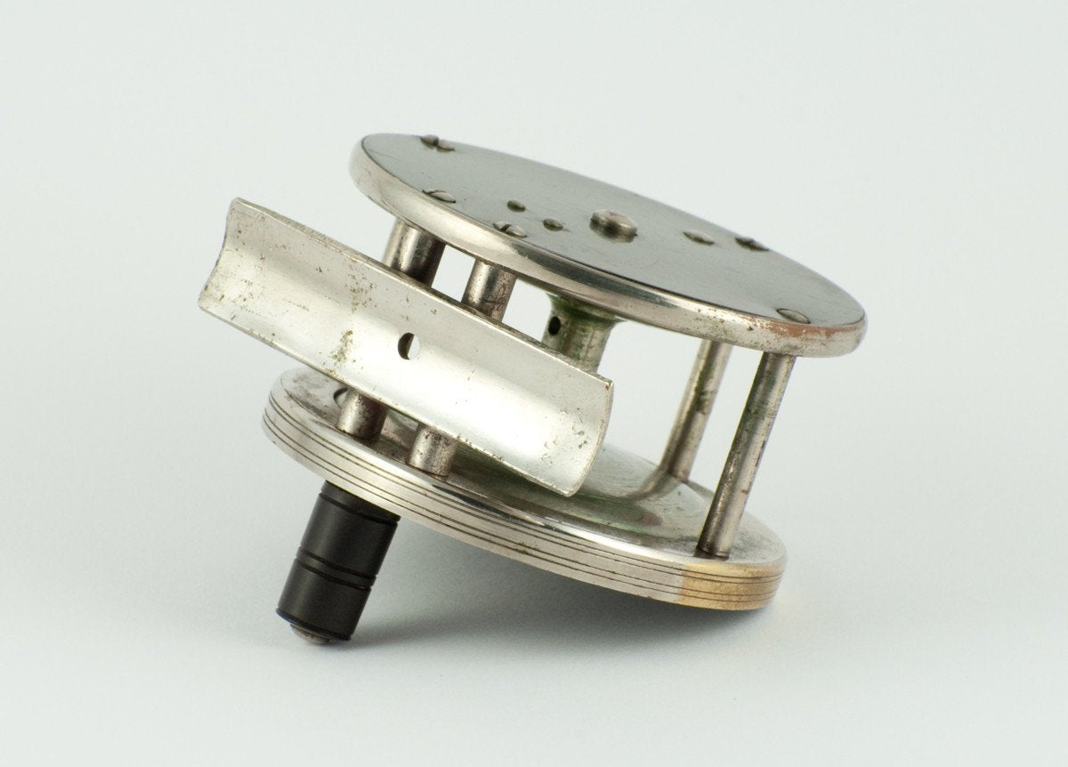 For sale here is a Julius Vom Hofe made size 3 hard rubber reel made for retailer Dame Stoddard. 2 1/2" diameter, 1" wide spool. Hard rubber side plates, half-crank style handle and nickel plated brass hardware. Stamped with "Dame, Stoddard & Kendall Boston" on the head plate. Condition is good, with blemish free and unpolished hard rubber, strong constant click and full length, unaltered german silver foot. The reel winds with a bit of a hitch, which can be fixed by a competent reel mechanic. Right or left hand retrieve, neutral bias. All screws are in good condition.