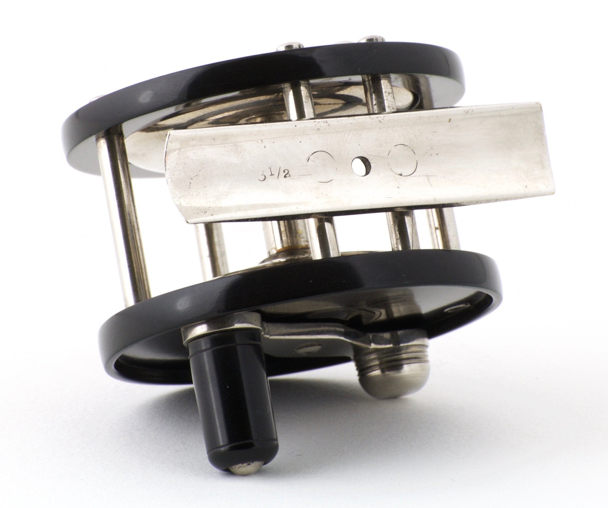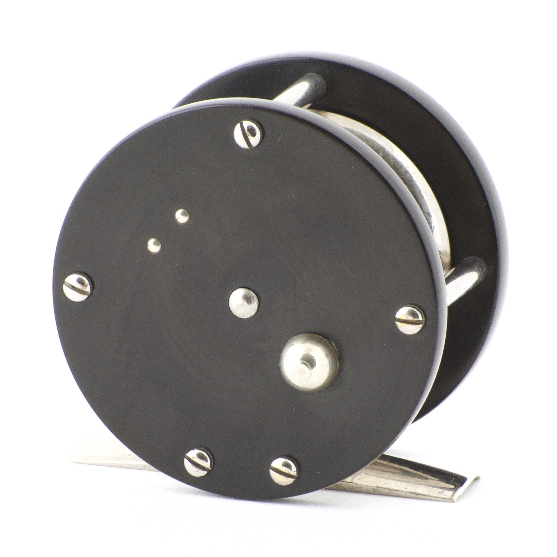 For sale here is a very fine example of Julius Vom Hofe's size 3 1/2 ebonite-rimmed fly reel. Reel is in near mint and original condition. No cracks exist in the hard rubber. Perfect mechanical condition.