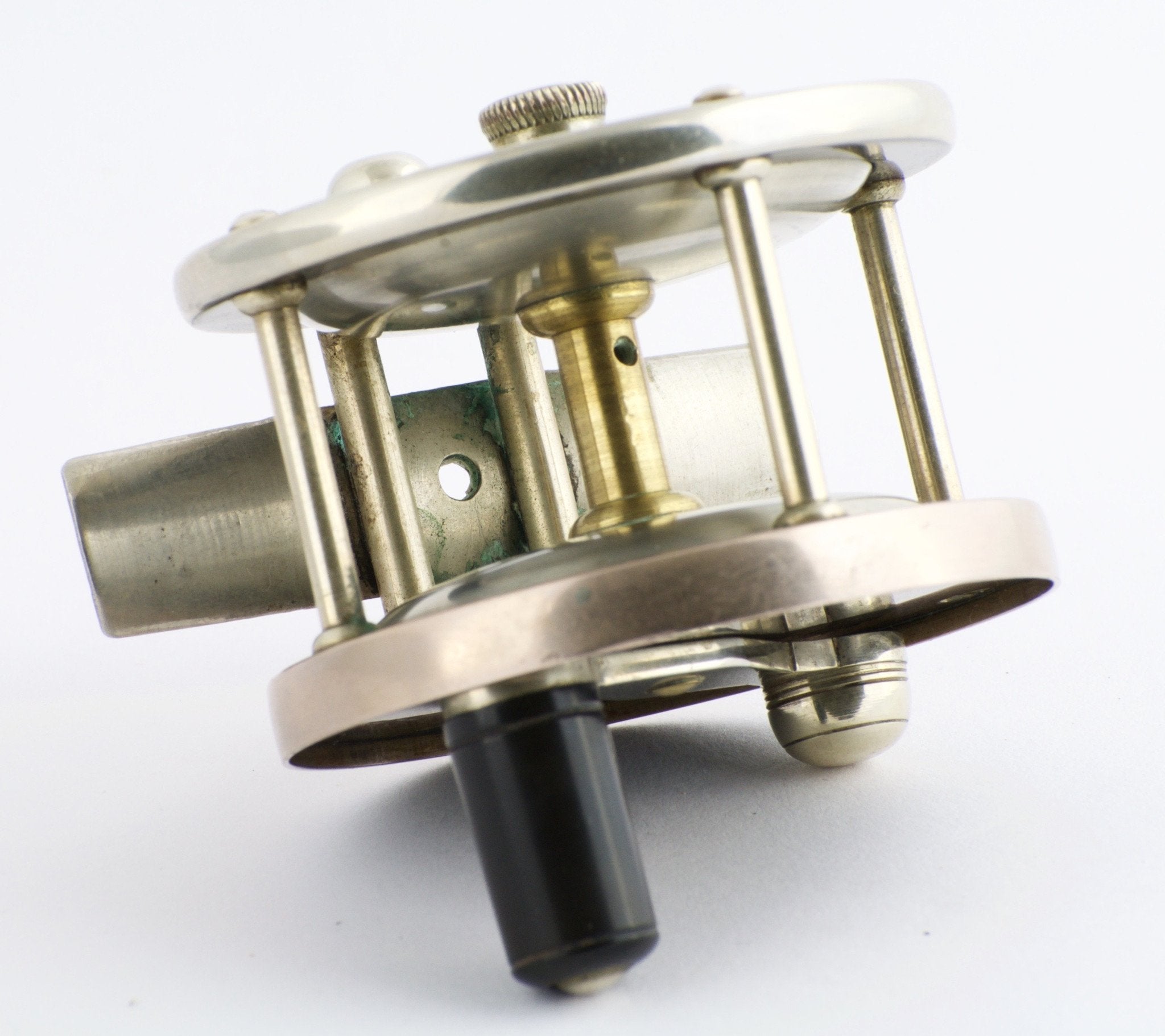 For sale here is a Julius Vom Hofe made size 3 1/2 fly reel, stamped on the tailplate, "Julius Vom Hofe N.Y. Pat. Oct. 8, '89". 2 1/4" diameter, 1" wide spool. Hard rubber side plates and German silver hardware. Shouldered pillars. The reel is in excellent condition cosmetically and mechanically. Blemish-free and unpolished sideplates, strong constant click and full length, unaltered german silver foot. All screws are in good condition.