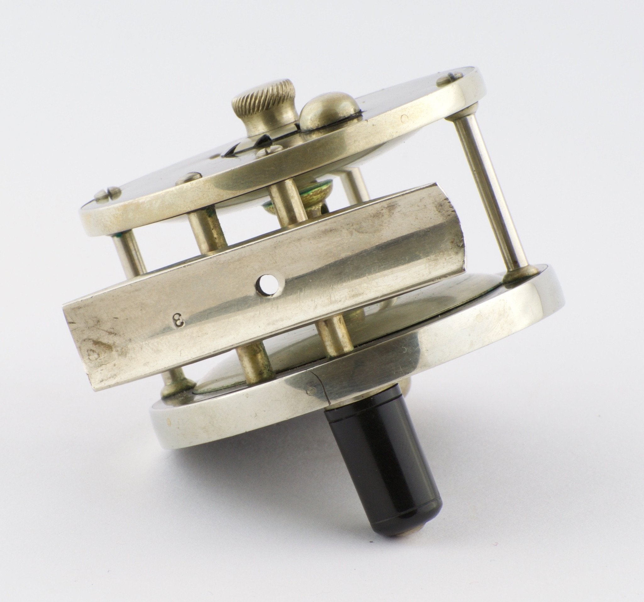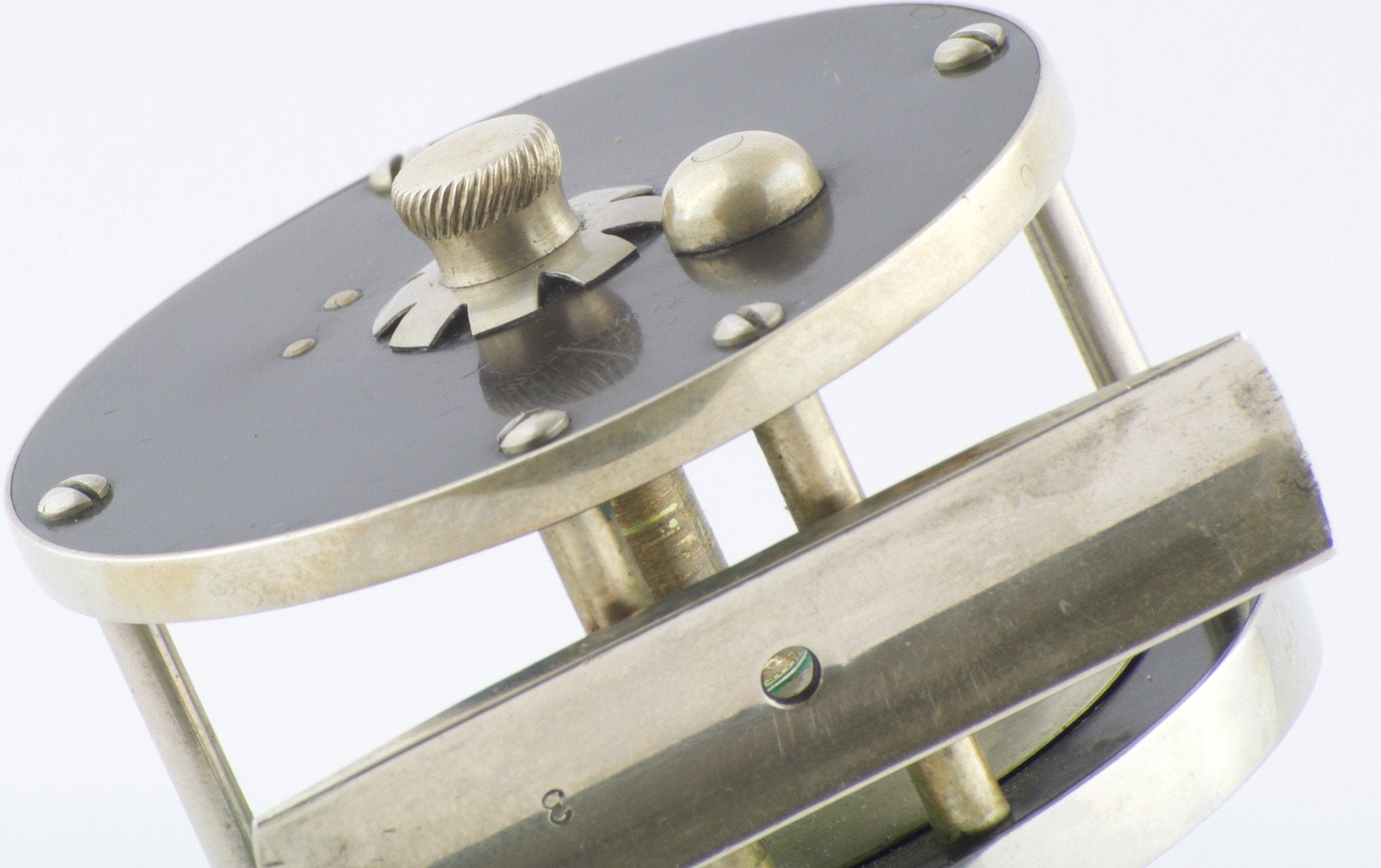 For sale here is a Julius Vom Hofe made size 3 fly reel, stamped on the tailplate, "Julius Vom Hofe Pat. Oct 8 '89". 2 1/2" diameter, 1" wide spool. Hard rubber side plates and German silver hardware. Shouldered pillars. The reel is in excellent condition cosmetically and mechanically. Blemish-free and unpolished sideplates, strong constant click and full length, unaltered german silver foot. All screws are in good condition.