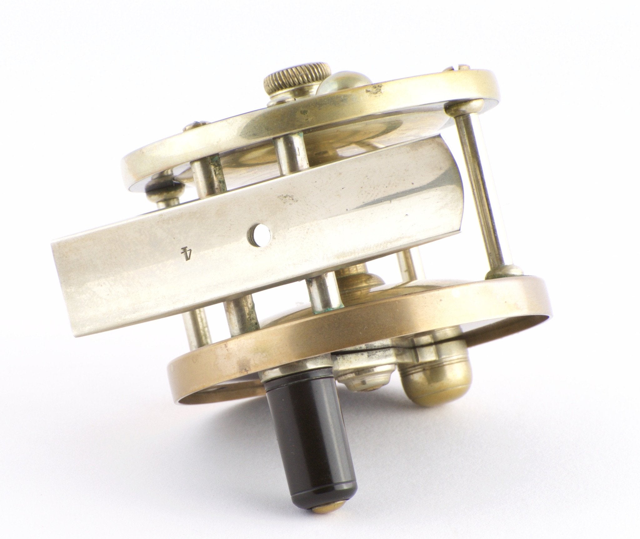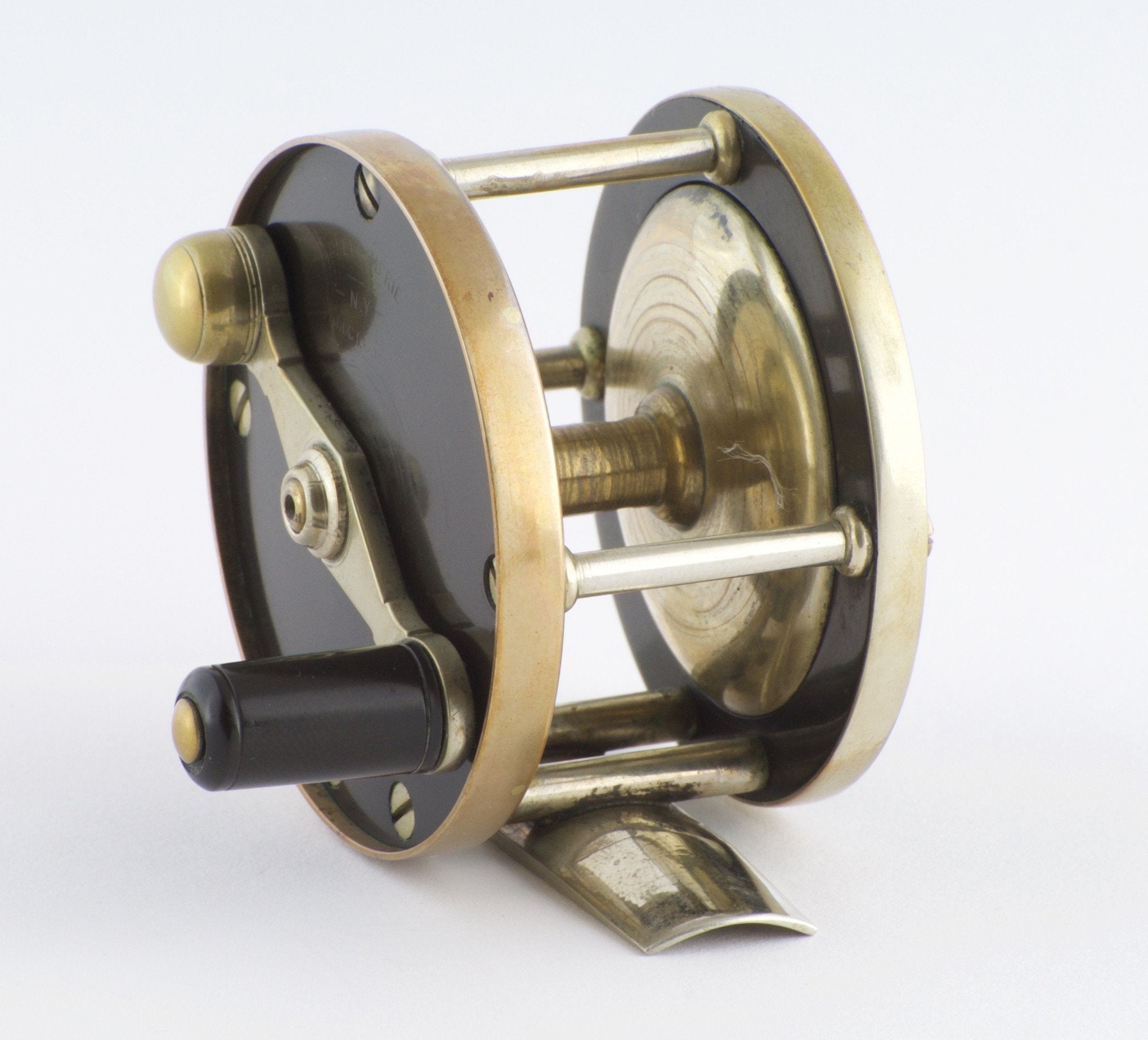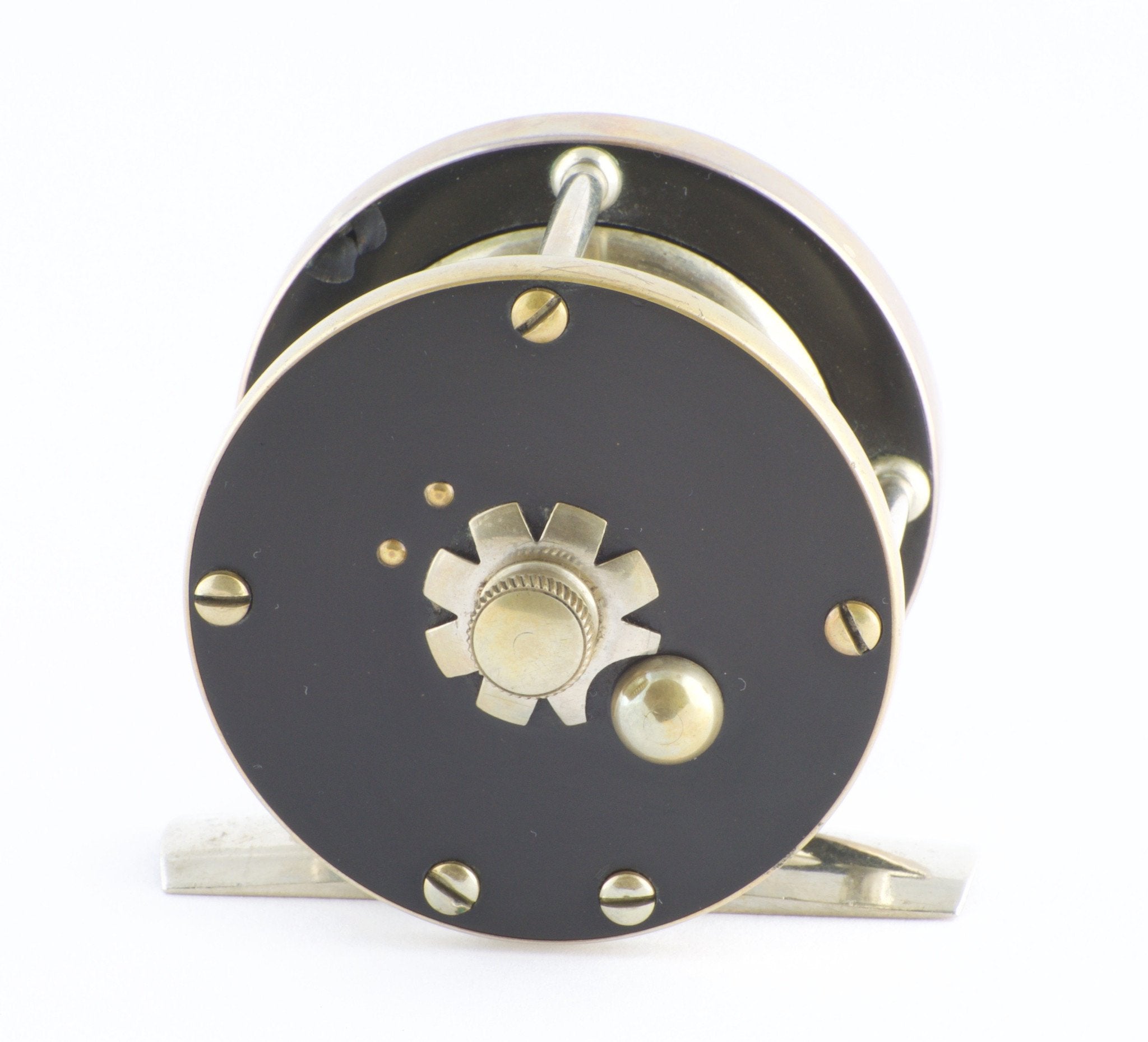 For sale here is a Julius Vom Hofe made size 4 fly reel, stamped on the headplate, "Abbey & Imbrie N.Y. Pat. Oct. 8, 1889". 2 1/8" diameter, 1" wide spool. Hard rubber side plates and German silver hardware. Shouldered pillars. The reel is in excellent condition cosmetically and mechanically. Blemish-free and unpolished sideplates, strong constant click and full length, unaltered german silver foot. All screws are in good condition. There is a very small chip out of the inner ebonite ring (visible in second photo).