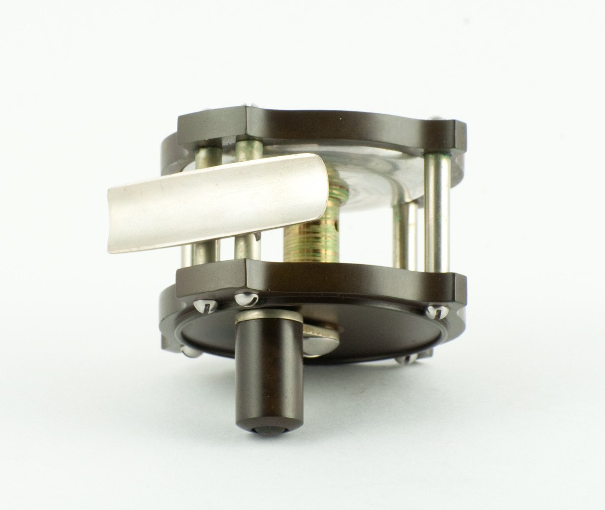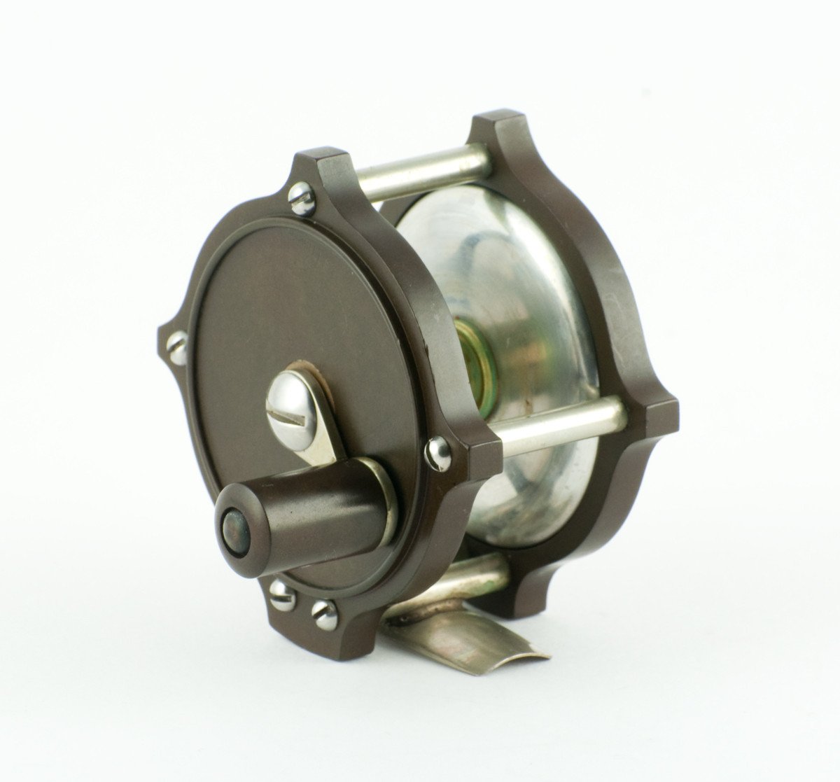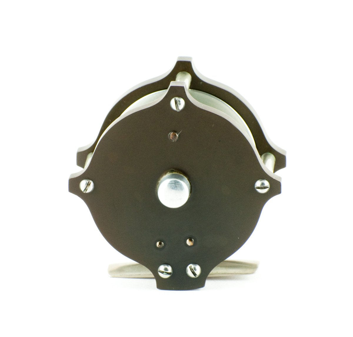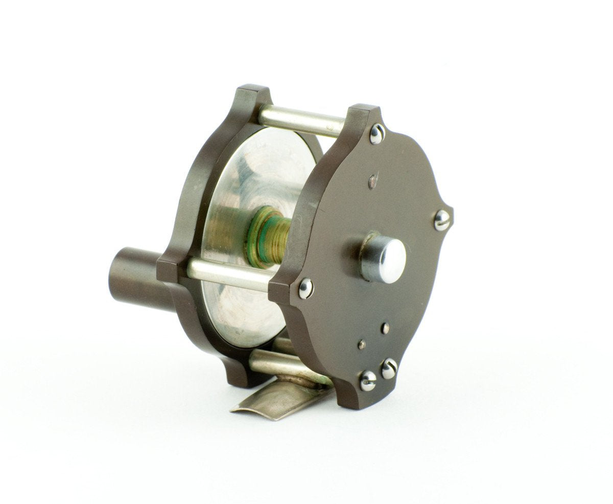 For sale here is an original William Mills & Son "Fairy" Raised Pillar / Hard Rubber Fly Reel. Specifically made for use with the Leonard Baby Catskill fly rods, this 2 1/4" diameter (pillar to pillar) reel features an aluminum spool and nickel silver fittings. The tiny crank handle has a hard rubber grasp and the foot is full length and straight. The reel overall is in excellent plus condition, inside and outside. The reel was stored in one place for a very long time and thus the hard rubber is darker on the headplate where the handle rested for so long (see last photo). Stamped "William Mills & Son N.Y." on headplate.