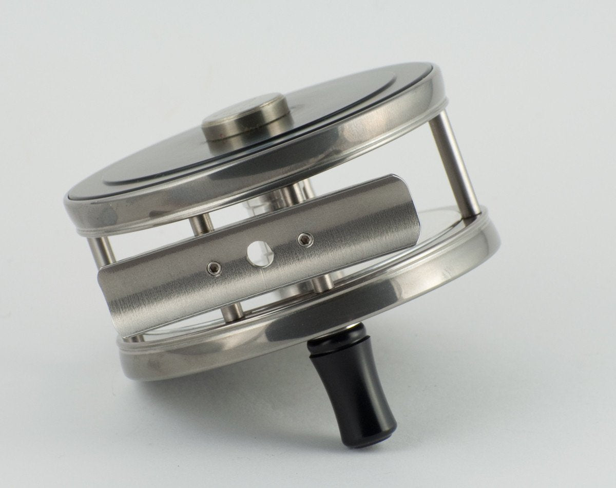 For sale here is a beautiful Kineya Model 701 fly reel in unused condition. Comes with original Kineya suede drawstring reel bag. Stainless steel rims and pillars, delrin side plates. Counterbalance and rear cap are nickel silver. Fixed check system. Diameter is 2.9", spool width is 0.8". Reel weighs 5 7/8 oz. Capacity is DT4+120 or DT5+80. Anything you see on the reel in the photos is lint or dust. The reel is immaculate.
