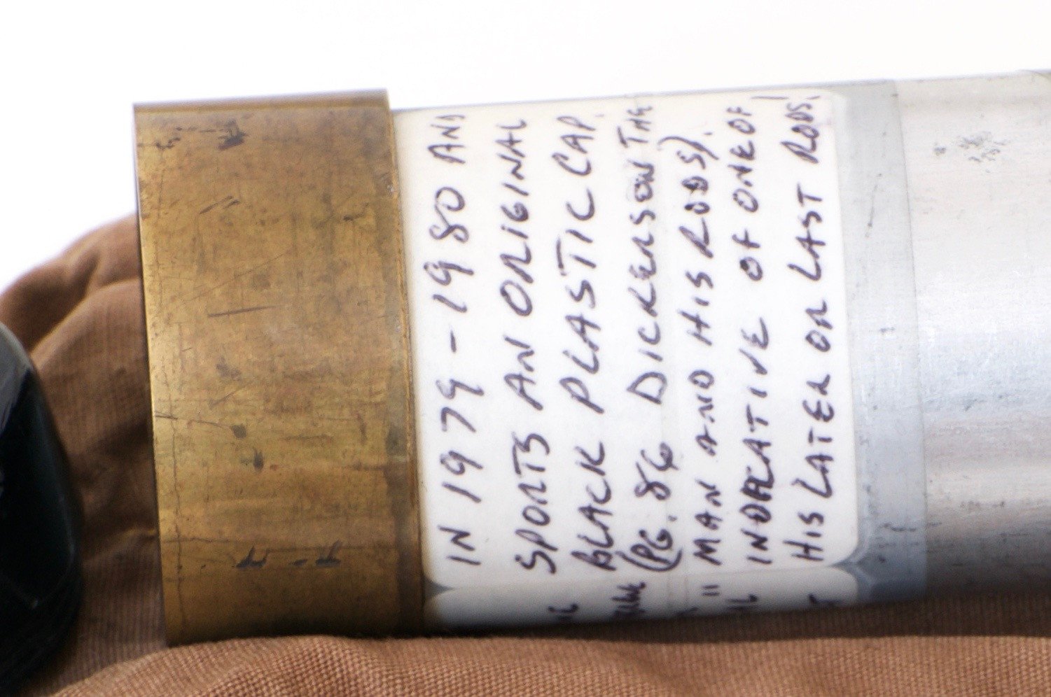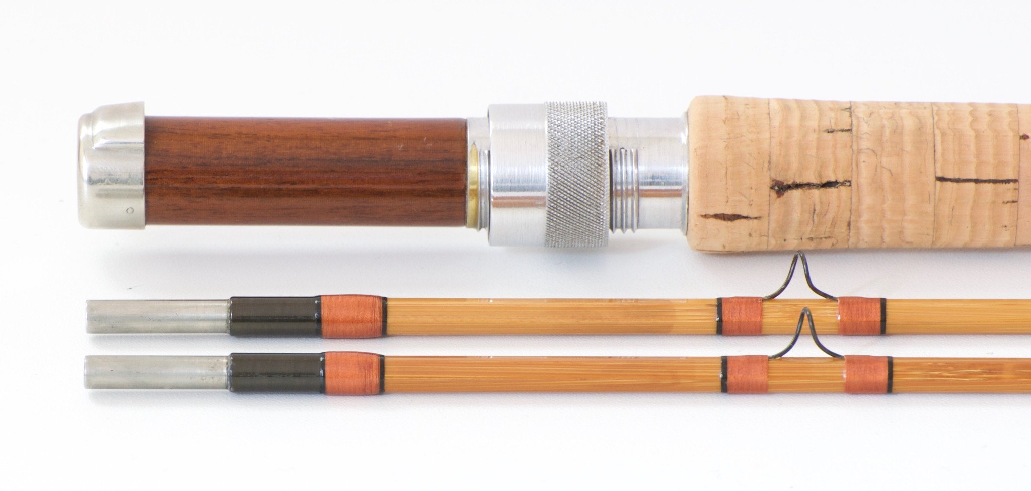 For sale here is a late-era Lyle Dickerson Model 7613 for a five weight line. The rod is in excellent+ refinished condition. Jim Schaaf likely performed the refinish and the writing matches other rods that Schaaf has refinished. All sections are full length and straight. The second tip was made at a later date, perhaps at the time Schaaf did the refinish. Rusty brown wraps with black tipping. Blued guides and ferrules. Loop-style hook-keeper. Reverse half wells grip has been cleaned and is slightly ridged. Down-locking reel seat and walnut spacer. the seat and spacer are in wonderful original condition. Ferrule size 13/64. The fit is perfect. The rod weighs 3 7/8 oz. The action is medium fast. Includes original bag and tube.