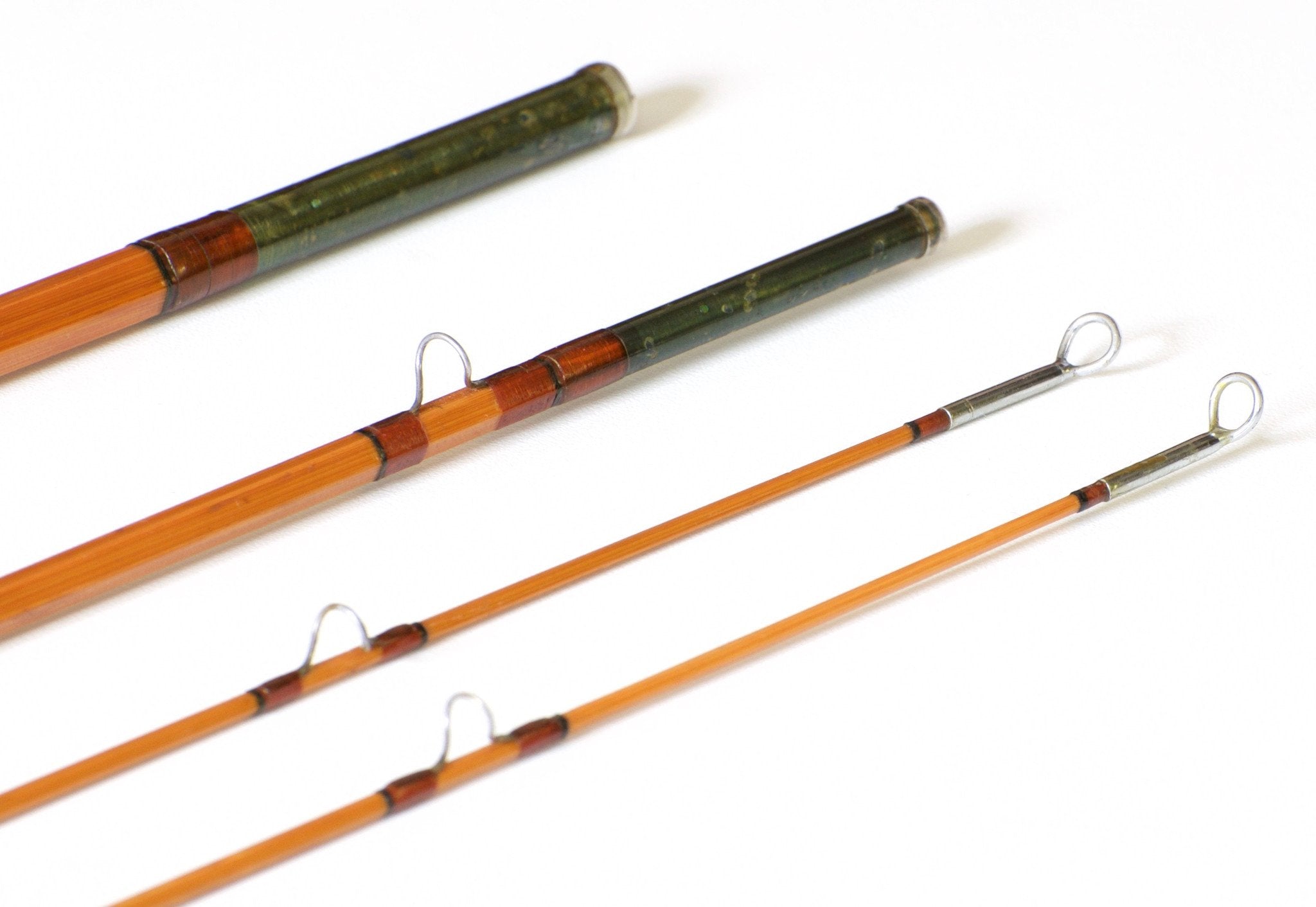 For sale here is an extremely scarce Lyle Dickerson Model 801610 bamboo rod. 8', 3/2 for a 5 weight line. Built in 1956. Excellent condition. All sections are full-length, straight, and of equal length. The rod weighs 4 1/2 oz. Payne-style grip with down-locking hardware and walnut insert. Oxidized nickel silver ferrules with oxidized guides. Classic 3x3 Dickerson node pattern. The ferrule fit is excellent. The grip shows some very minor ridging. The varnish is fine - no issues that need to be addressed, but it does show fishing use. The rod comes with its original bag and tube. Affixed on the tube is the original mailing label from Dickerson from 1956 addressed to the owner as scripted on the rod. Steve Blake re-wrapped a couple of guides on the mid-section, otherwise the rod remains in all original condition. The action is on the medium side of medium fast. An outstanding all-around trout rod in three-piece format!