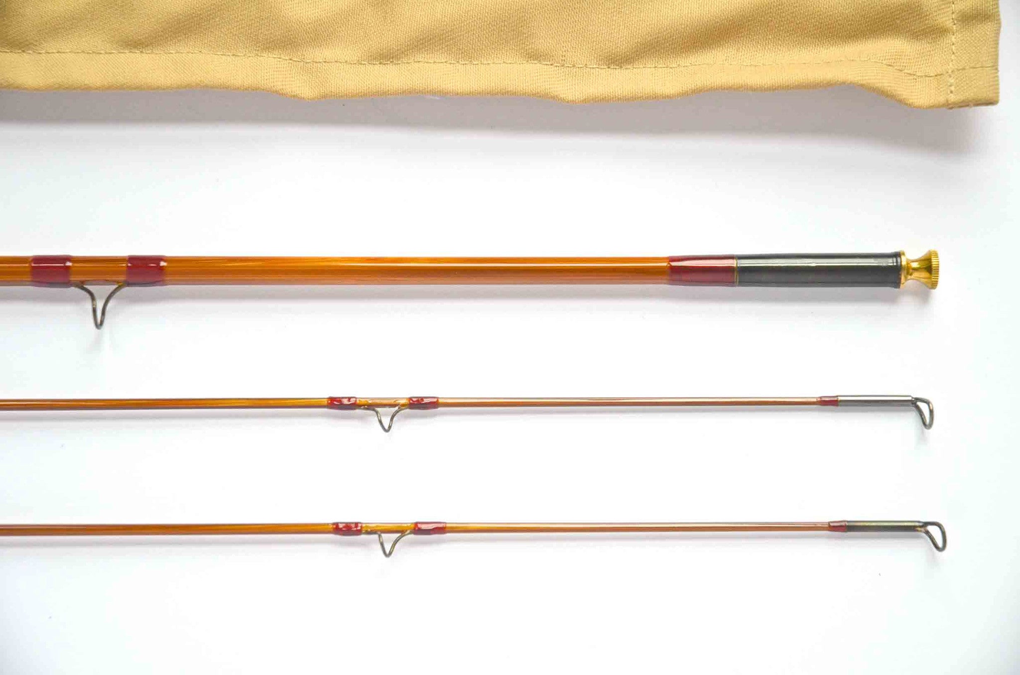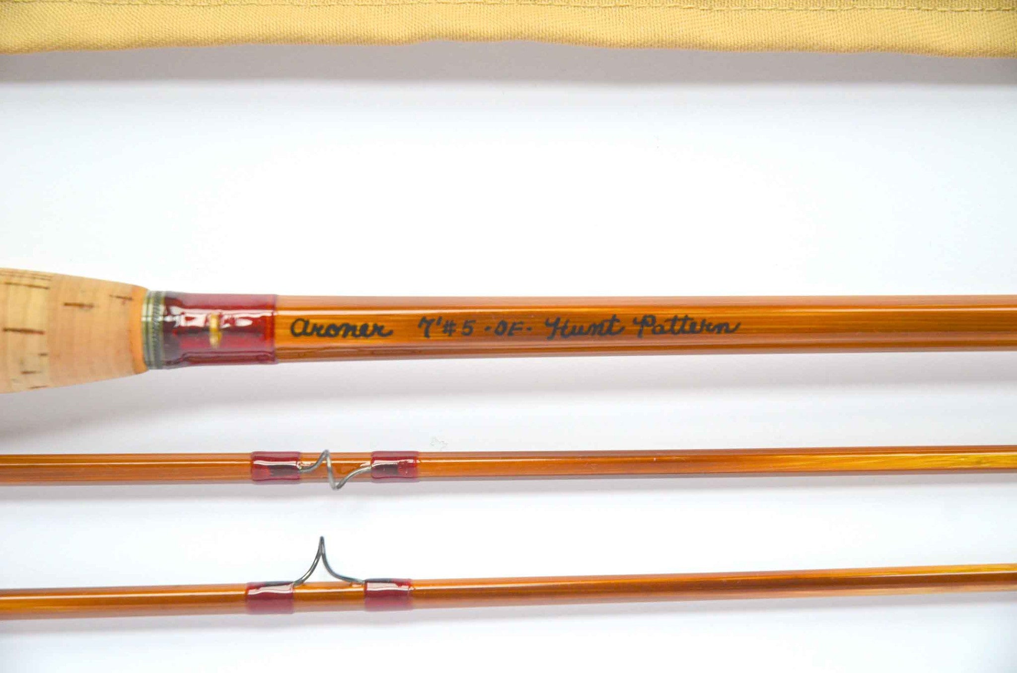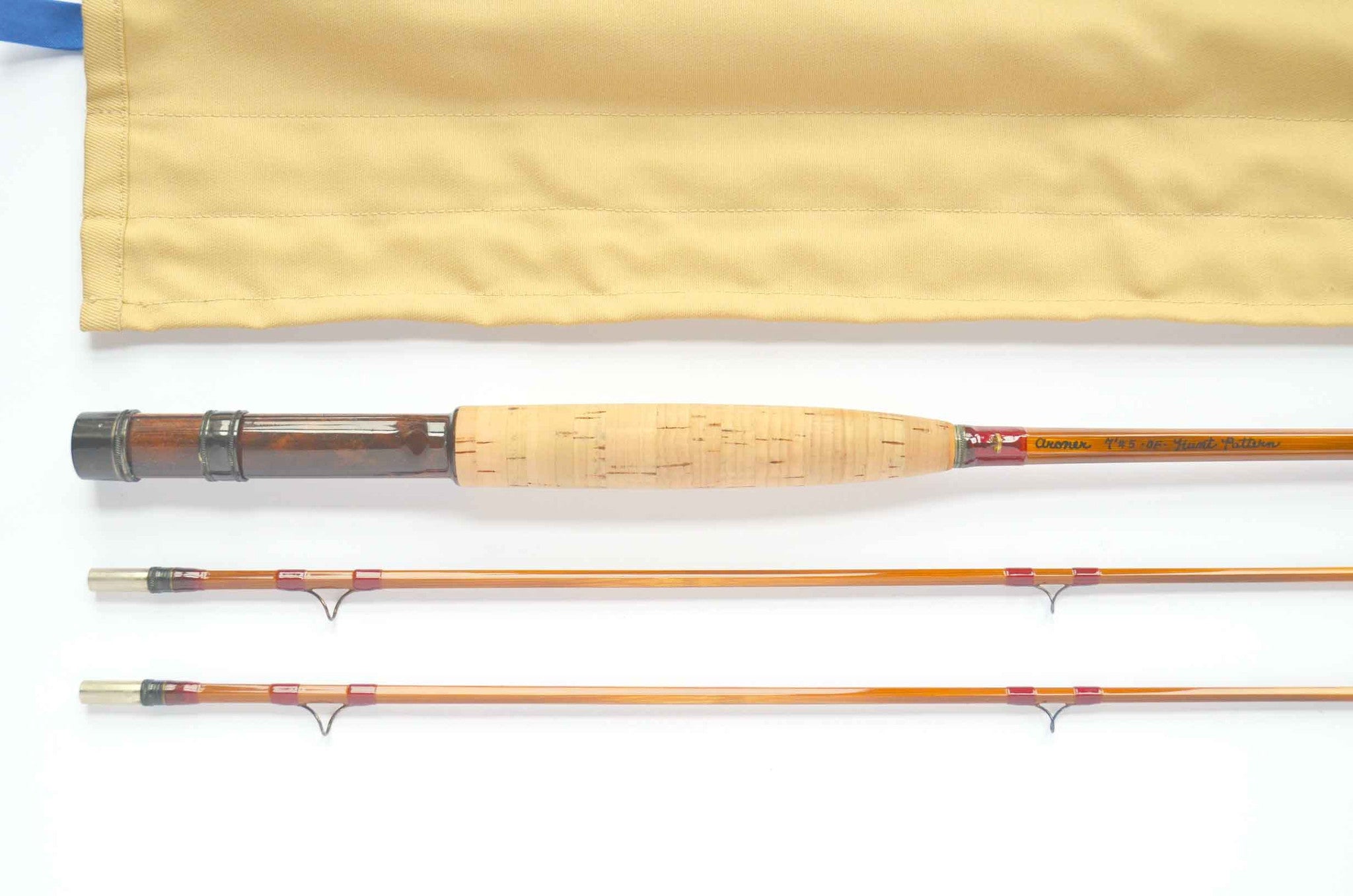 Fresh in on consignment is this 7' 2/2 #5 Hunt Pattern in lawn-cast only condition. This is a very early 1980's rod with a wood lip to the cork diameter and no roller die stamp. It is signed "Aroner 7' #5 DF Hunt Pattern". The reel seat has a mortised burl walnut spacer under an oxidized cap and ring. The wraps are done in "may rose" pink silk with barely visible orange edges. The rod has a hook keeper and the ferrules are my truncated swiss (oxidized). The tips are mirrored, the sections perfectly straight, and the varnish is flawless. The bag and polished brass cap tube are correct for the period. I've added an updated brass-and-cork ferrule plug for the female on the butt section. The only signs of use on this rod are a speck of rub wear on the butt cap and a little bright patch on the inside of the guides. This is the earlier faster action rod, as I would later changed my 2-pc design to a more moderate action in order to offer a wider range of taper options. You can click on the photos to the left to see more detail.