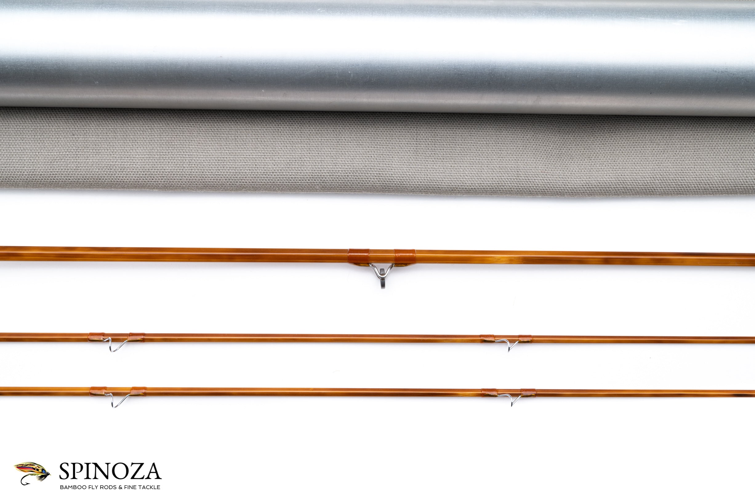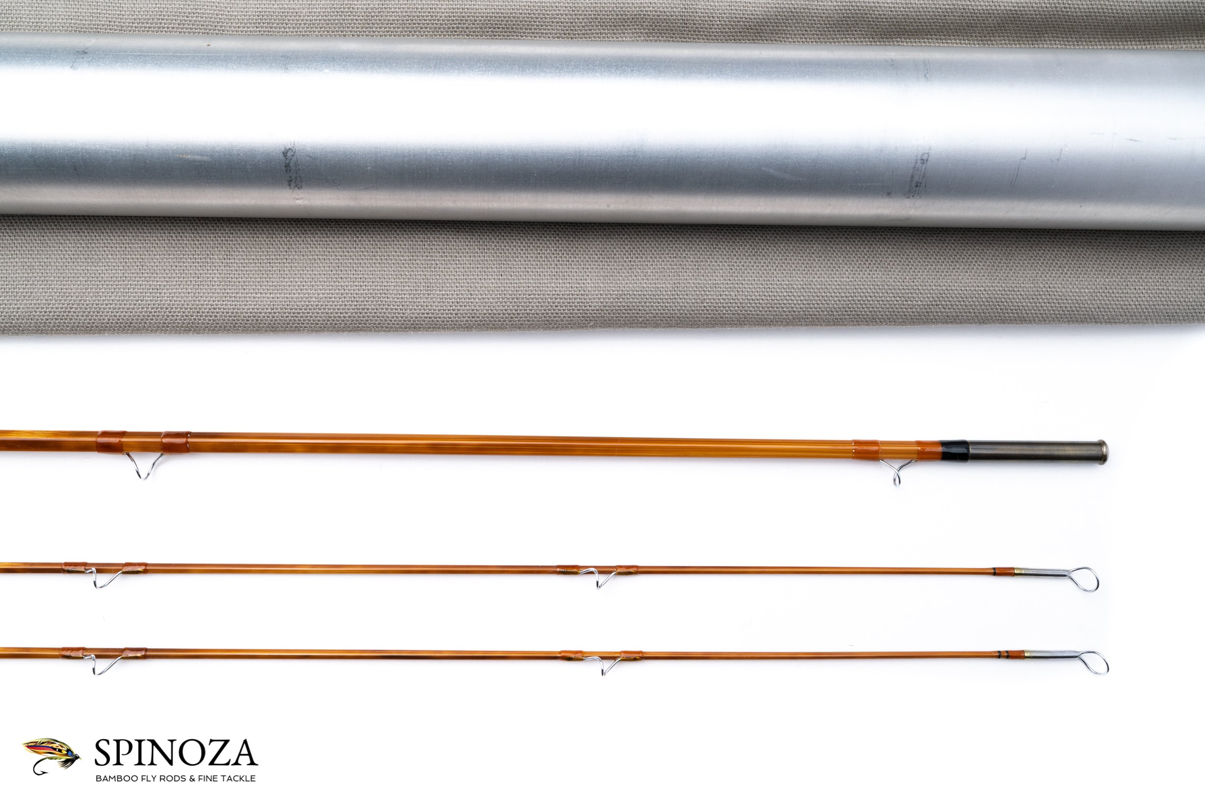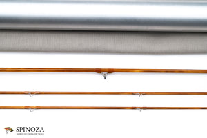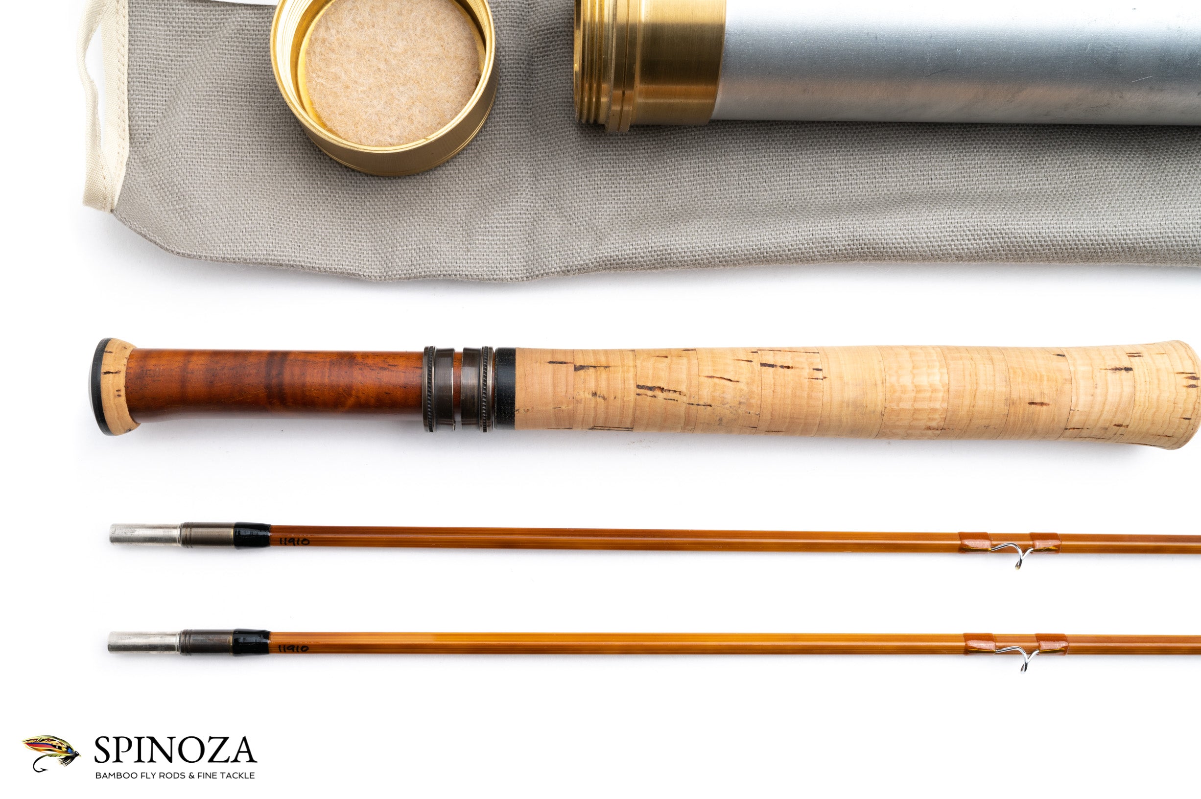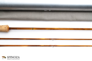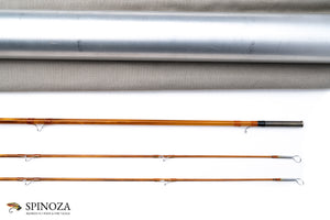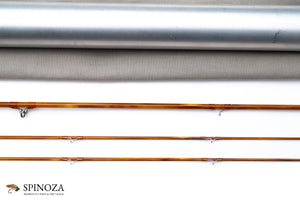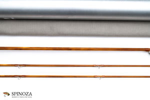 A nice Mario Wojnicki fly rod, 6'9", 2-piece, 2-tips, and built for a #4 or 4 line. Pentagonal constructions with a very slow, deliberate action. Model 205P4 and serial #11910. Weighs 2.5 ounces. It appears to be in mint condition, likely lawn cast at most. Full flexing. Flamed cane with a slightly mottled look. Very light tan wraps with black edges, and black at the ferrules. Nickel silver step ferrules are oxidized. The stripping guide is a carbide SRMC and all of the snake guides are chrome. Very nicely done varnish coat. The grip is 5 1/2" long and in a half wells configuration with the heel of the grip slimmed down almost to the reel seat dimension. A band of black composite material acts as a rear cork check. The seat has 2 small opposed rings and the wood looks like Koa. The base of teh seat is flared cork and the same composite material is used for a base plate. The rod bag is grey cloth with drawstrings. The aluminum tube is sanded and the brass top has a white flat insert with the model number stamped in the top and the collar is engraved with "M. Wojnicki, Maker".