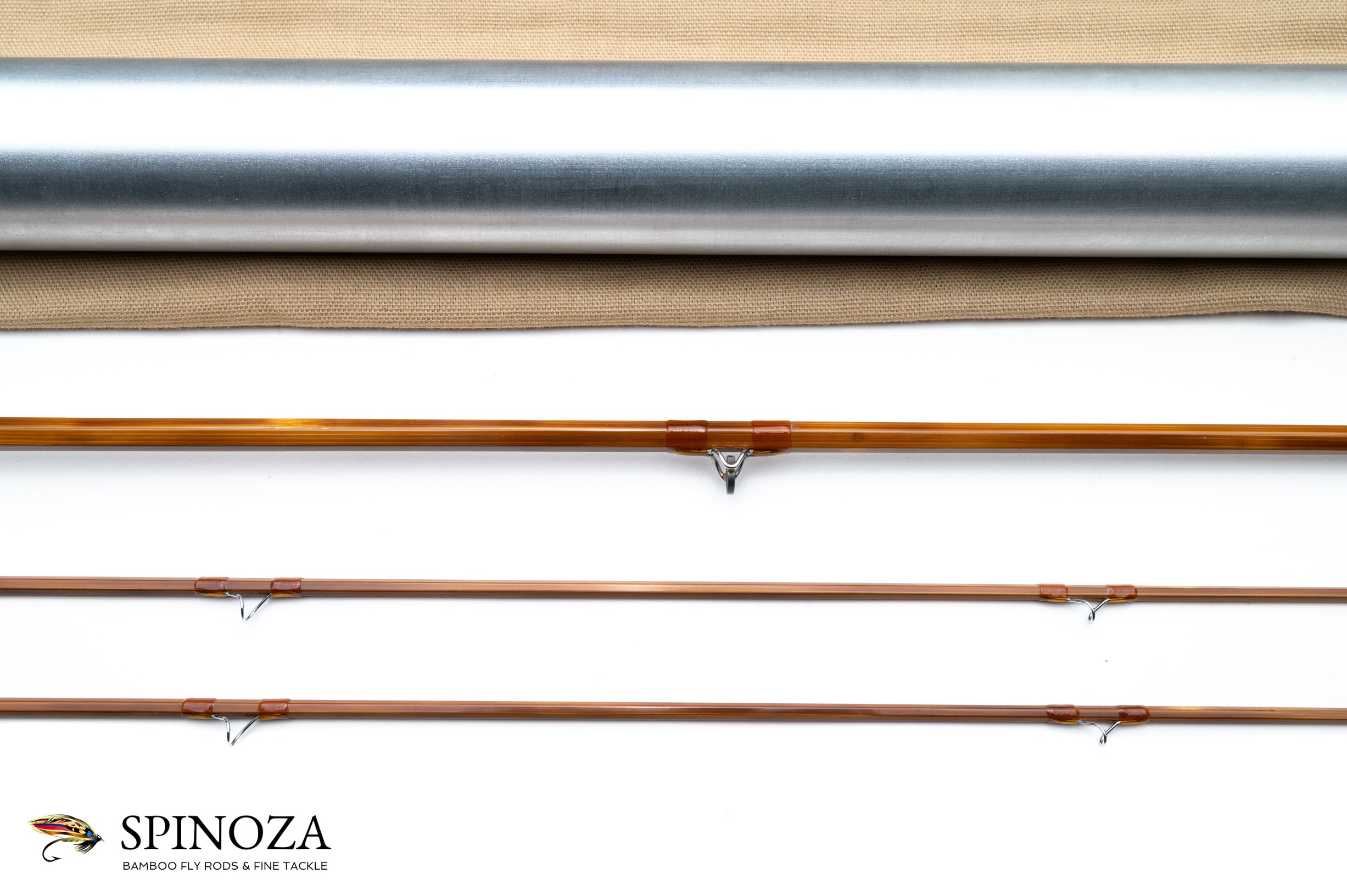 A Mario Wojnicki model 225F4 bamboo fly rod, 7'6", 2-piece, 2-tip, and built for a #4 line. Serial #1715 and weighing 2.8 ounces. Semi parabolic action similar to a Paul Young. Mint condition. Varnished lightly flamed cane done in a two opposed node pattern. Apricot main wraps with black at the ferrules. #8 SRMC carbide stripper with chrome snakes and tip tops. Oxidized truncated swiss ferrules. The grip is 6 1/2" and resembles a pointed half wells. A small band of some composite material acts are the rear cork check and the reel seat is comprised of dual slide bands (I would suggest using a thick footed reel with this rod as the LRH Lightweight I use as a test standard has the rings running out of space up to the shoulder of the reel foot). The rod packs in a tan bag and comes with a brushed or sanded aluminum tube with brass fittings.