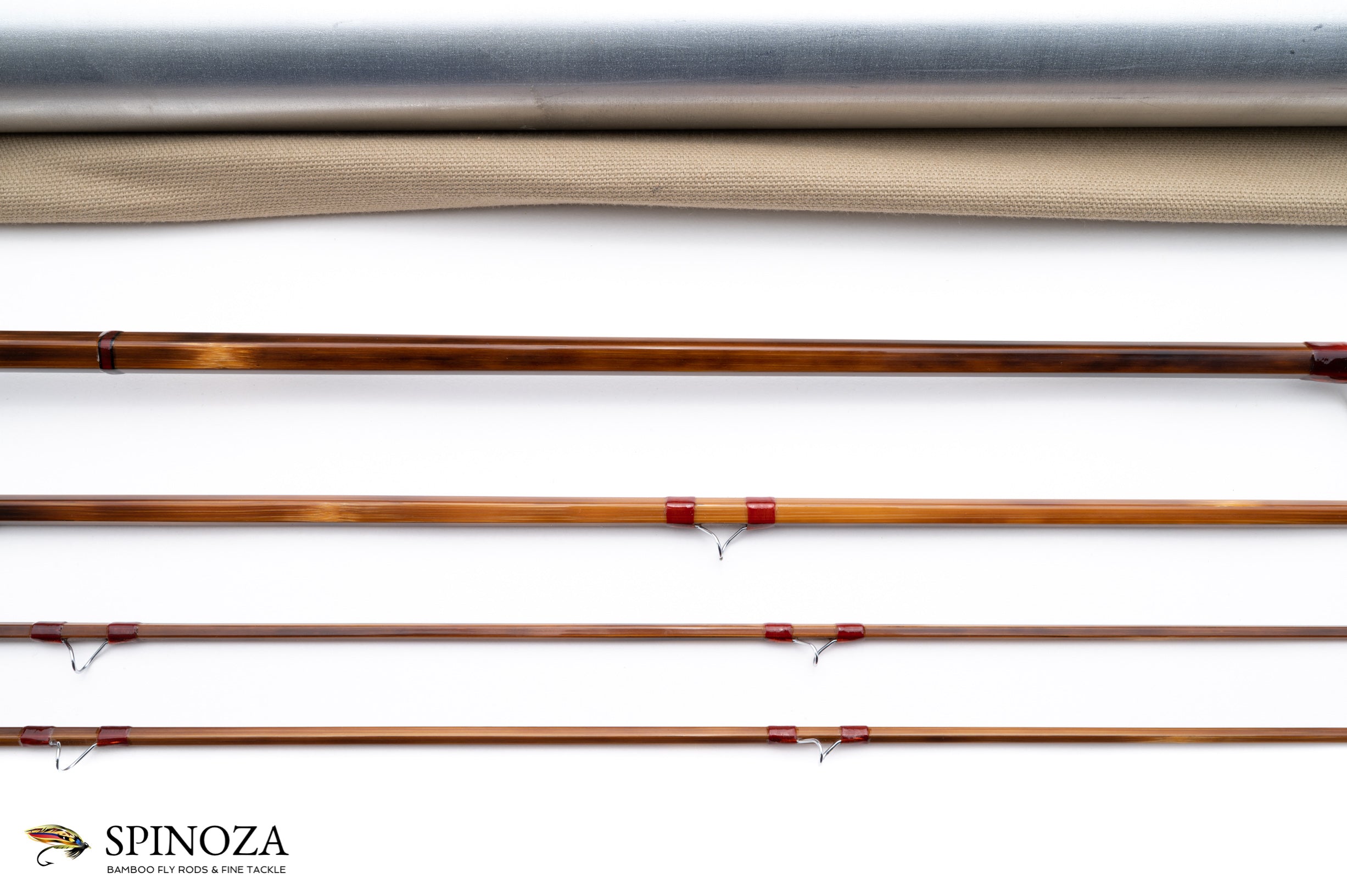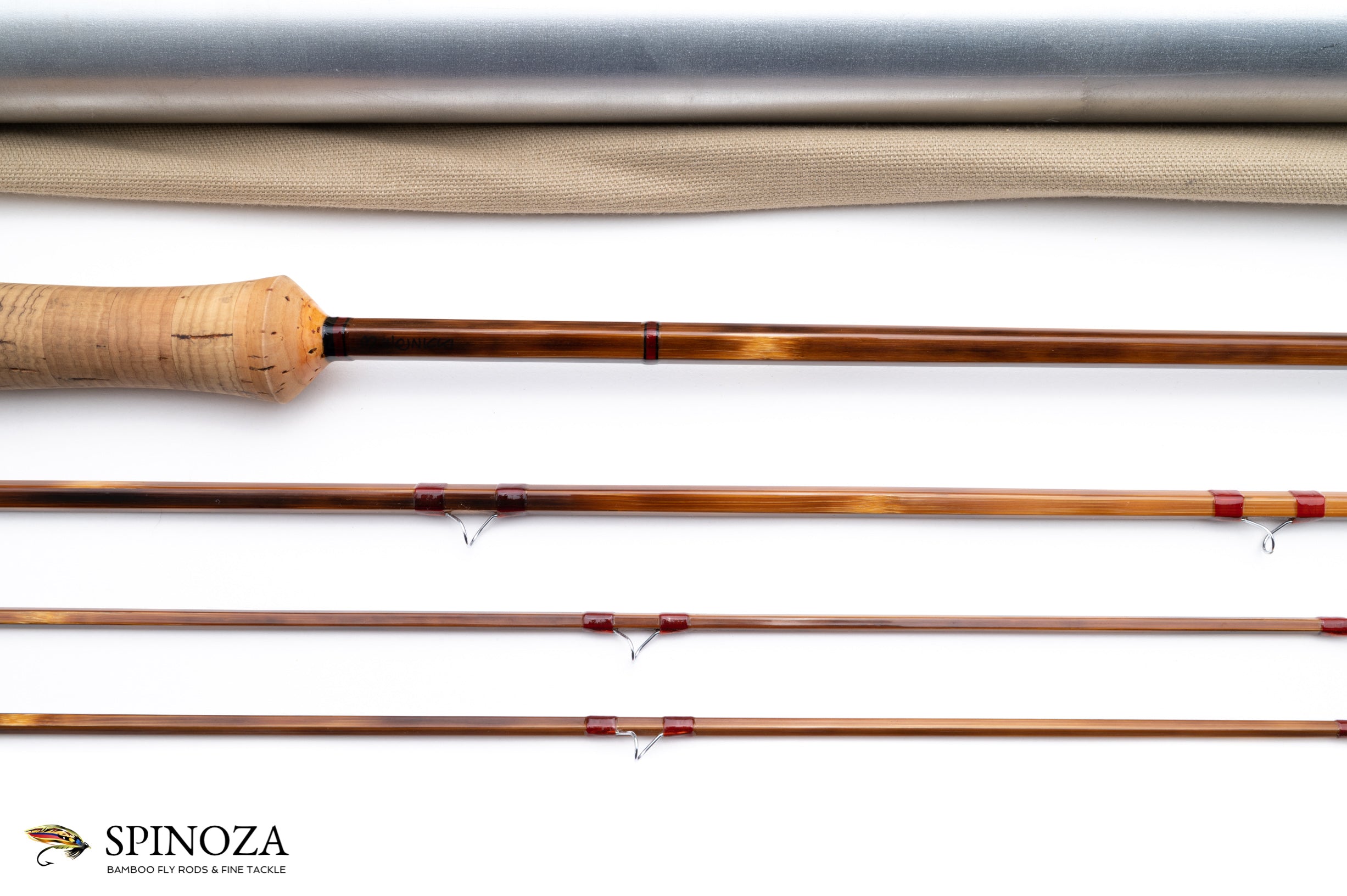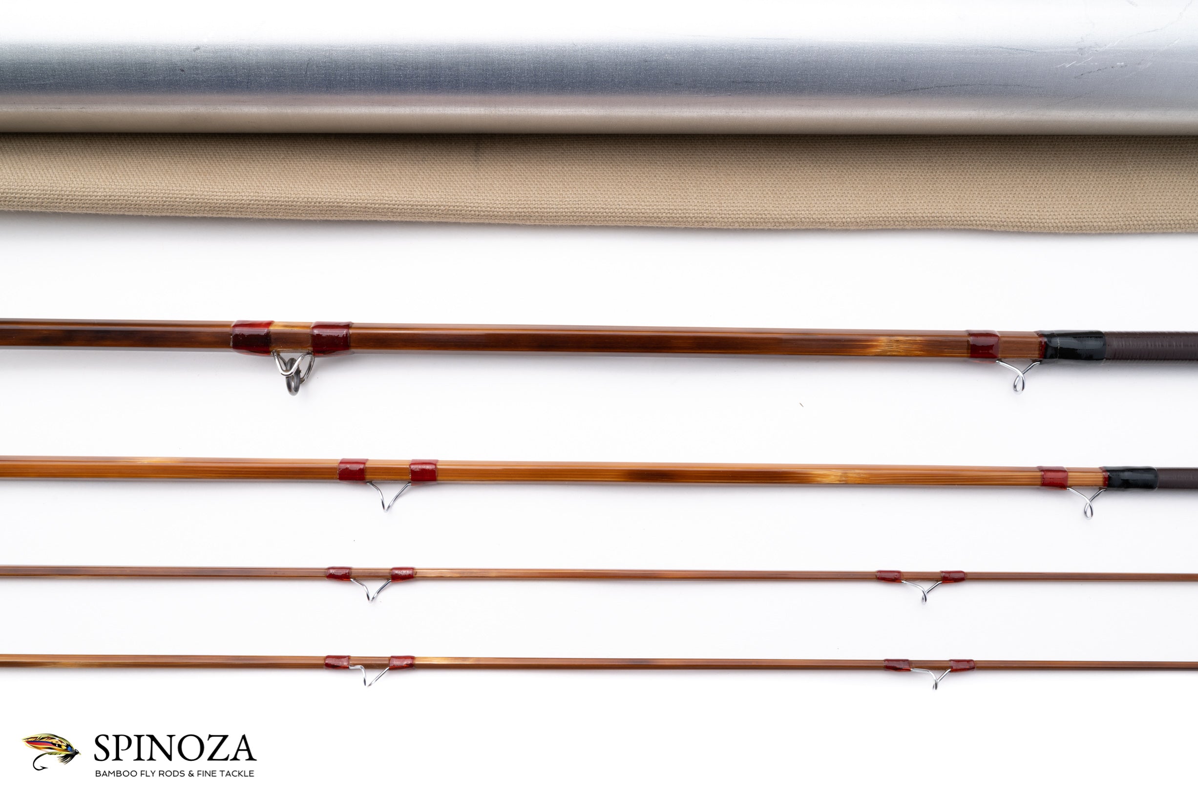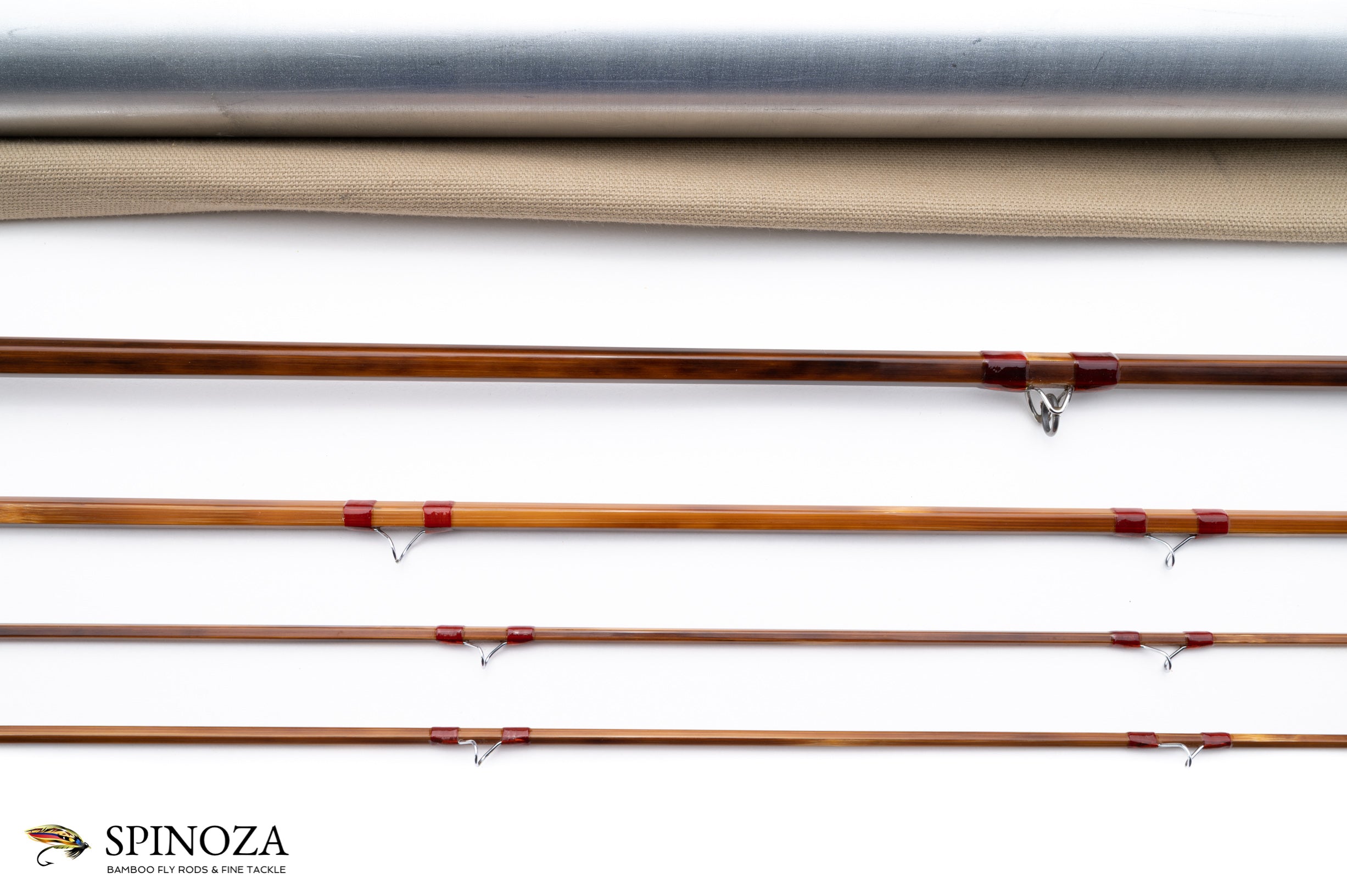 A Mario Wojnicki 245GF bamboo fly rod, 8', 3-piece, 2 tips, built for what feels like a #5. Pentagonal design with fiberglass ferrules. Good used condition with some minor soiling to the grip. One of the quick feeling actions from Mario. Flamed cane. Red wraps with black edges at the keeper and tip tops, and black wraps at the ferrules with red edges. Carbide stripper and chrome guides. Excellent varnish finish. 6 3/4" grip in a variation of full wells. From a large flare at the front it tapers down and swells again in the middle, then tapers down again with a slight flare at the heel of the grip where there is a hidden pocket cap. The reel seat is a lovely walnut (I think) that's nicely varnished and built to function as an upsliding ring and hidden pocket cap. A cork and wood bottom cap prevents the ring from falling off. The rod packs into a tan cloth bag with tie strings. The aluminum tube is stamped on the brass top "245GF".