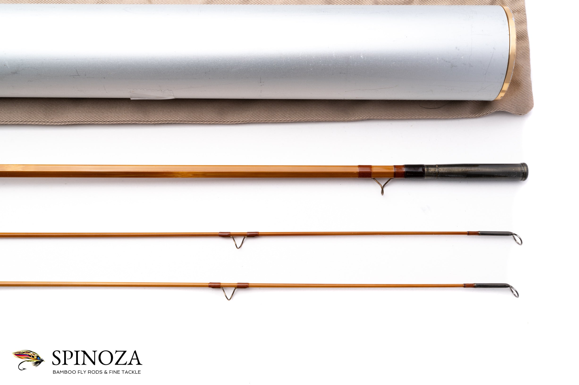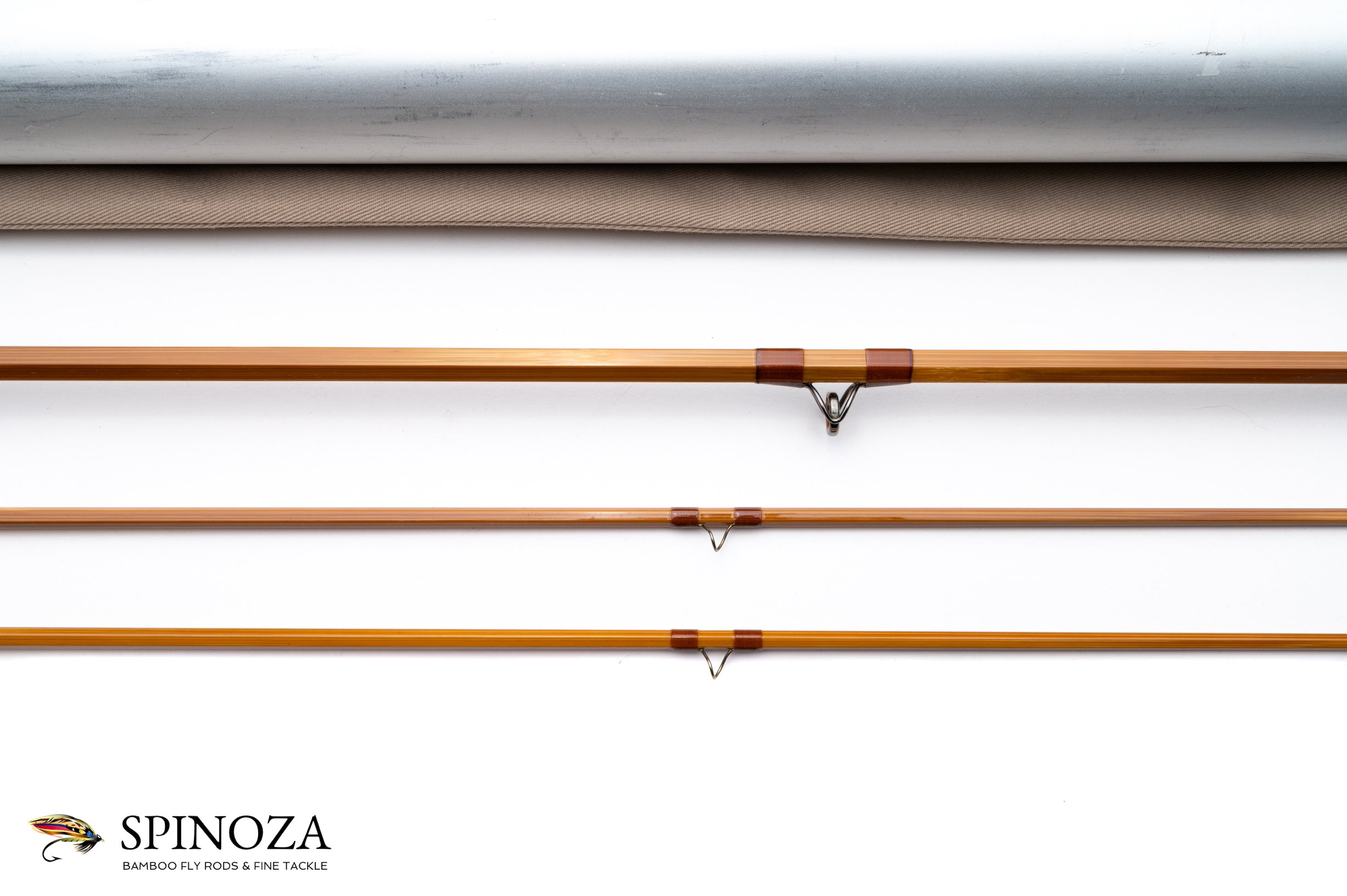 A nice Marty Karstetter bamboo fly rod, 8'3", 2-piece, 2-tip,and built for a #4 or #5 line. Serial 13708. The rod weighs 3 1/2 ounces. Hollow built. Super light use, with no soiling to the grip and just a hint of brassing to the interior of the snake guides and the beginning of some slight ferrule cracking at the ferrule wraps. Very light flamed cane with two opposed nodes in a spiral pattern. Excellent varnish. The main wraps are light brown with darker brown edges and dark brown at the ferrules. The stripper is an orange agate and the snakes are black nickel snake brand. The ferrules are swiss style and oxidized. The grip is 6 1/2" long and styled to a half-wells profile. The cap and ring seat sports a stabilized walnut spacer and the cap and ring have been oxidized. The butt cap is stamped “Marty Karstetter” and has a few minor dings. The rod packs into a light tan bag and aluminum rod tube.