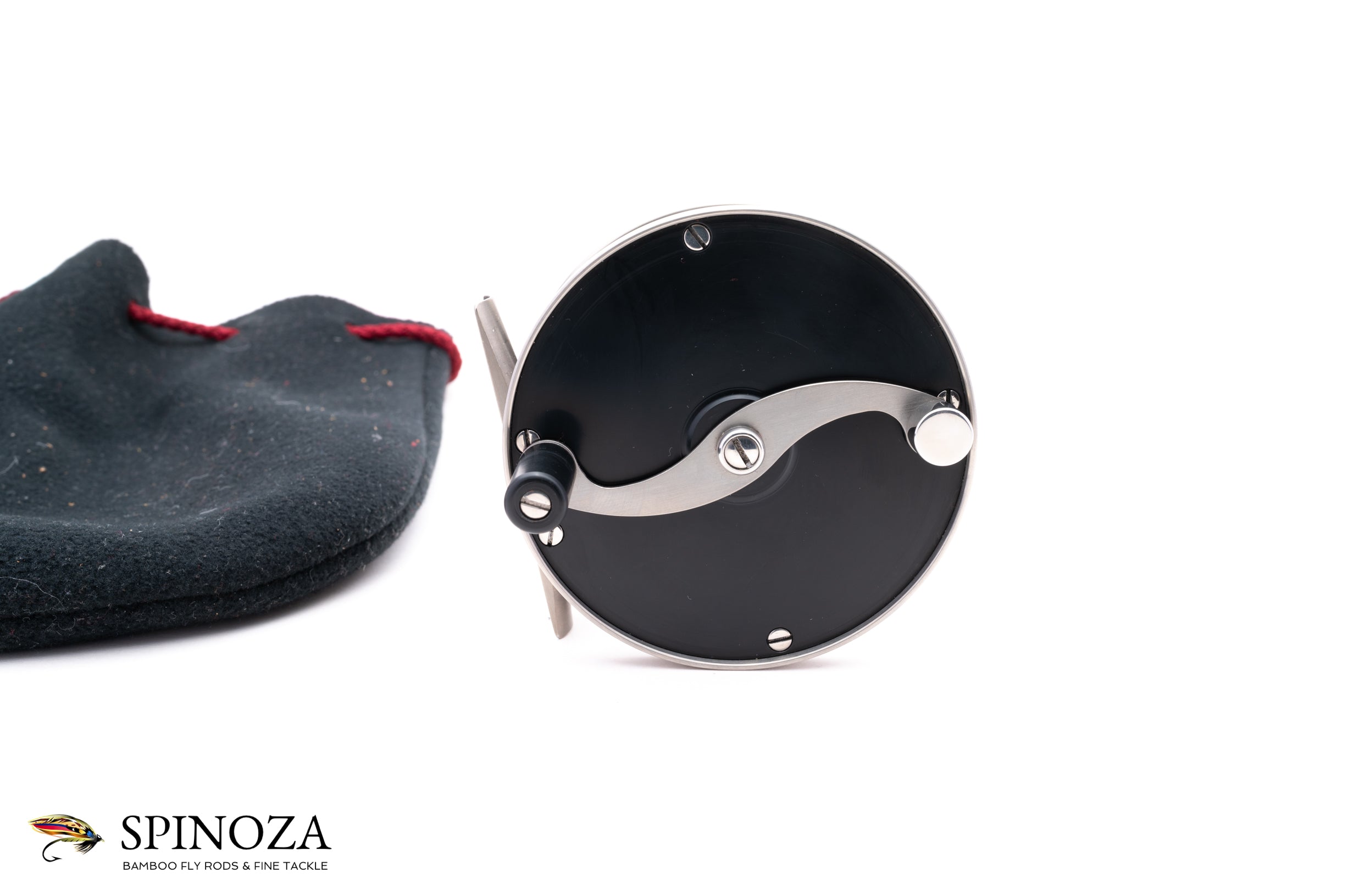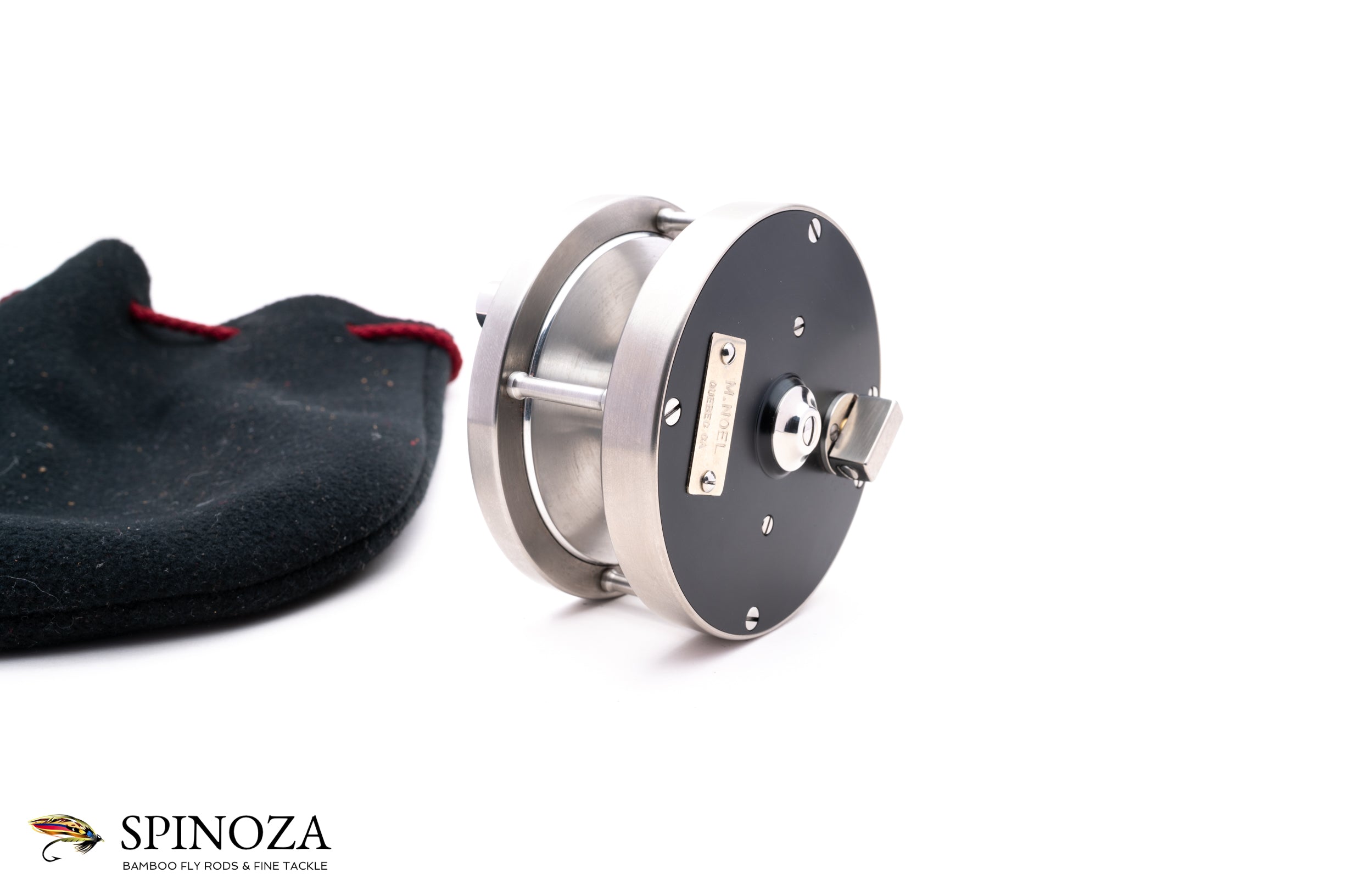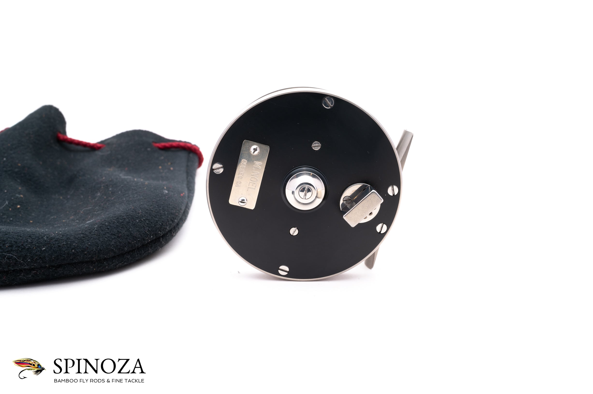 A very nice Maurice Noel TD150 titanium trout reel, 3" diameter and set up for LHW. The Model 150 is built for lines in the #5-7 class, and the reel has a spool width of 1 1/8". It weighs 6.5 ounces on my scale. Near mint condition, with just a few very tiny cosmetic signs of use. It couldn't have been fished much at all. Classic S-handle design, with the frame, handle, pillars, and foot all machined from pure titanium (the spool is polished aluminum). Black delrin sideplates. The drag is adjustable via a small knob on the backplate and the reels sports Mr. Noel's nameplate as well. Smooth click drag with a nice amount of stopping power when the drag is fully engaged, a rarity in reels of this size. Black handle. The reel packs into a black fleece drawstring pouch. Noel reels are very hard to come by, and getting harder all the time!