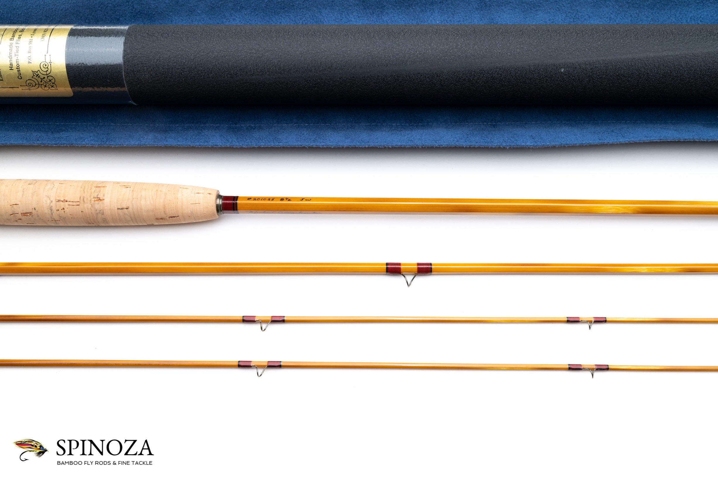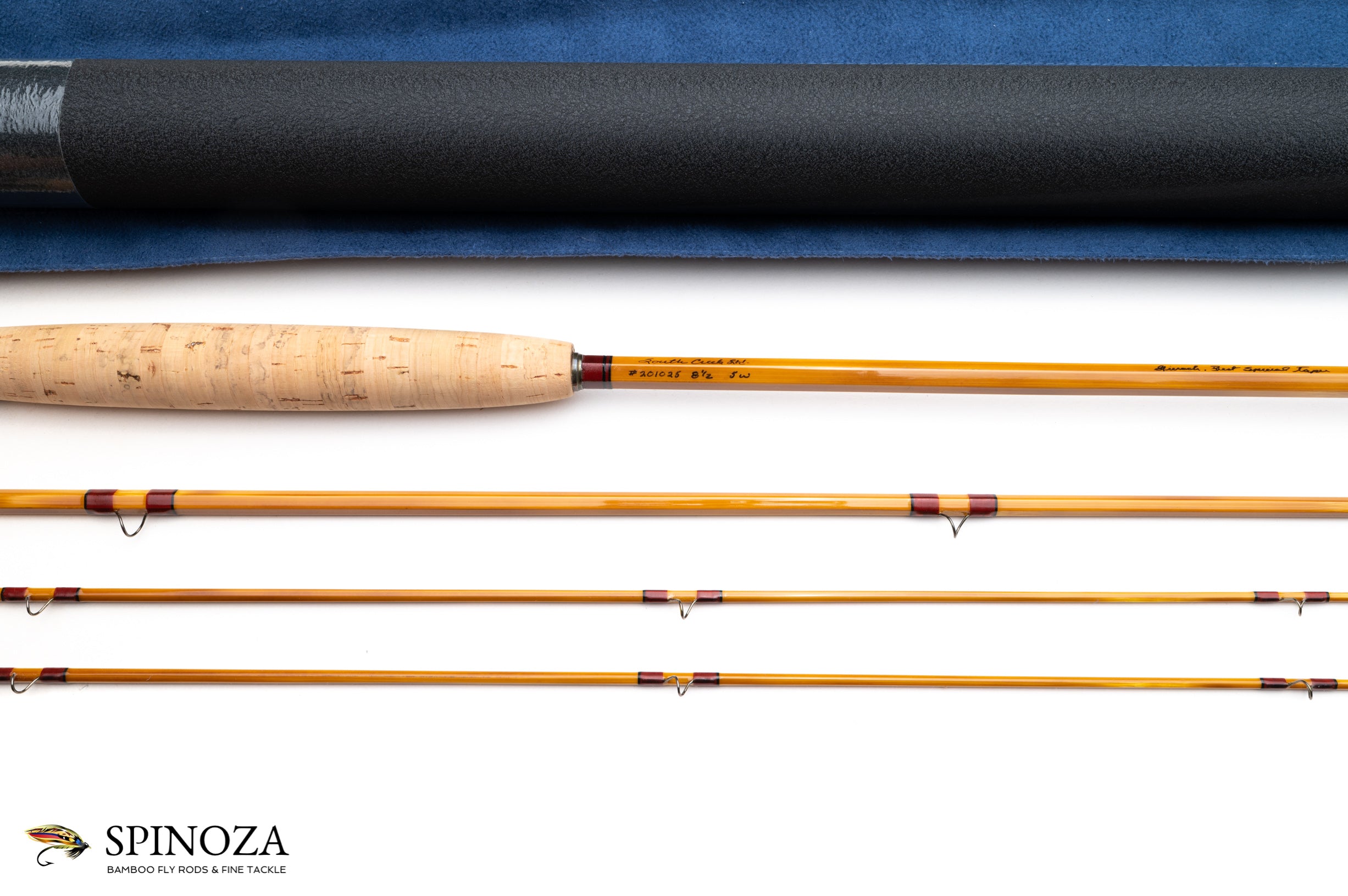 A nice Mike Clark (South Creek Limited) bamboo fly rod, 8'6", 3-piece, 2-tip, built for a #5. This is one of Mike's signature series "Gierach, Best Special Taper" models and has serial #201025. Medium slow action. 5.7 ounces. Mint condition. Light flamed cane with spiral nodes that are nice and small thanks to pressing. Maroon wraps with black edges. The stripping guide is a clear agate with red bands. Snake brand guides. Very nice varnish coats. The ferrules are oxidized super Z style. The grip is 6 1/2" long made from 1/4" corks and shaped to a medium cigar profile. The reel seat spacer is a varnished, mortised walnut. The seat hardware is a downlocking screwlock in nickel silver with ornate engraving on the nut, slide, and cap. "LPM" engraved on the bottom of the butt cap, which is the owner's initials. The rod bag is a blue cloth and the aluminum tube is painted black with brass hardware and has the south creek data sticker attached.