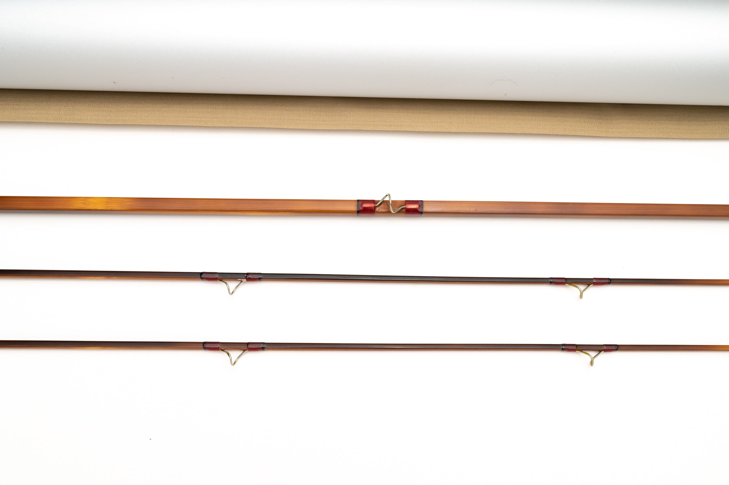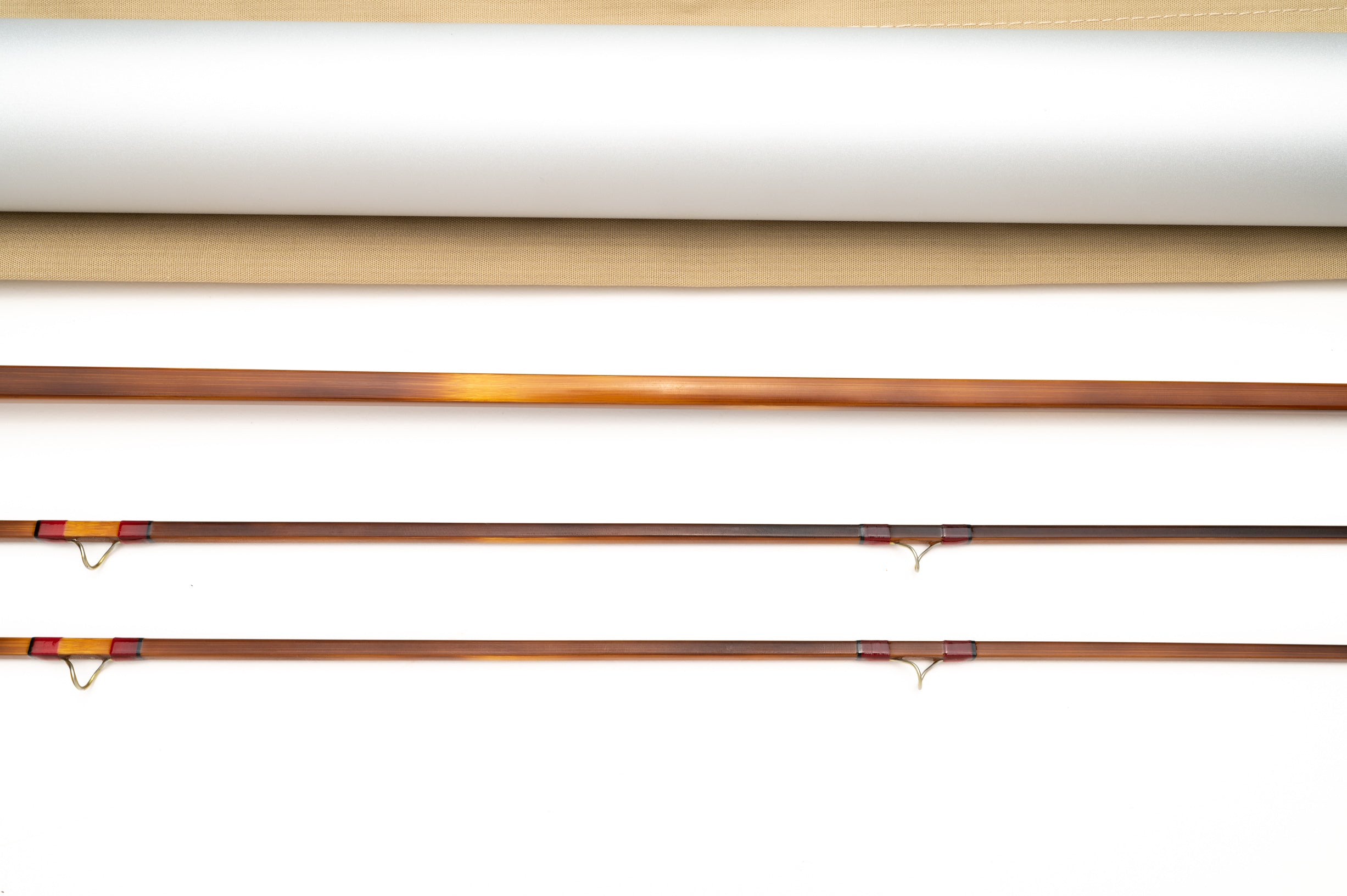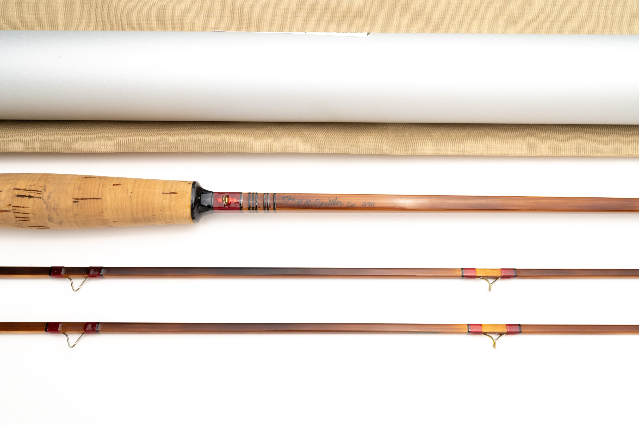 A splendid MK Spittler hollow-built quad fly rod, 8' 2-piece, 2-tip, built for a #4 line. Serial #390. Weighs 4.1 oz. Fast D.F. action. Near mint condition. This rod has just a hint of hand soiling on the grip and the start of a ferrule wrap crack at the female ferrule and one tip. Fluted hollow construction. Excellent varnish over flamed cane with a spiral node pattern. The wraps are red with black edges and a 3,2,1 set of signatures in black at the keeper. Red agate stripper and chrome snake guides. The keeper is on the wrap flat as well as the lettering "M.K.Spittler Co, 390". Stylistically this rod owes a lot to the Edwards Co. and Sam Carlson. The oxidized step ferrules are squared to fit over the bamboo. A front cork check that appears to be made of Delrin or perhaps Tennite? The grip is 6" long and styled as a "Western" with a hidden pocket cap under the heel of the grip. The seat itself is flatted cork with an up locking slide band. The seat finishes with a thin band of Delrin and a longer turning of cocobolo wood and another Delrin cap for the bottom. The ferrule plug is an aluminum and cork finial style like those of a Payne rod. Comes with a tan cloth bag with a pocket for the ferrule plug. The bag has an attractively styled logo label sewn on the pocket and the theme is repeated with a sticker fixed to the rod tube. A very pleasing package from a quality maker whose rods are hard to come by!