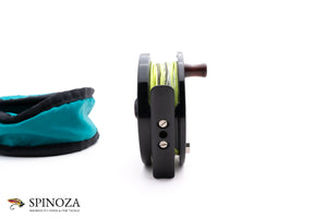 A nice Abel TR-3 fly reel, 3 1/4" diameter and set up for LHW. Made in the USA. Excellent lightly used condition with a few minor scuffs on the frame edges but very clean overall. The click drag is smooth and well-calibrated. Black anodized throughout with porting on the frame and spool. It has all of the signs of quality that Abel is known for. The reel comes with original teal nylon Abel pouch.