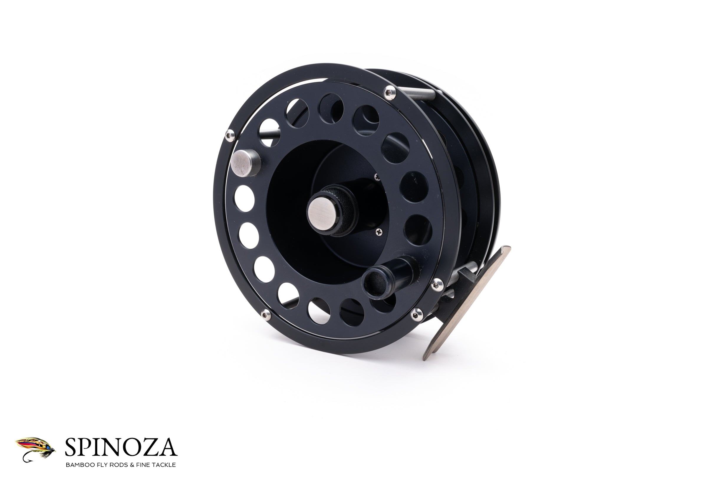 A nice Ari T Hart Large Arbor V reel, set up for RHW. 4 3/4" diameter with a 1 7/16" spool width. Large arbor design with a ported spool and three large ported holes on the backplate. Near mint+ condition with just one tiny nick in one spot on the frame. Given how clean the rest of the reel is I suspect it may have come from handling and that the reel has never been fished. A smooth powerful drag with a nice click in both directions. The frame and spool are black anodized throughout, with the logo and model etched in red on the backplate. Made in Holland. No bag. A relatively scarce Ari T Hart model.