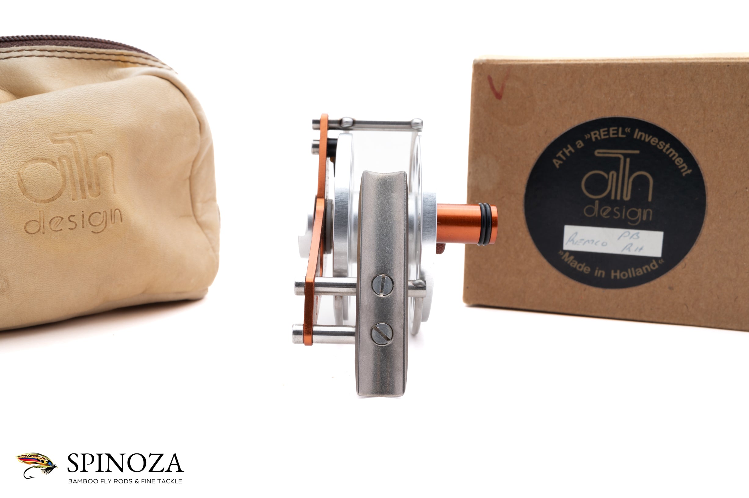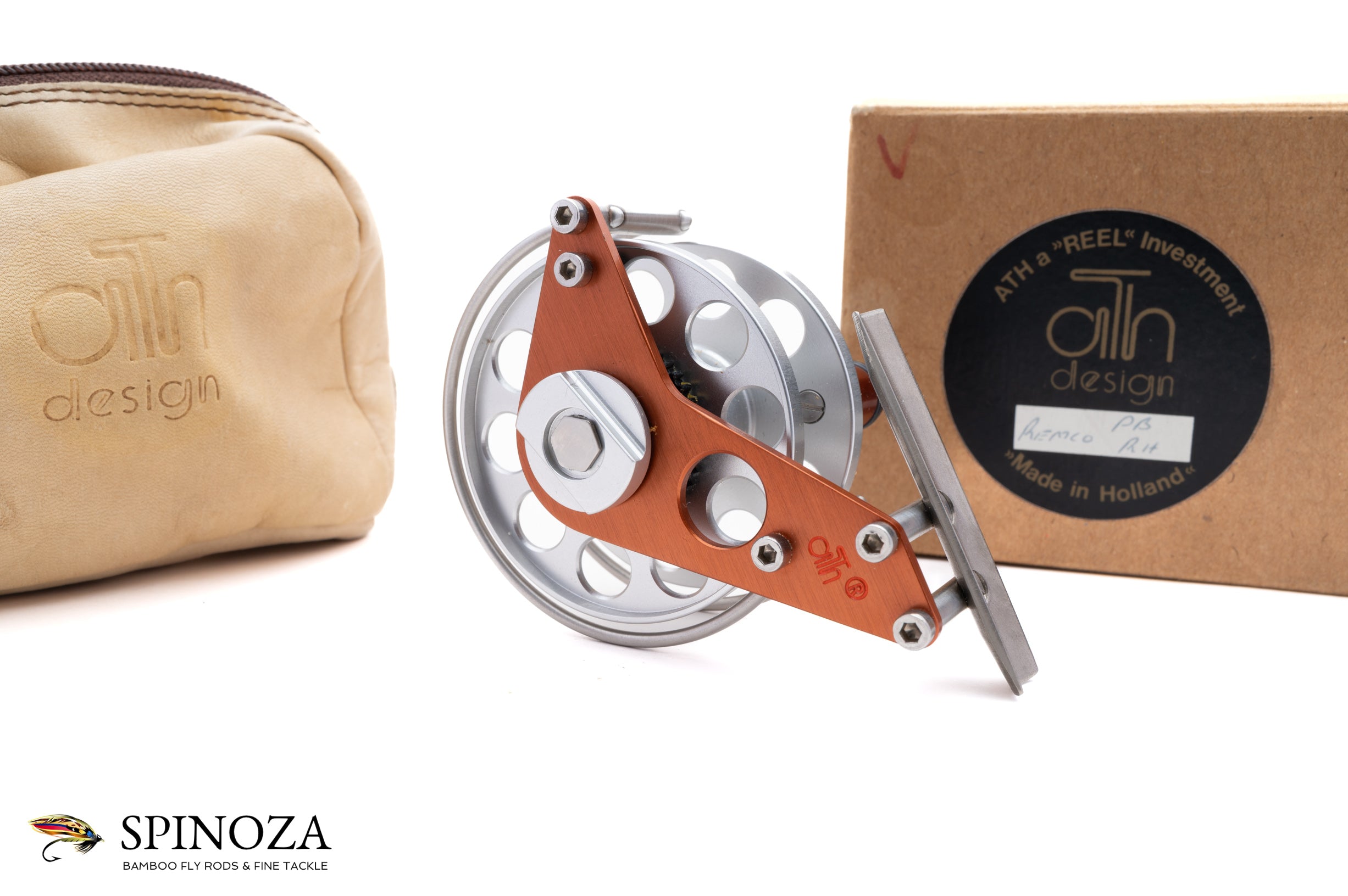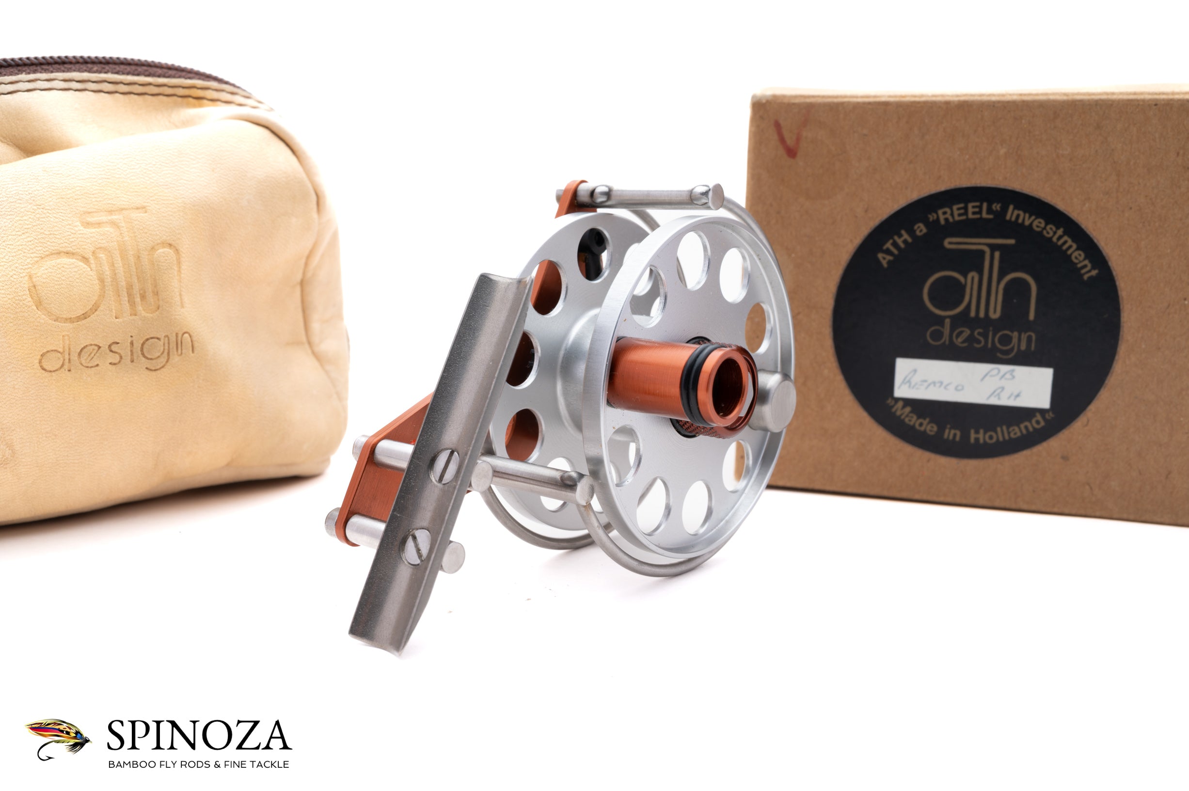 A superb Ari 't Hart Remco fly reel in the very desirable phillips braun / silver color combination. Made in Holland. The reel is set up for RHW and appears to be unfished. The adjustable drag works marvelously with a subtle inbound click and a louder outbound, and it can be set to a surprisingly strong drag level. The spool diameter is 2.4" with an inner spool width of 0.82" and weighs 4.6 oz. Designed to hold up to a WF4 + 80 yds 20#. The reel comes in the original ATH case and box, which includes a small paper care card. These Remco models are extremely difficult to find in this kind of unused condition and have a cult following worldwide.