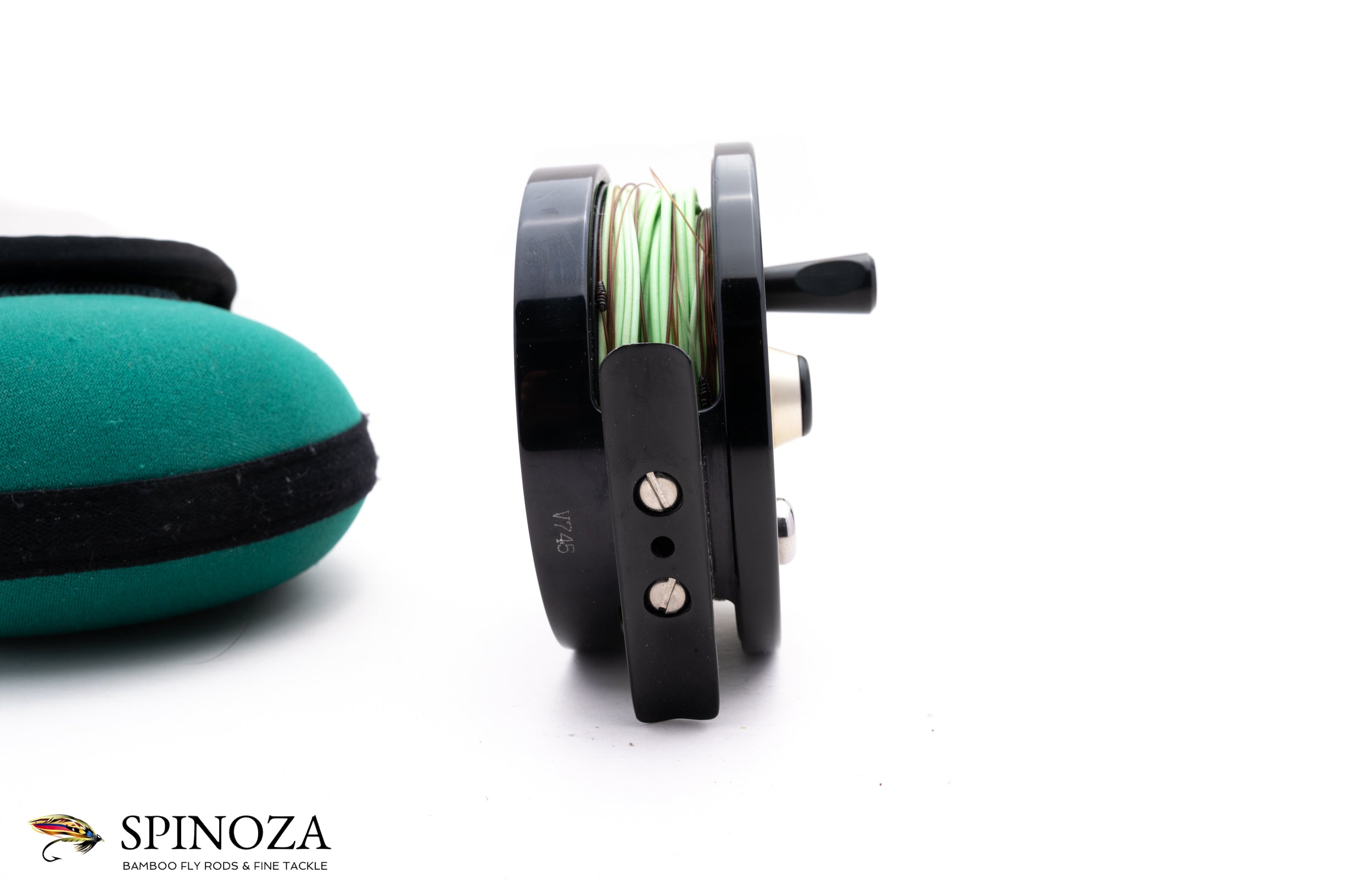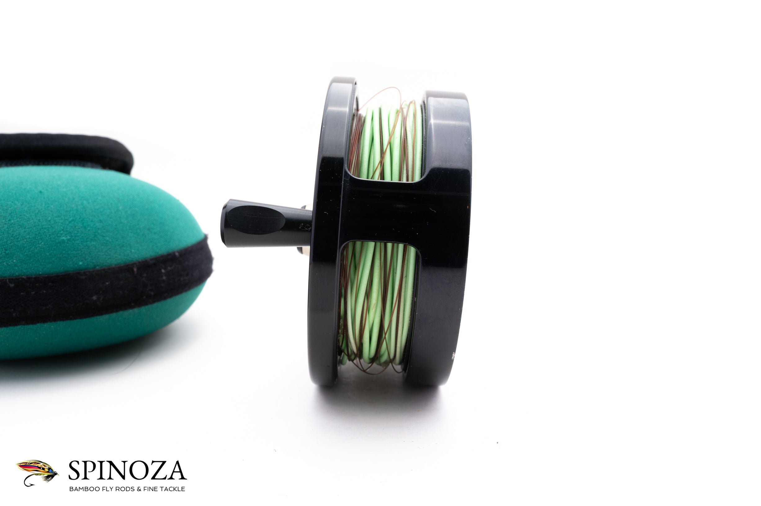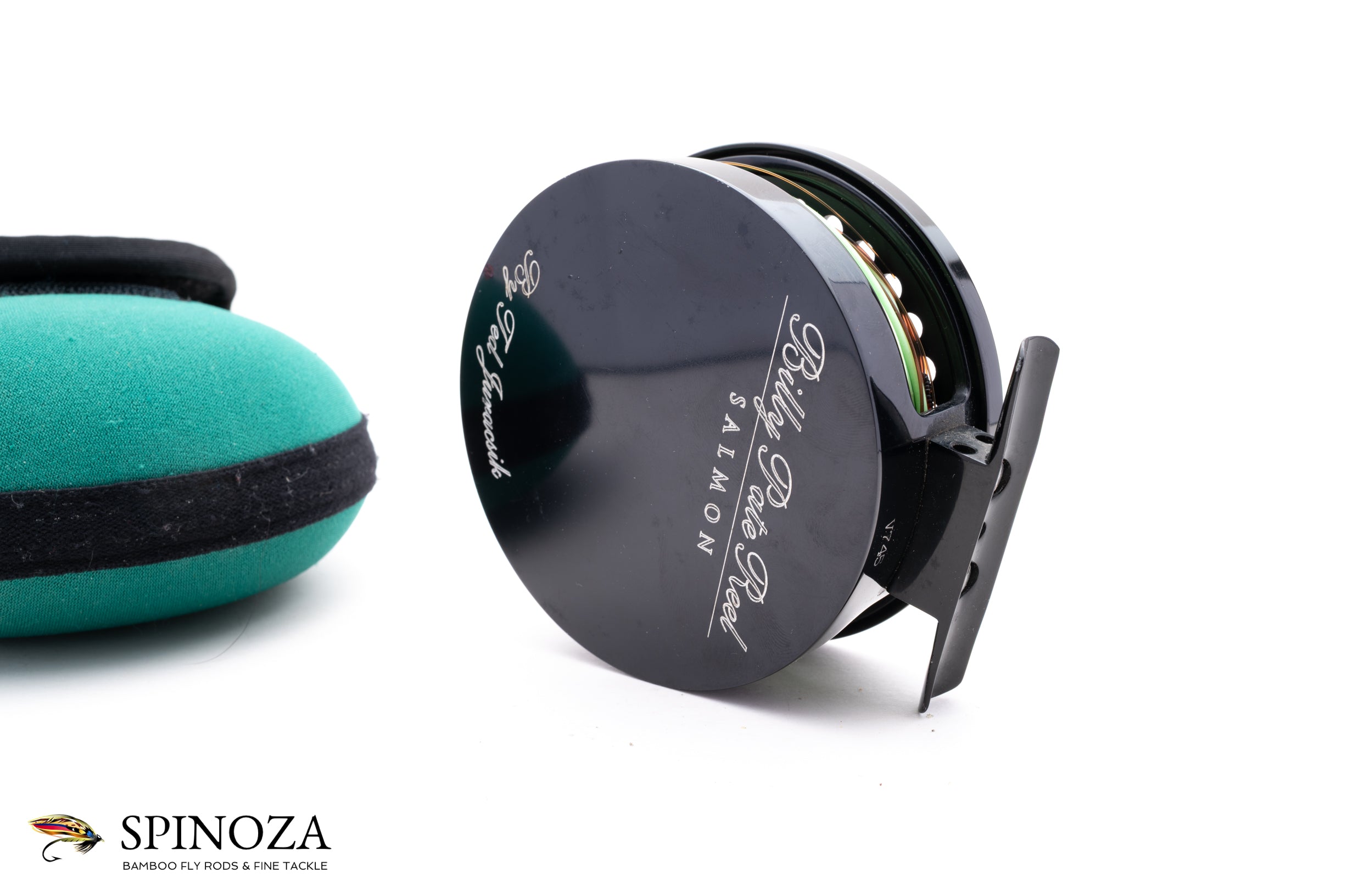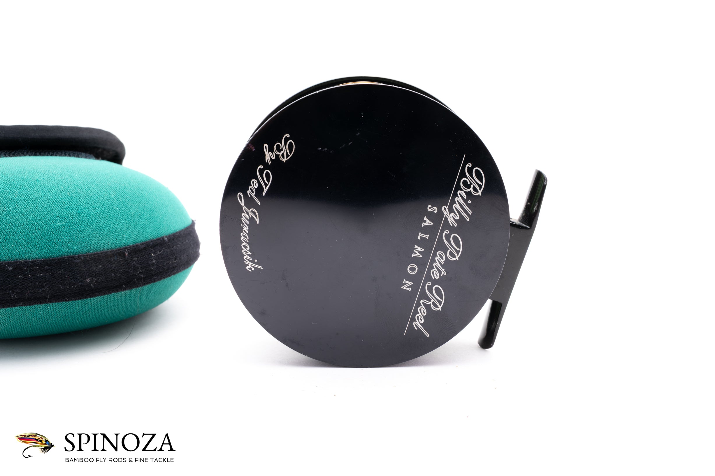 A nice Billy Pate Salmon direct drive fly reel, set up for RHW. Direct drive. 3 3/8" diameter with a 3/4" spool width. Good used condition with some rash on the frame edge and a nick or two but very clean otherwise. Black anodized frame with a black spool. Strong adjustable drag. The reel is currently loaded with a line and is designed to hold a WF8F+200yds of 20# backing. The reel comes in the original green neoprene case.
