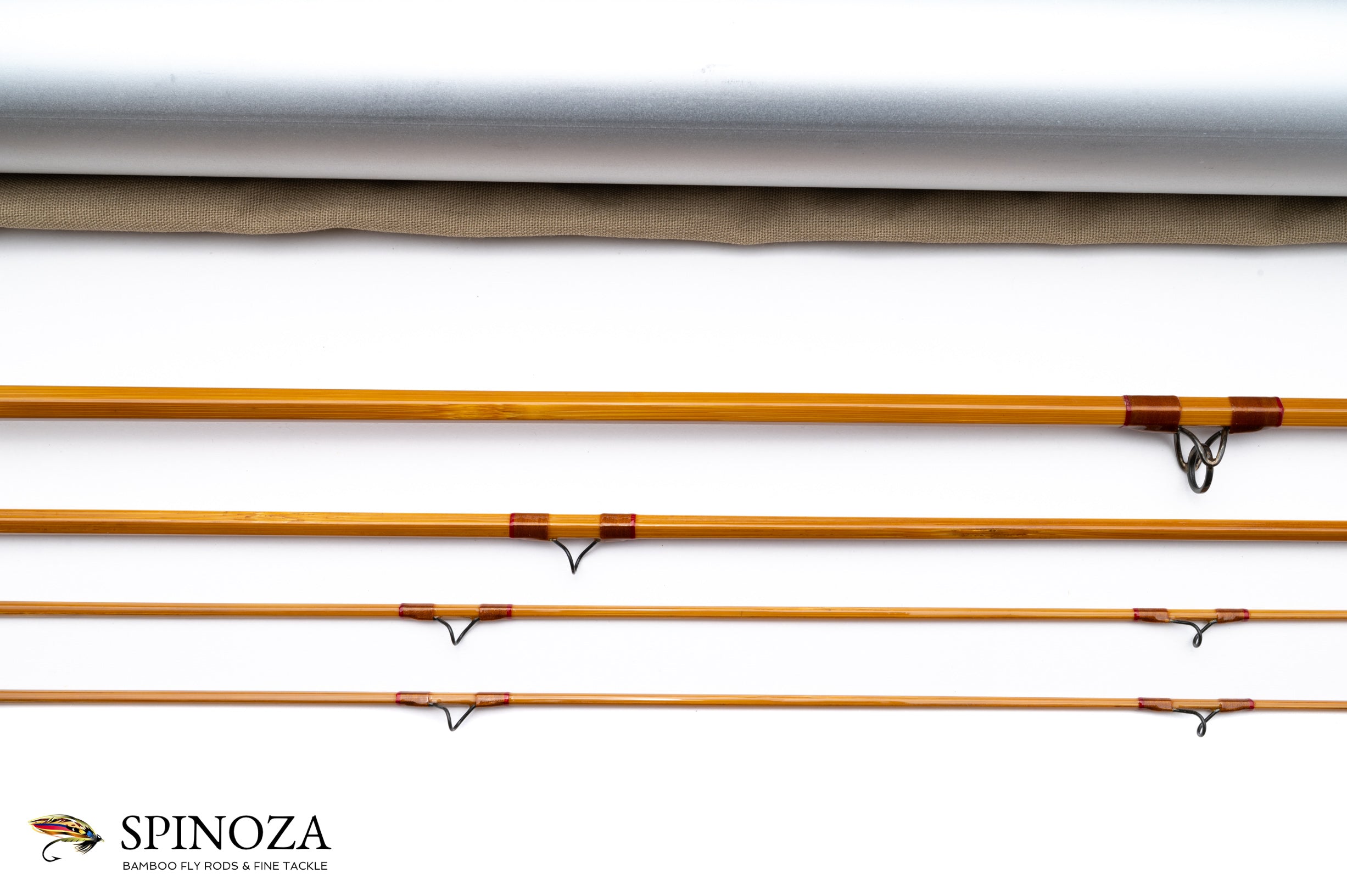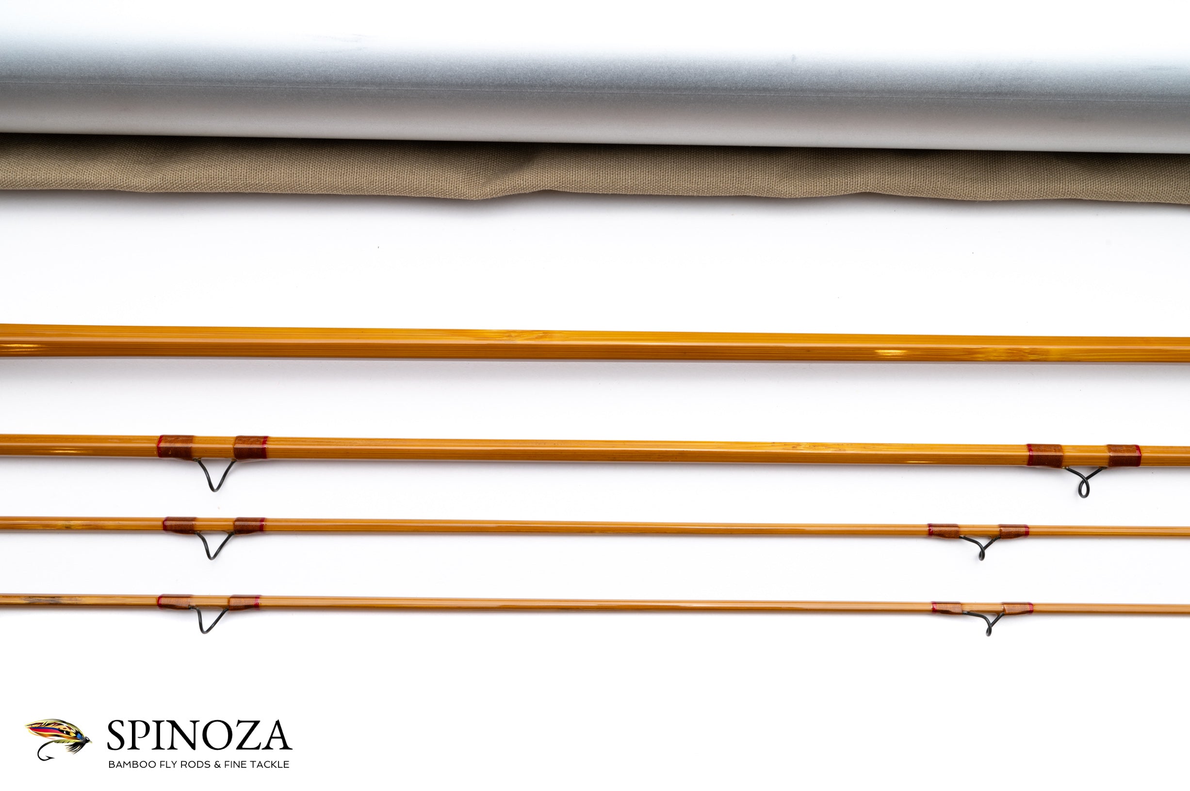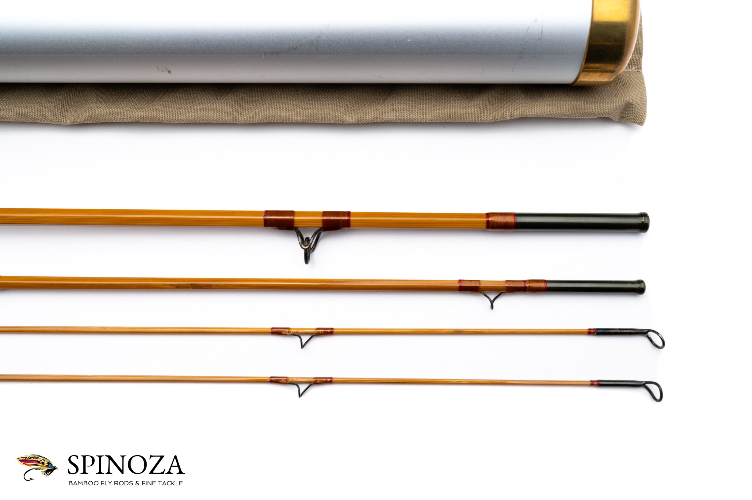 A very nice RD (Bob) Taylor Model 35-5 bamboo fly rod, 7'6", 3-piece, 2-tip, and built for a #5. Serial number "293". Lawn cast only condition. The rod weighs 3.8 ounces on my scale. Pleasing medium action. The rod is straight and the ferrule fits are good. Medium wheatstraw cane done in a two opposed node pattern. Flawless varnish, with the sole exception being a tiny bit of roughness right at the base of the keeper ring (very minor). Bronze wraps tipped in light red, with an extra band of dark red at the keeper and male ferrules. Carbide stripper with dark guides and tip tops. Oxidized ferrules. The grip is 5 1/2" long and shaped to a medium blunt cigar profile. The reel seat is an oxidized cap and ring over a flatted and flawlessly varnished wood spacer. The cap sports Bobby's maker stamp in a cartouche (there is a tiny bit of oxidation loss at the edge where the barrel of the cap joins the end, as sometimes happens). The rod packs into a tan cloth bag and a frost aluminum tube with brass fittings and Bobby's business card taped to the outside. A superb example by this masterful builder.