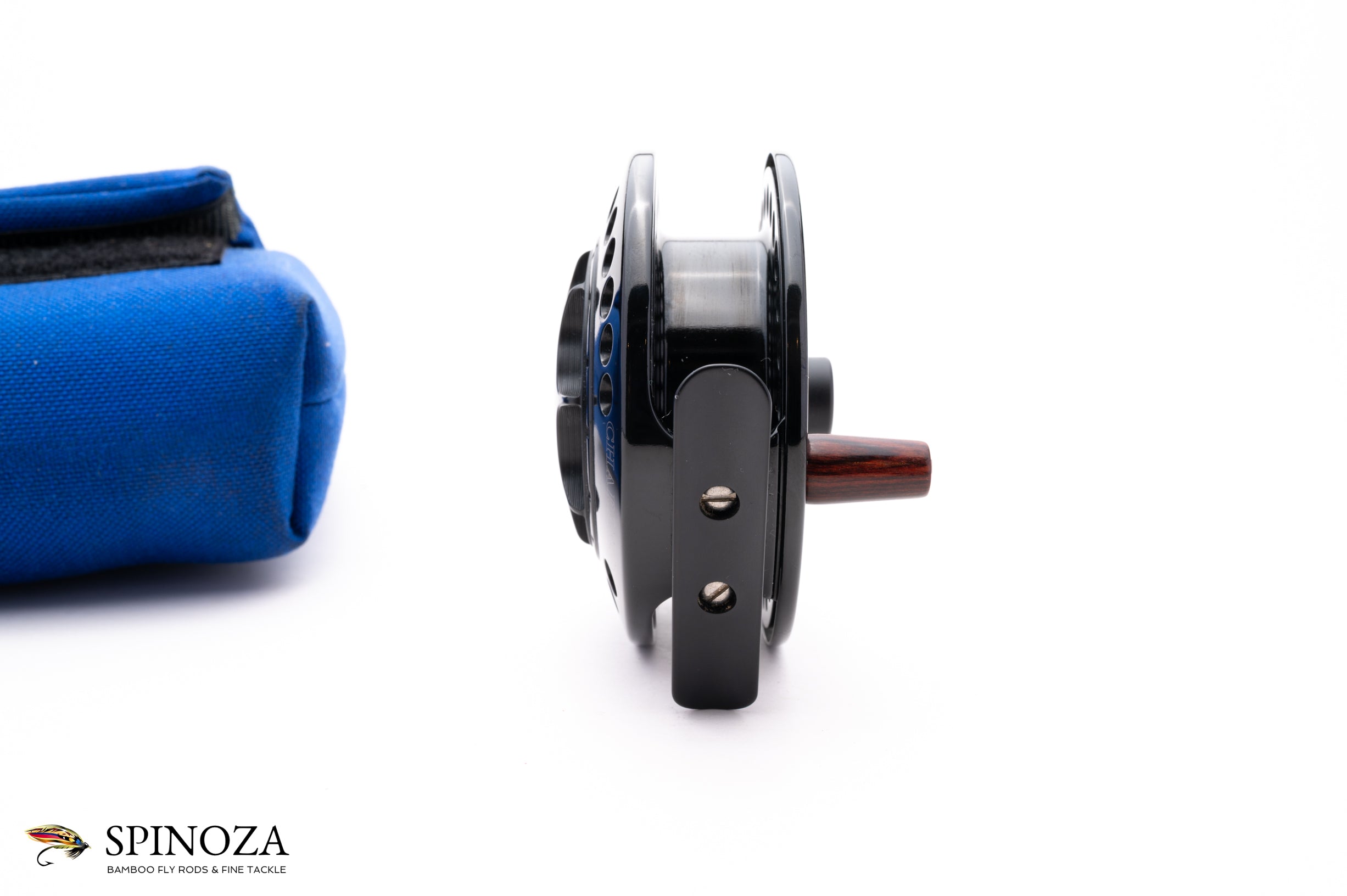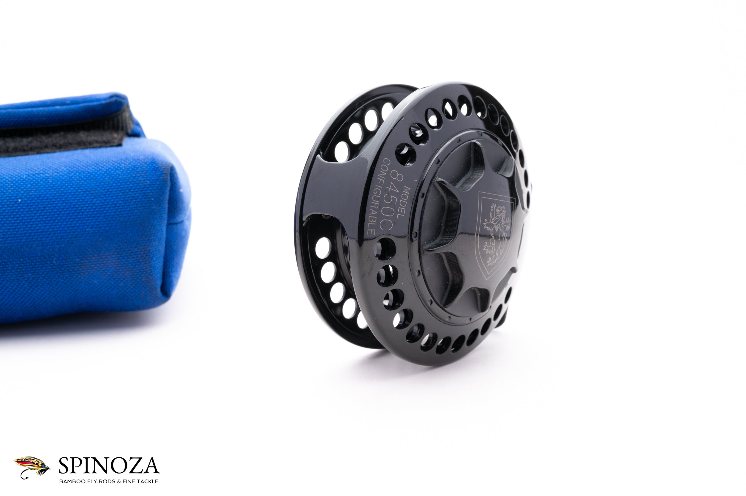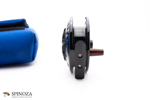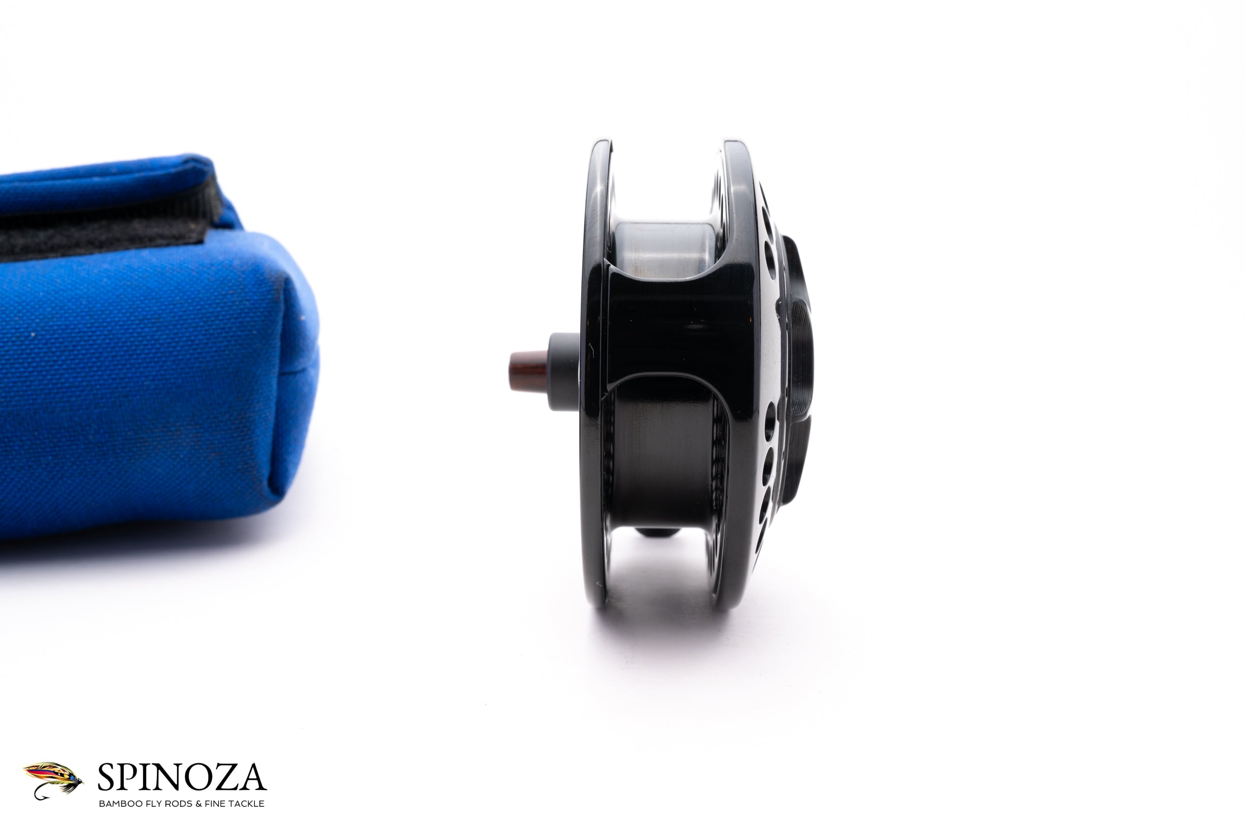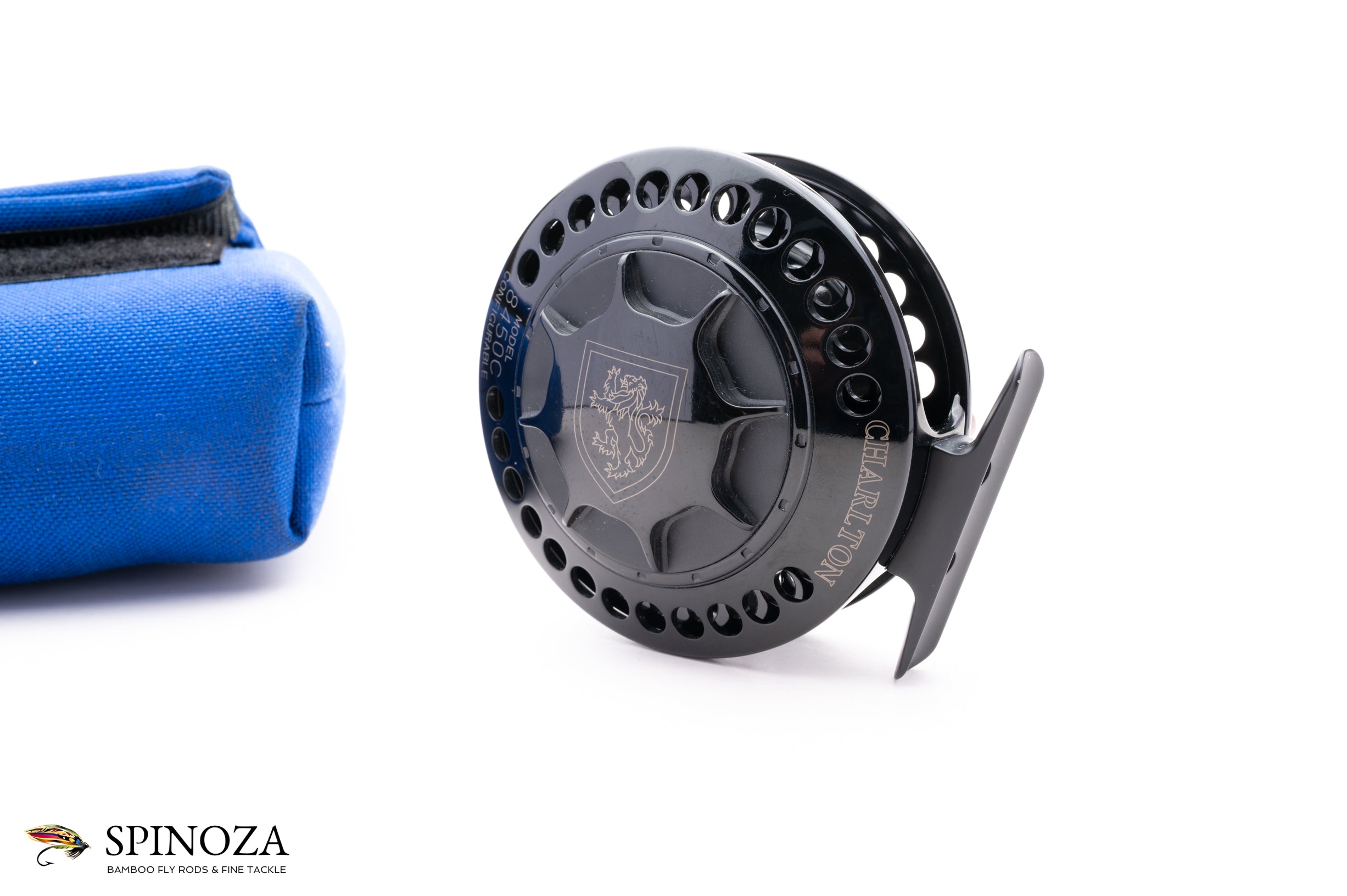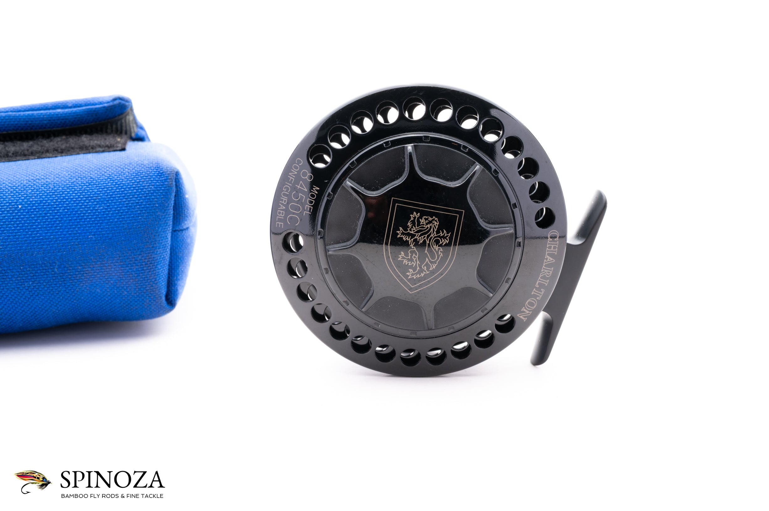 A very nice Charlton 8450C fly reel with a 3/4 spool, 3 1/2" diameter and set up for RHW (though easily convertible). Near mint condition with just one or two tiny traces of wear on the frame edge. The reel weighs 5.9 ounces on my scale. Black type-III anodizing for durability and this reel boasts Charlton's clever configurable system accommodates three different quick change spools: 3/4, 5/6, and 7/8 weight so that you can cover a range of six line weights with a single reel. Carbon fiber disk drag system that is very powerful. All mechanical components are enclosed to protect against contamination from the elements. Push button spool removal and a snap reverse system makes changing retrieve directions simple and easy. The reel comes with its original blue cordura reel pouch.