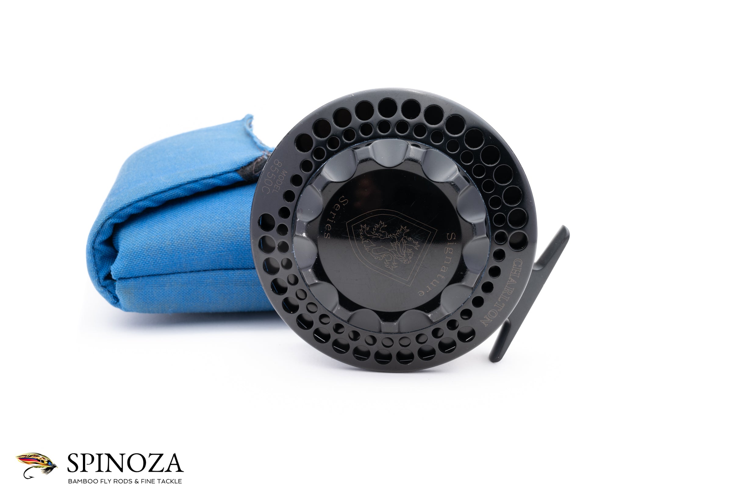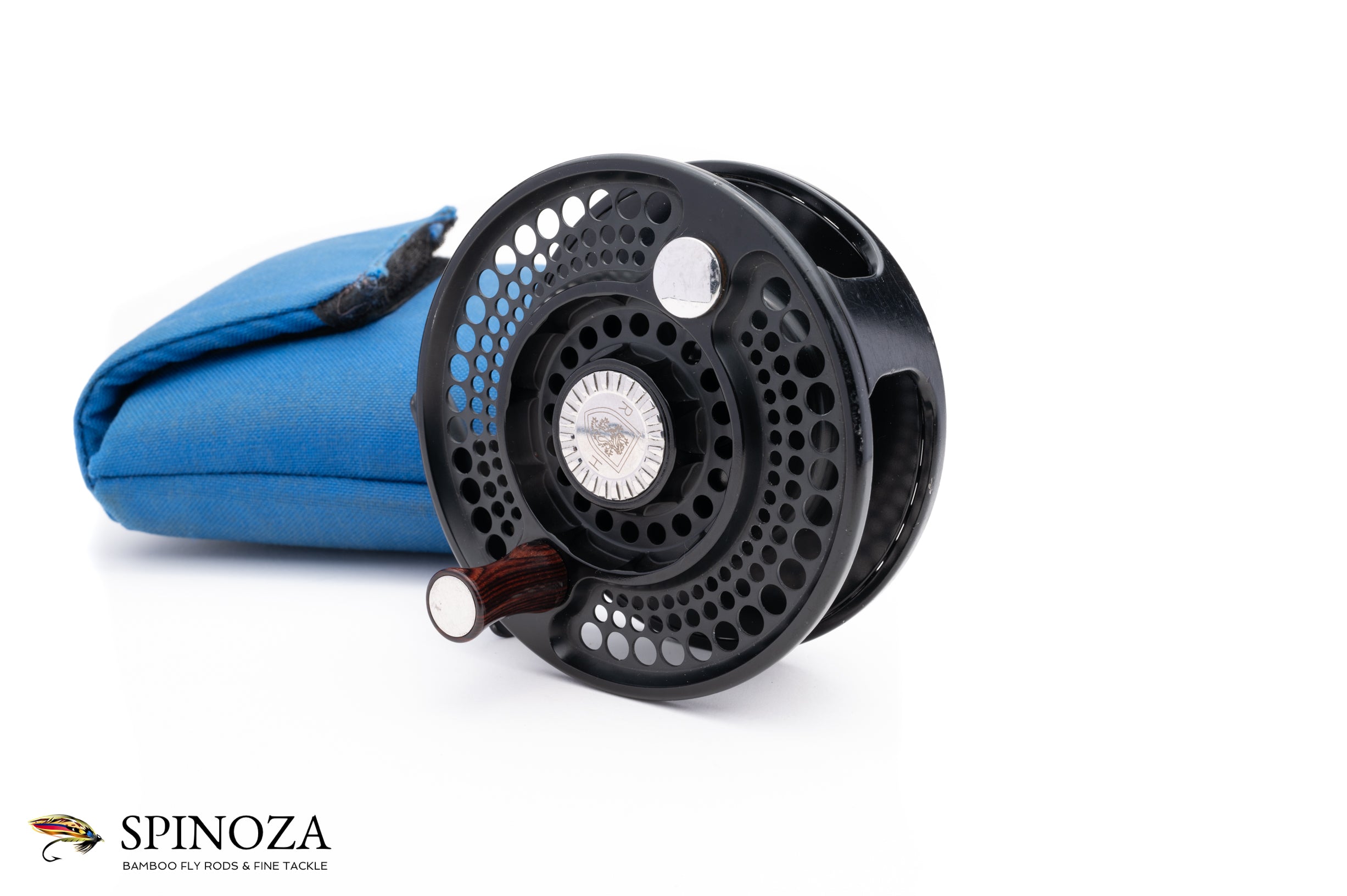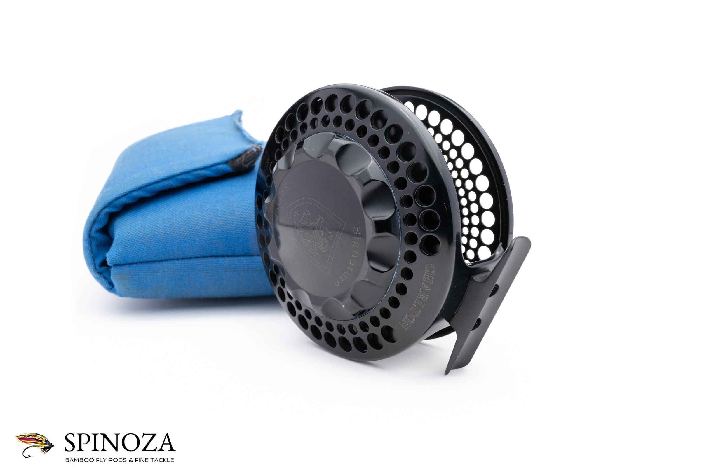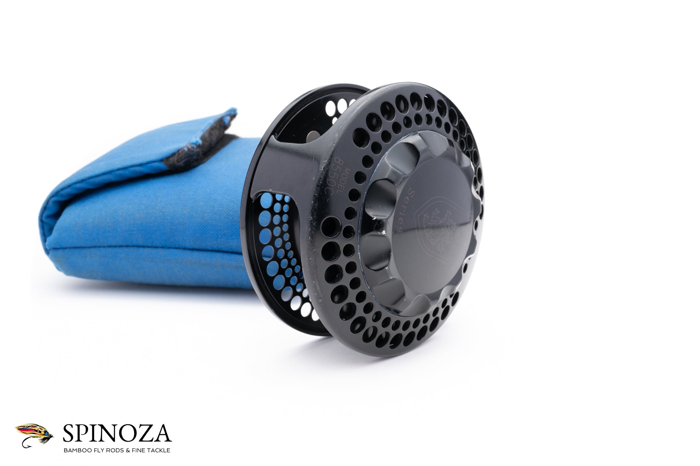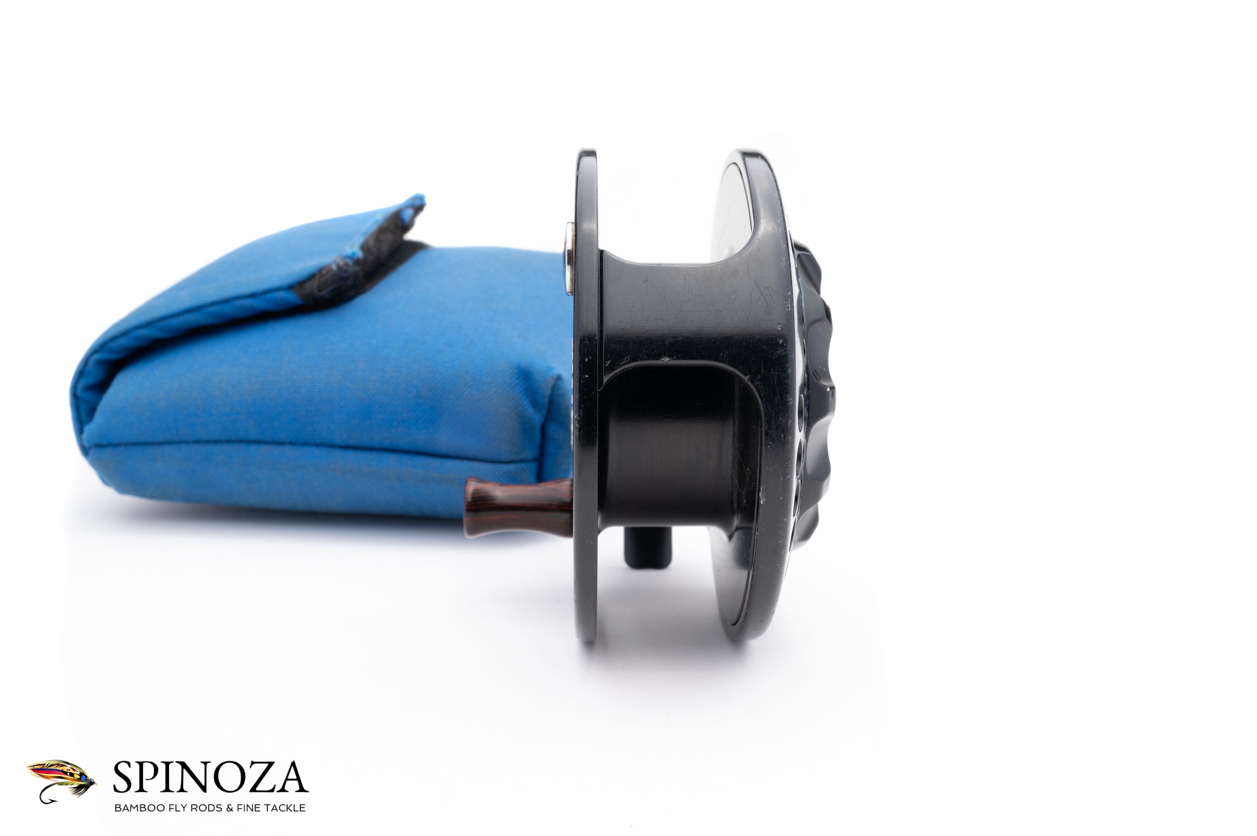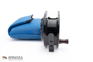 A superb Charlton 8550C fly reel with a tarpon spool. Set up for RHW. Good used condition with moderate rim rash along the frame edge, spool edge, and a little bit on the drag adjuster dial. No major dings or gouges though, just typical wear from honest use. Mechanically the reel is perfect, as you would expect from these bulletproof Charltons. 4 1/2" diameter with a 1 3/16" spool width. The capacity for this model is listed as WF 10 and 400 yards of 30 lb backing. Serial #8550-9030. The sealed carbon fiber disk drag is self-adjusting and has over 9-square inches of surface area. Excellent all-black type-III hard anodizing except for the center medallion and the counterweight which are done in chrome. The reel is packed in the original blue cordura pouch. A highly sought-after Charlton model here, it doesn't get much better than this for chasing large saltwater species.