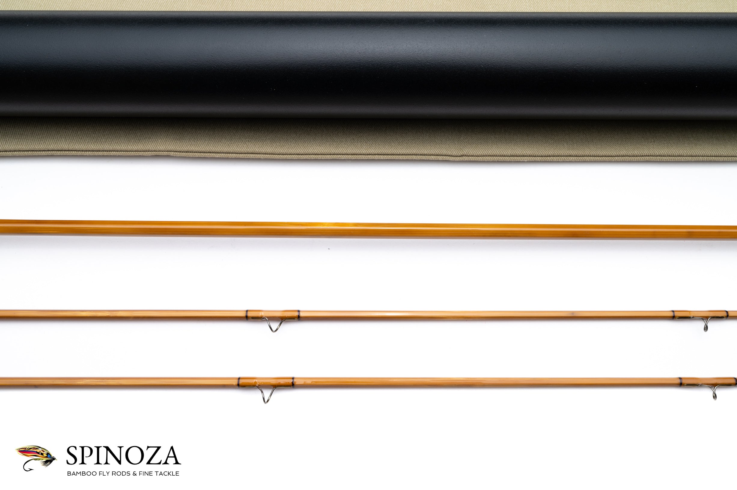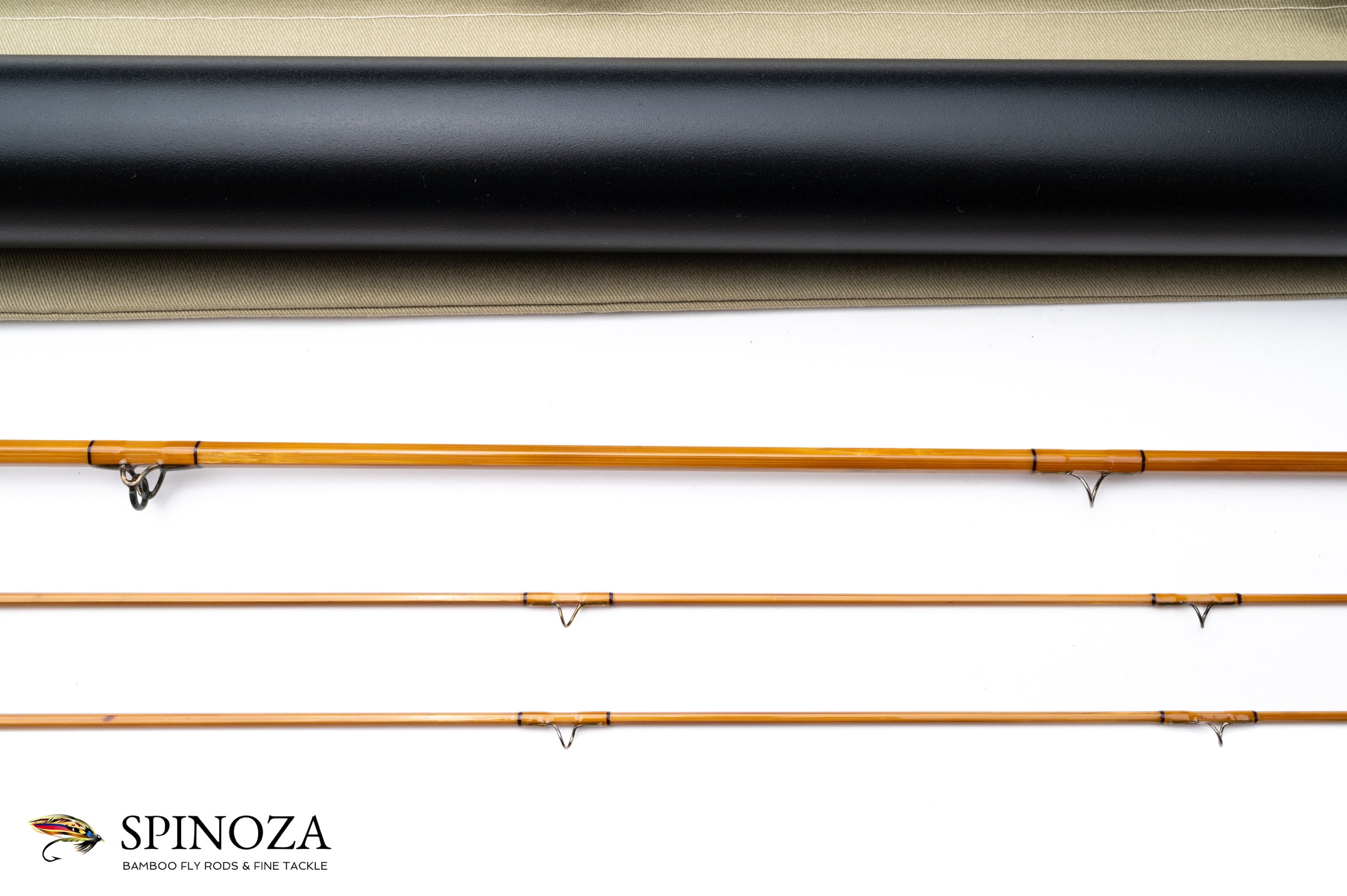 A Charles Neuner bamboo fly rod, 6'6", 2-piece, 2-tip, and built for a #4 line. Serial #724. The rod weighs 3.4 ounces. A new rod, unfished. Fast DF action. Lightly flamed cane, three-up node pattern. Transparent main wraps with black edges on all, black at the ferrules. The carbide stripper is black oxidized and the snake guides are black nickel as well. The the step ferrules are oxidized. The 6" long grip is styled to a slim cigar. The cap and ring seat are oxidized, and the cap has a delicate engraving “Charles P. Neuner, Maker” in an oval cartouche. The spacer is a highly varnished west coast maple burl. The rod comes with an aluminum and cork ferrule plug. The rod bag is a light olive color and the aluminum tube is painted black with brass hardware.