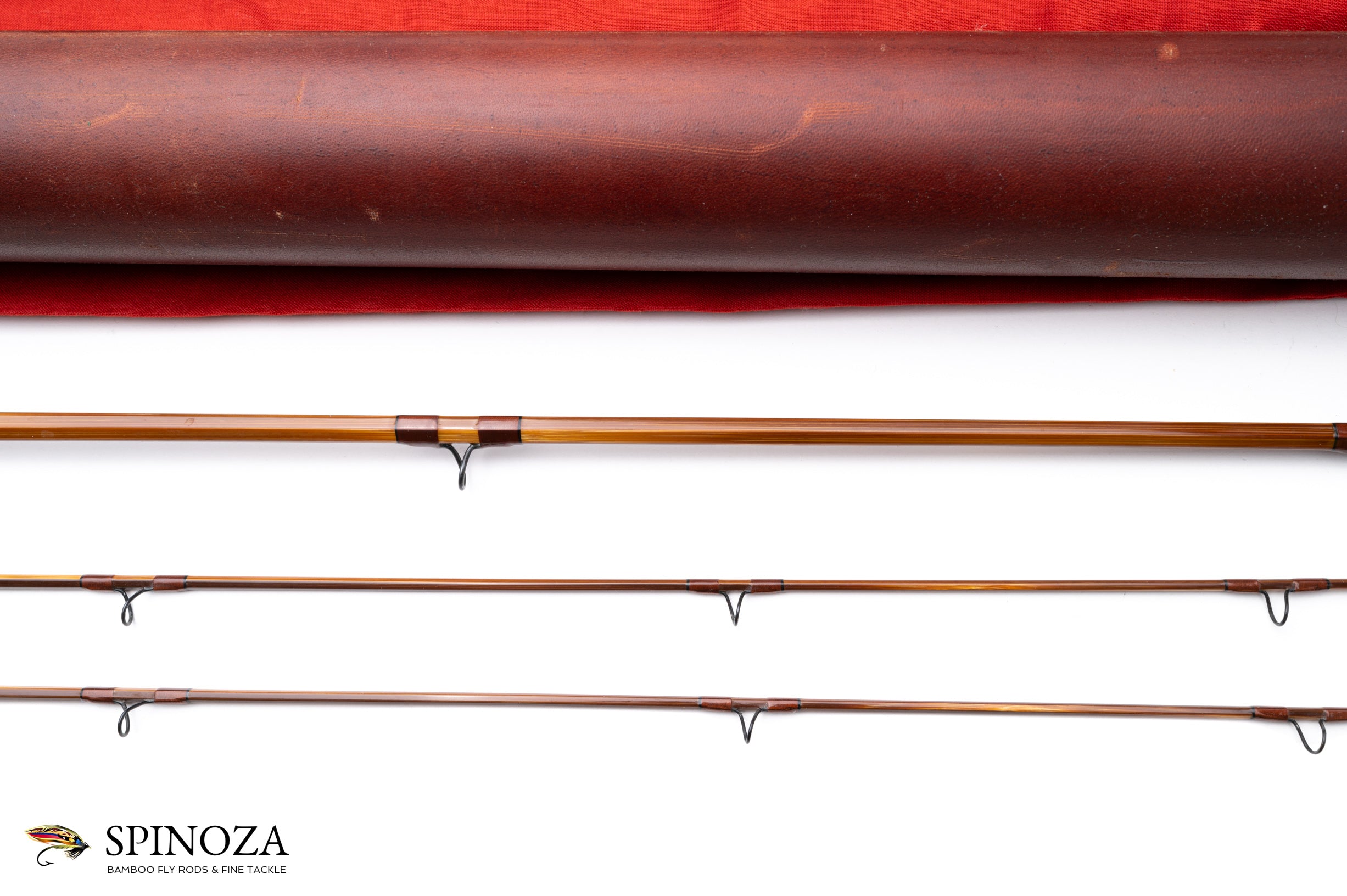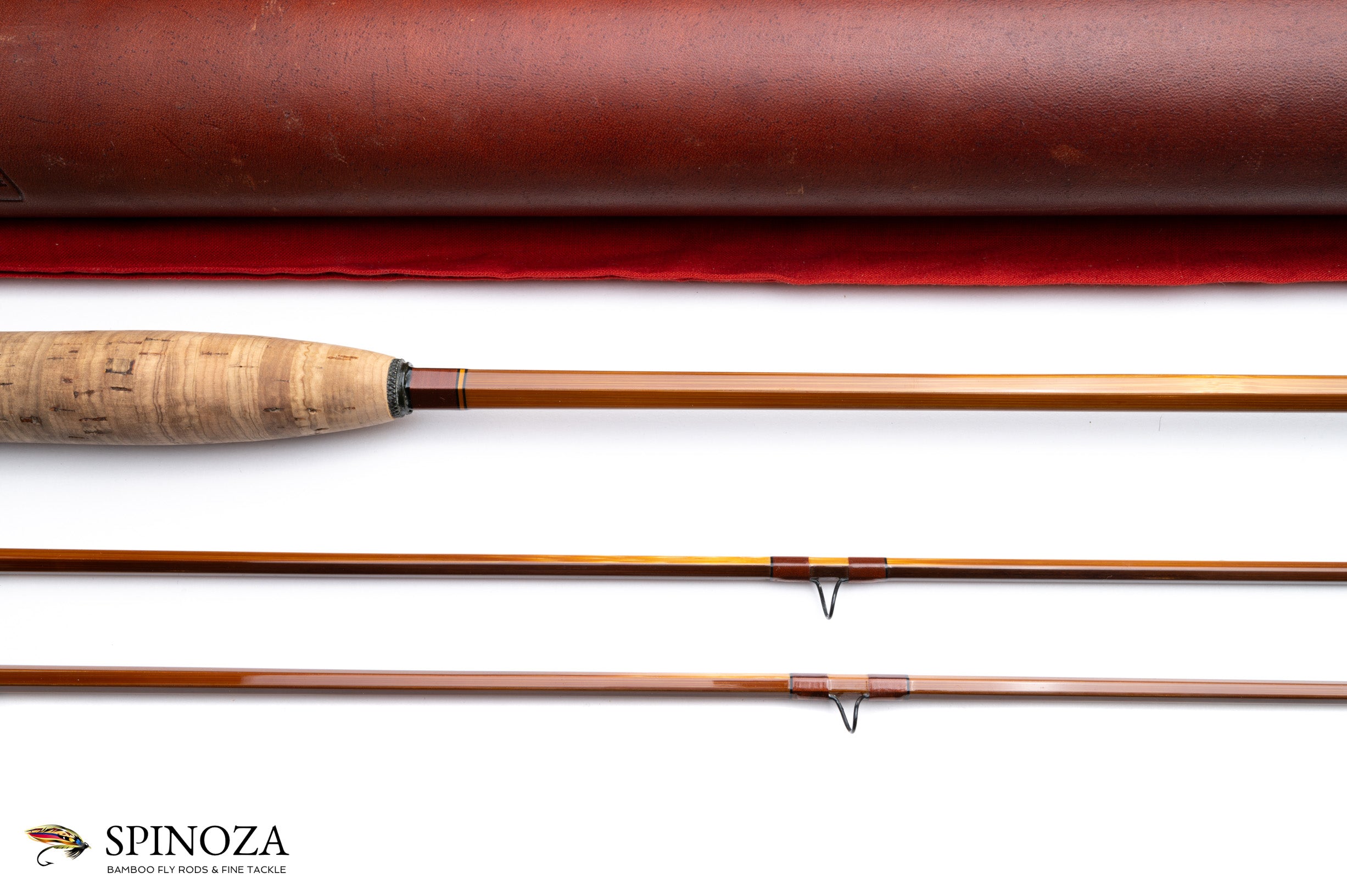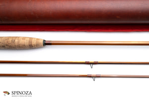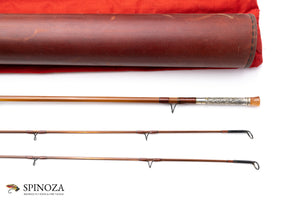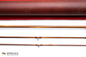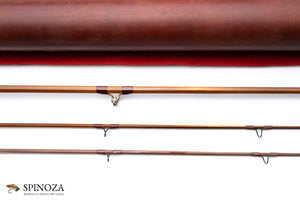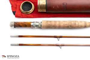 A nice Darryl Whitehead bamboo fly rod, 7'3", 2-piece, 2-tip, and built for a #5 line. Medium fast. Used lightly, with some modest grip soiling. The rod weighs 4.4 ounces on my scale. There are some tiny cracks from casting at the ferrule wraps. Serial # 51B (1982) and intended to pair with a Saracione reel with the same serial number. Flamed cane in a spiral node pattern. Superb varnish. Brown main wraps with black edges on all, a band of apricot and black at the keeper and male ferrules. Agate stripper and black snake guides appear to have been made by Darryl himself. The Swiss style ferrules are polished and are engraved by Paolo Barbetti. A nickel silver and bone ferrule plug keeps the female ferrule clean. The grip is 5 3/4" long, formed to a western profile. The seat features an eye-catching and perfectly varnished walnut spacer. The nickel silver downlocking screwlock is made of opposed pocket caps which are also engraved by Paolo Barbetti. The bottom of the cap is engraved "D.L. Whitehead, Maker, Ser # 51B, 1982." The rod packs into a aed cloth bag and Arnie Mason leather tube with aluminum insert and brass collar/tops. The brass top in all of this has also been engraved by Paolo Barbetti.