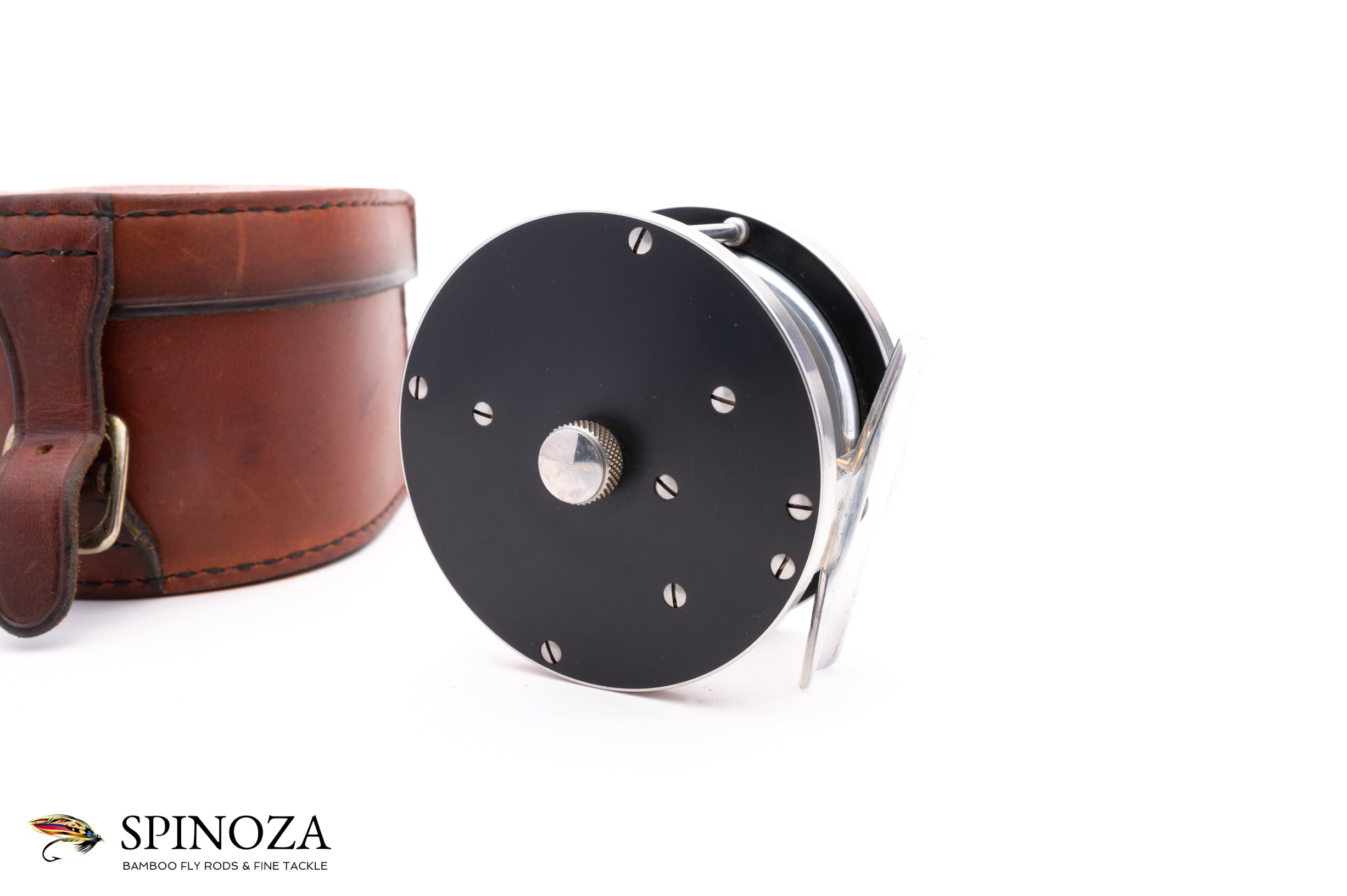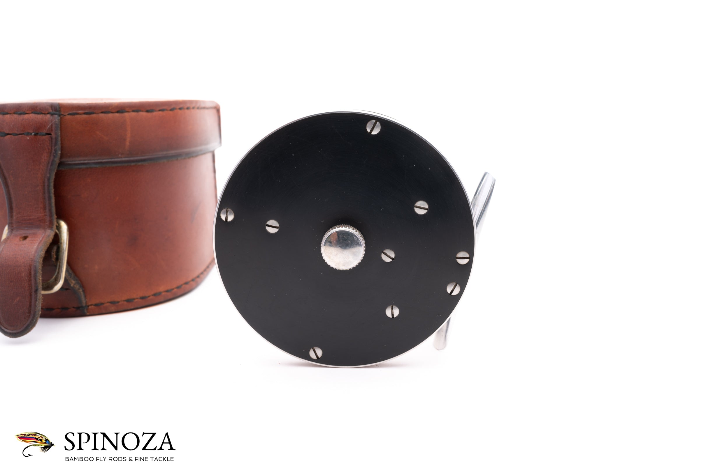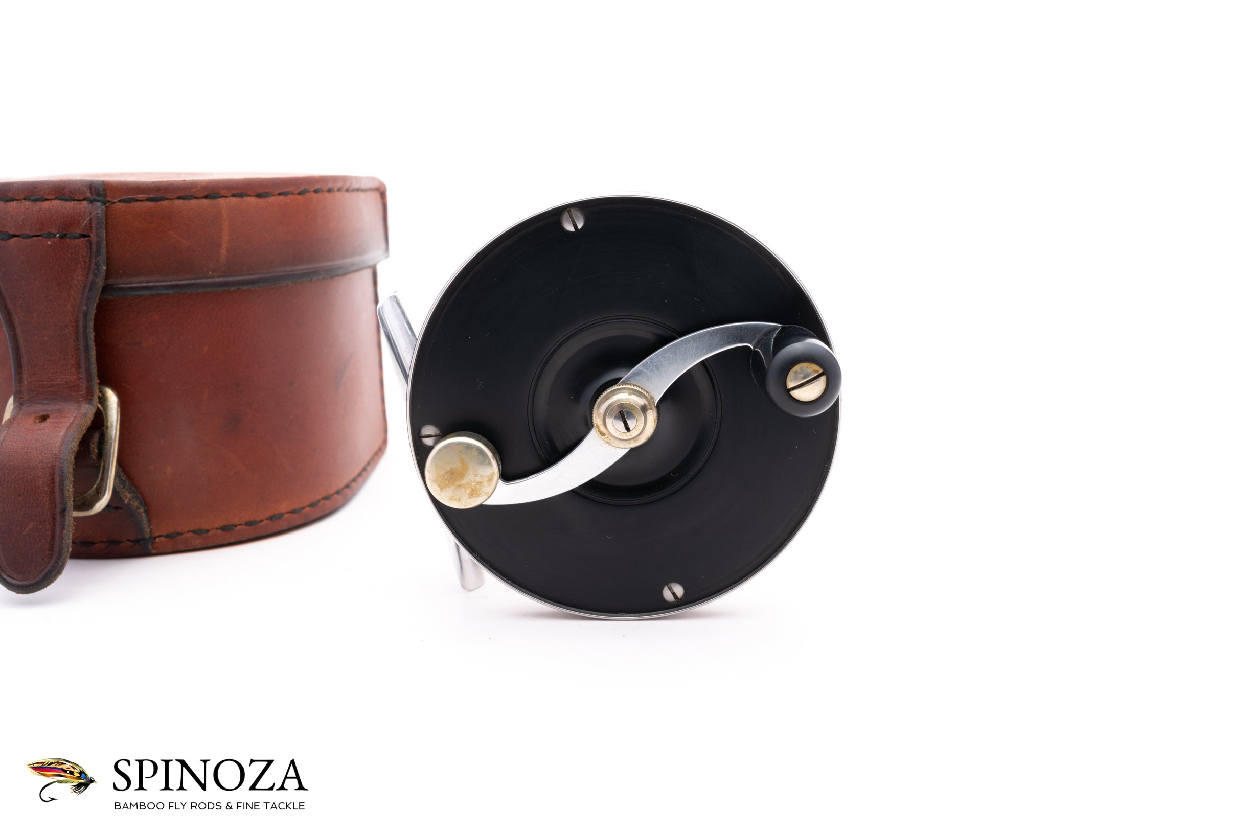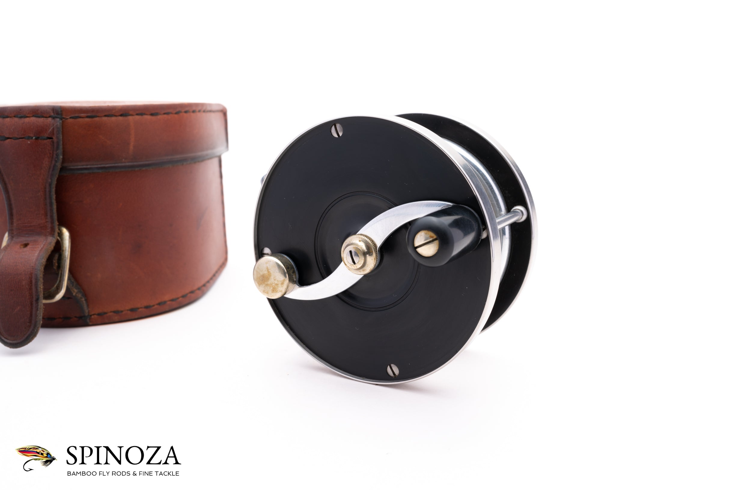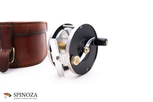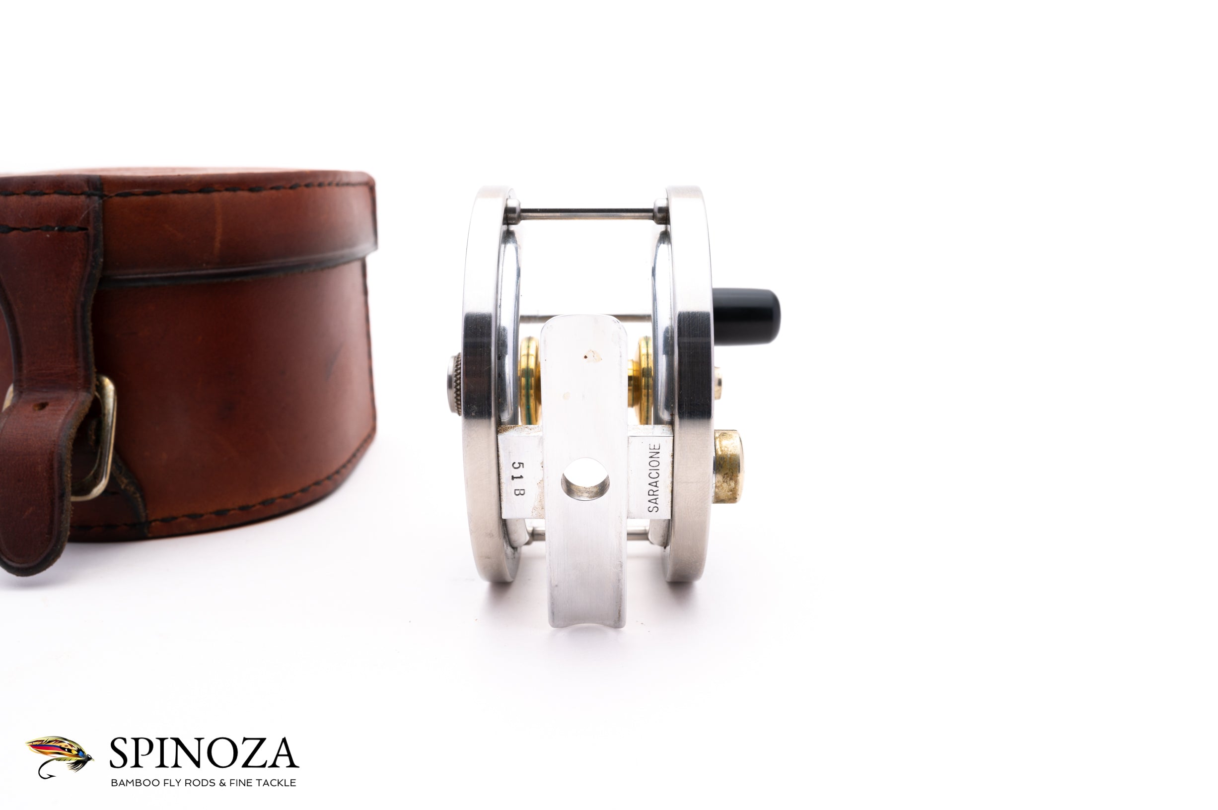 A superb Saracione Deluxe fly reel, 3" diameter and set up for RHW. Serial #51B. The reel weighs 5.1 ounces on my scale. Good used condition with normal cosmetic wear throughout but no major issues. There is some light rim rash in a few places, some mounting marks on the foot, and a few scuffs on the sideplates. This reel is intended to pair up with the Darryl Whitehead rod described above and which bears the same serial number. Polished hard rubber side plates. The rim bands are nickel silver while the foot, spool, and serpentine handle are aluminum. The screws and pillars are stainless steel. The reel comes in a handsome Arne Mason leather box.