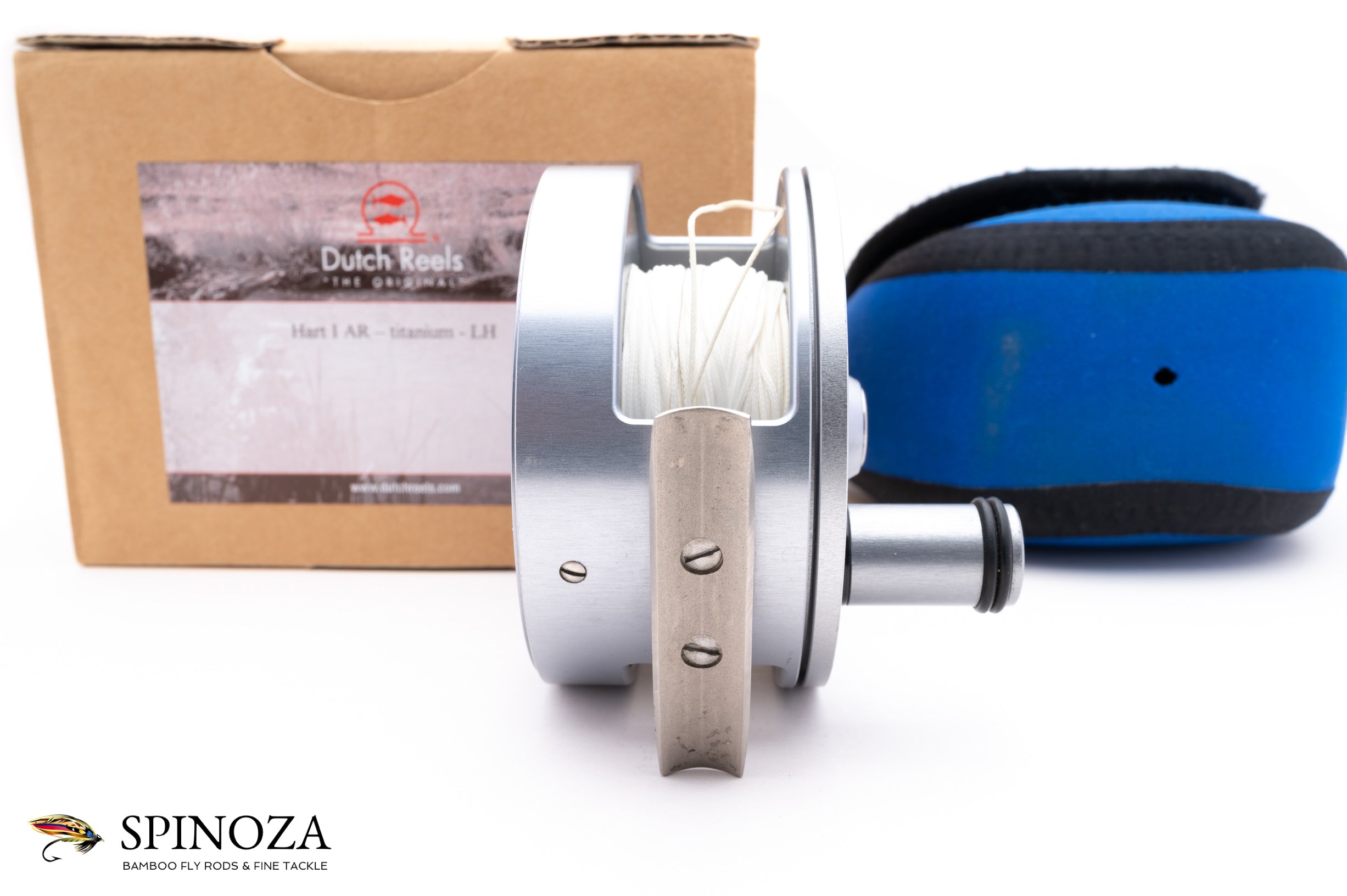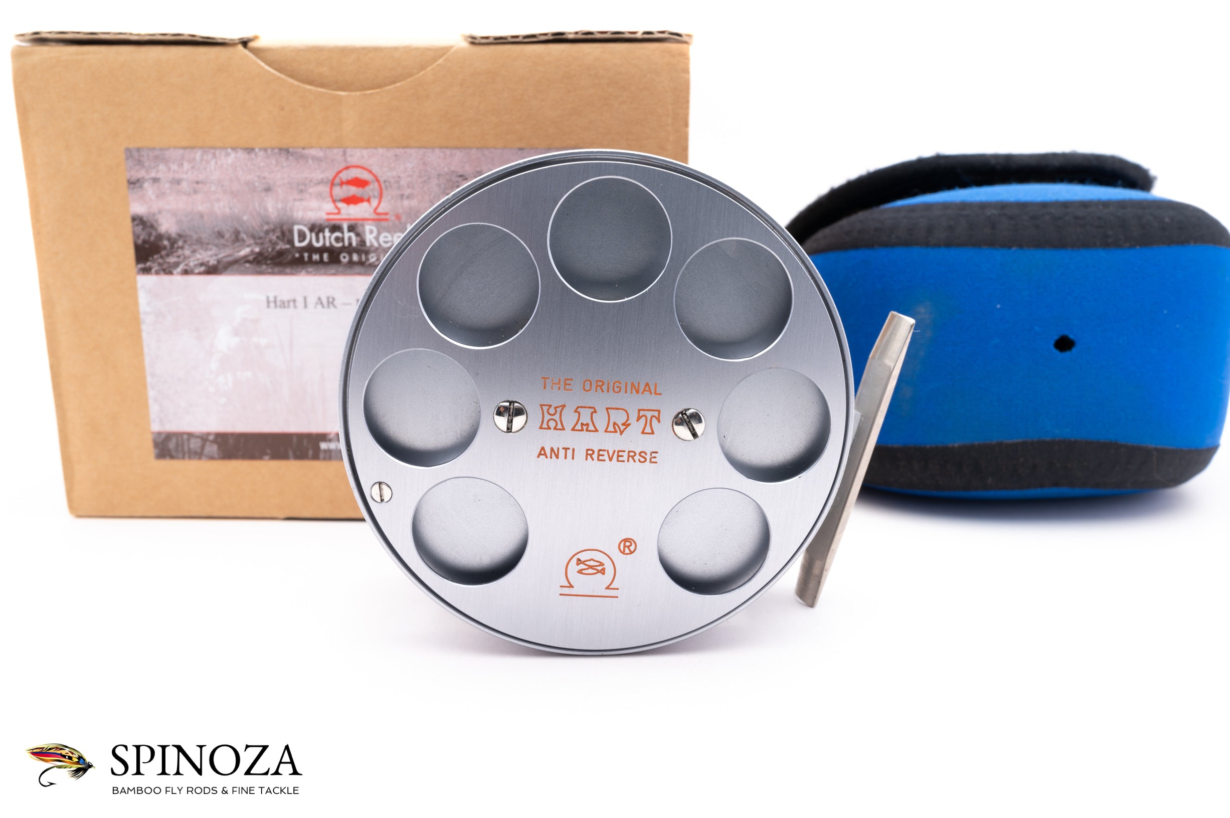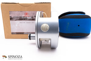 A nice Dutch / Ari t Hart AR 1 fly reel, 3 1/2" diameter and set up for LHW. It weighs 12 ounces on my scale with the backing current loaded on it. Near mint condition with just a few tiny traces of cosmetic wear in a couple of spots. It couldn't have been fished or used much. Silver anodized frame and spool, with the drag adjustable on the backplate which has seven holes drilled in it for easy grasping. The make and model are etched into the backplate in red. Anti-reverse drag design. The reel comes in the original blue neoprene pouch and Dutch Reels box.
