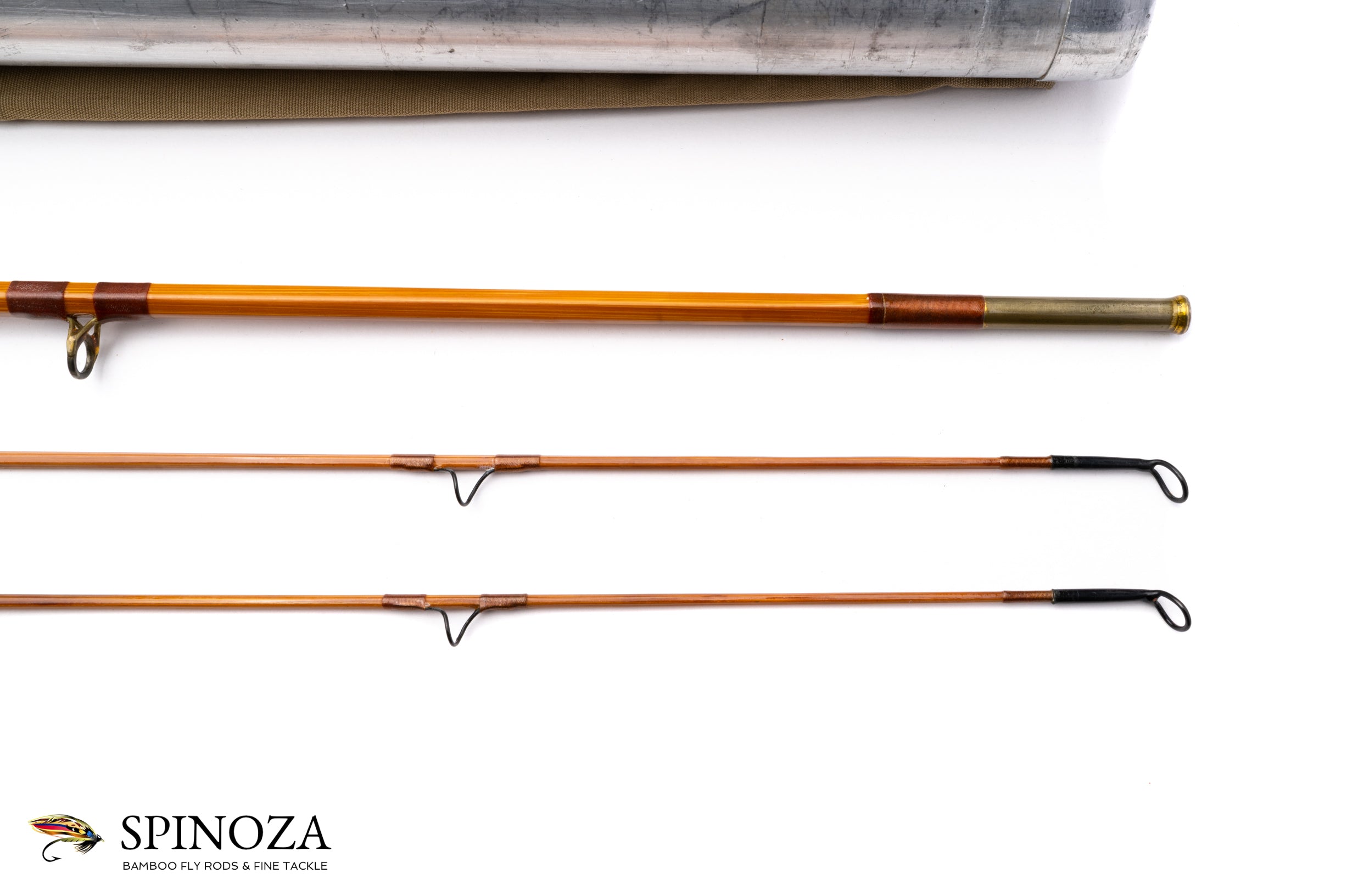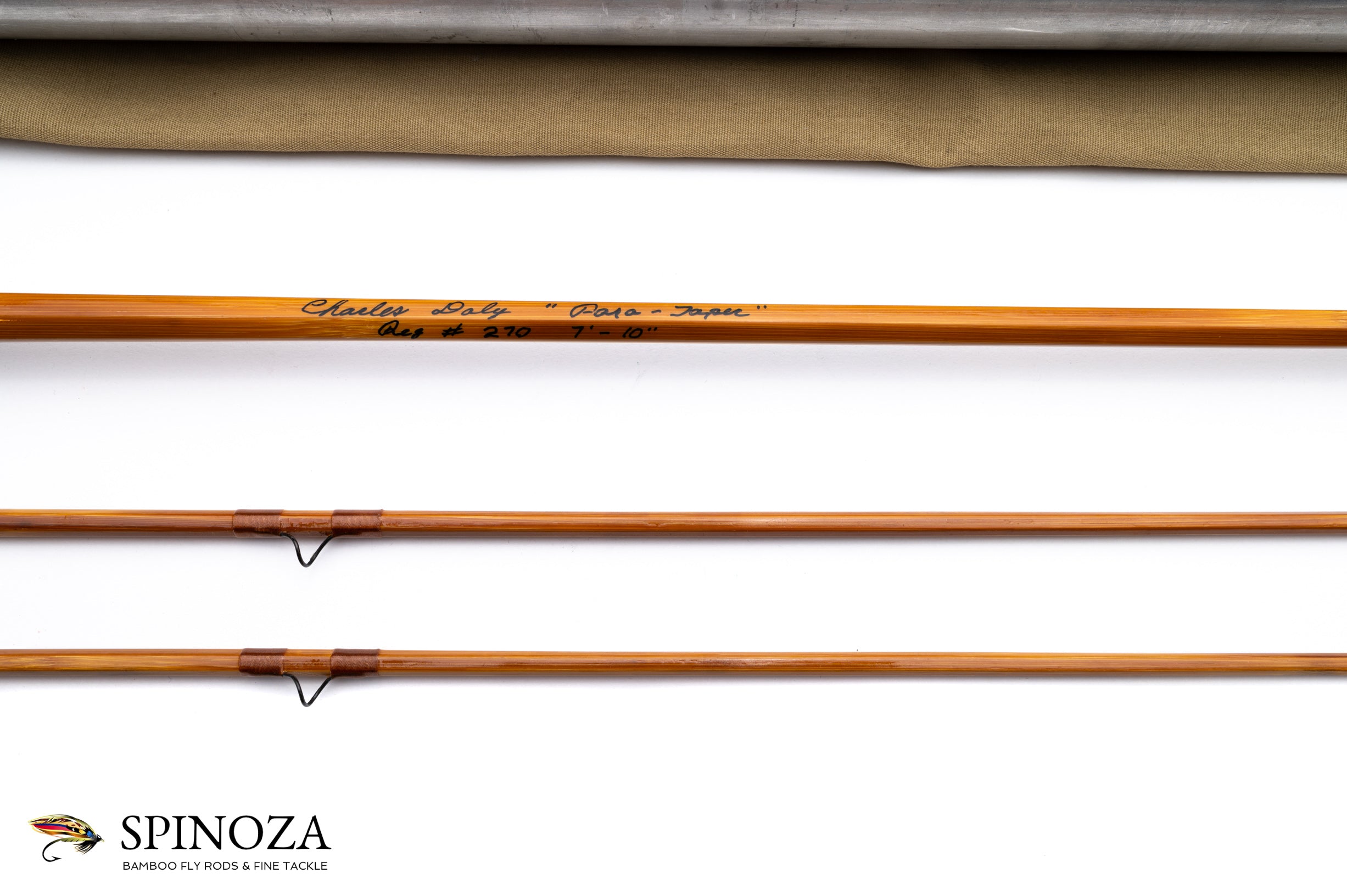 A Charles Daly "Para Taper" bamboo fly rod, 7'10", 2-piece, 2-tip, and built for #5. Serial #270. The rod weighs 4.5 ounces on my scale. I believe this rod was made by Edwards for Charles Daly, the sporting goods retailer in Philadelphia. While I confess that I don’t know a great deal about these models, I did find the taper for this rod quite attractive in the hand. Medium to medium-fast action. The rod has an Edwards-style seat and has been refinished, so there are ghost where prior guides have been repositioned. Light flamed cane in a light caramel color with lighter nodes. Brown wraps with no edge and two carbide strippers and black stainless snakes. The butt has a slight swell. The step ferrules are polished bright. The grip is 5 1/2" long and shaped to a cigar profile. It has been cleaned, leaving it slightly ridged with a hidden pocket cap. Uplocking aluminum screw lock. The rod packs into a tan bag and aluminum tube.