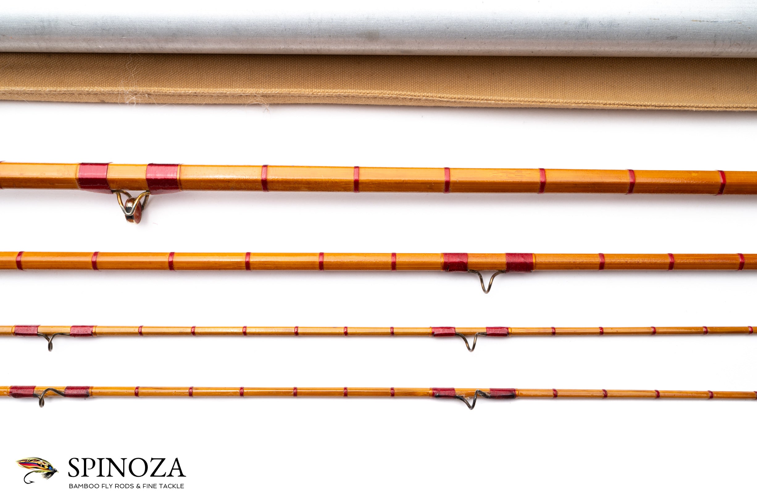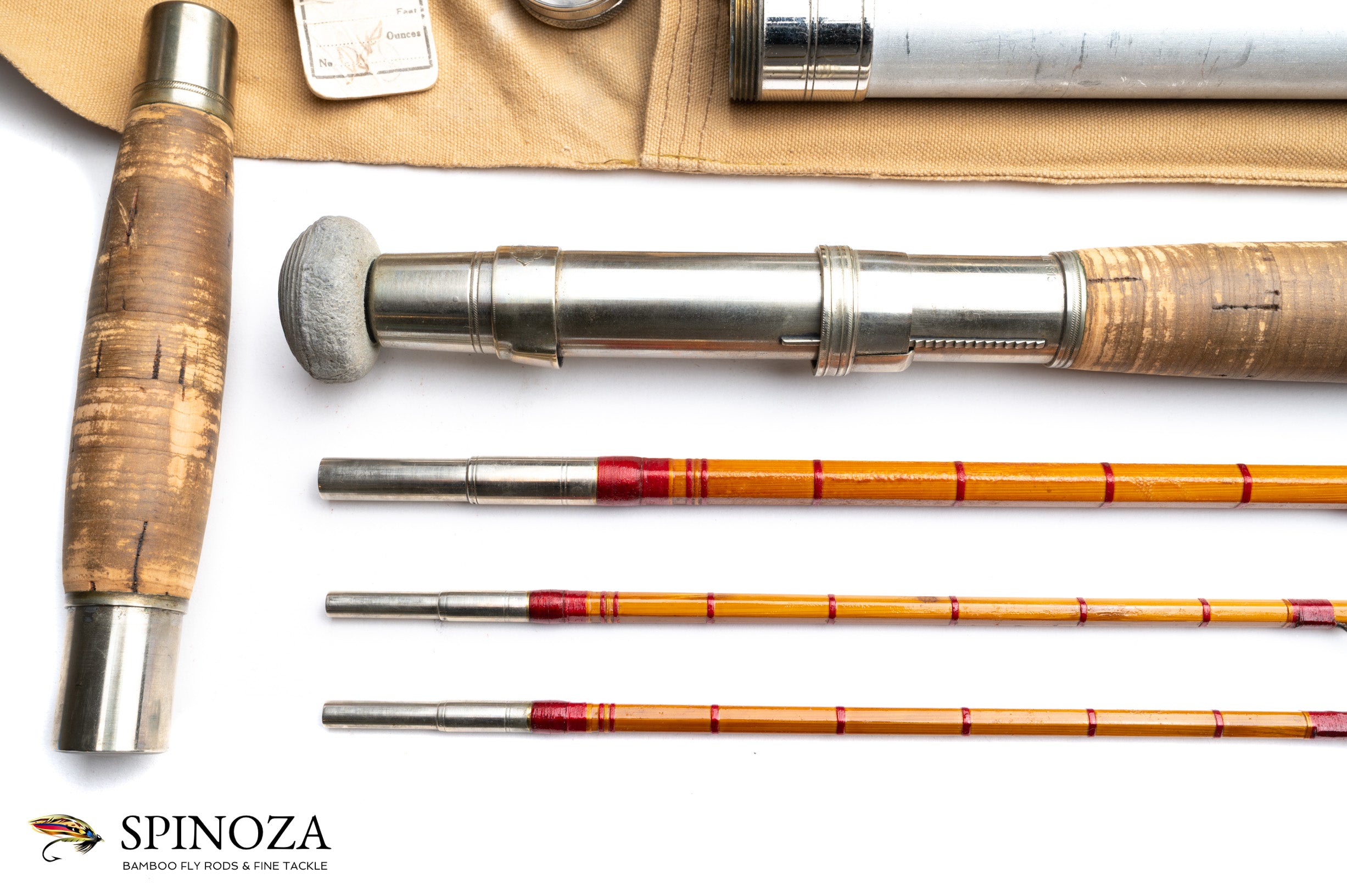 An F.E. Thomas "Special" bamboo fly rod, 10'6", 3-piece, 2-tip, and built for what feels like a #8 line. Excellent, all original condition. The grip shows some darkening, the varnish is a little textured throughout (age, not damage), and the topmost wrap on one tip appears to have been rewrapped at an earlier point, but overall the rod is in great shape for its age and devoid of any meaningful issues. It is also nicely straight for its age. Medium-slow action. The cane is done in a spiral node pattern, and the rod has full red intermediate wraps throughout. The main wraps are also red with bronze tipping and the rod sports signature wraps as well. It has a ring keeper, characteristic reverse twist guides, and an agate stripping guide and agate tip tops. The ferrules are polished bright and fit together well. The reel seat is a down-locking, all-metal seat with an ingenious slide band which you rotate to lock into two sets of rails with small gear teeth machined into them. The FE Thomas Special maker's stamp is found on the reverse of the pocket cap. The bottom green button is removable to accommodate a fighting butt extension, which is included with the rod. The rod comes with the original tip tube and heavy canvas bag along with the original hang tag. A very nice old salmon rod that's in very nice shape for its vintage.