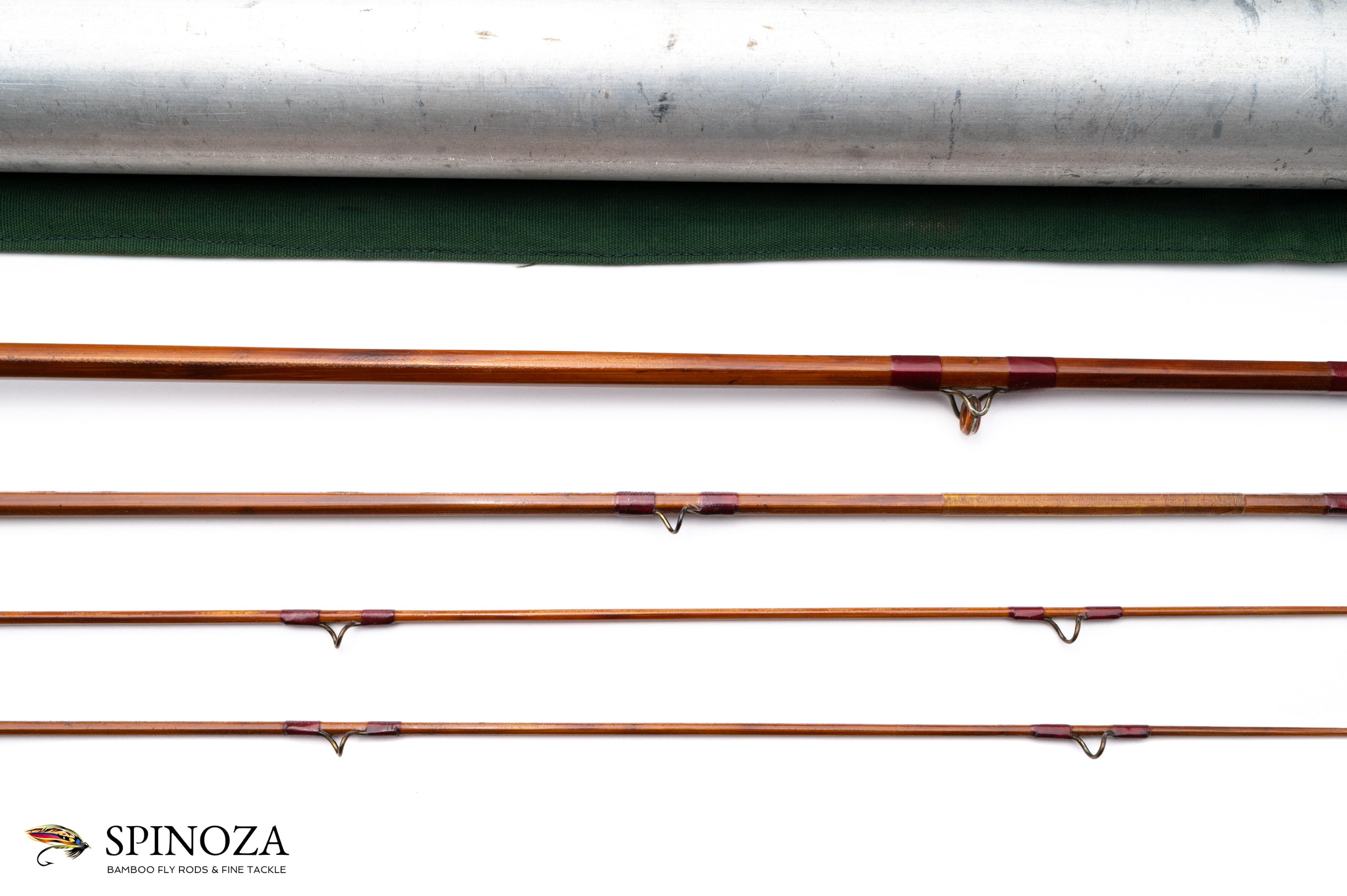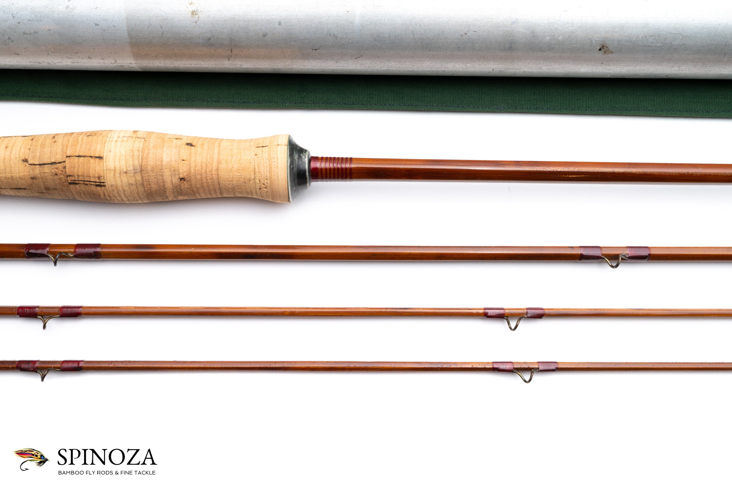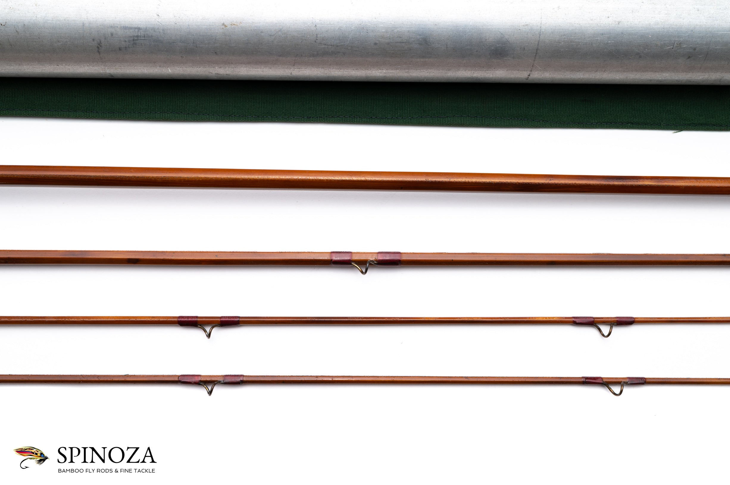A scarce FE Thomas “Mahogany” bamboo fly rod, 8'6", 3-piece, 2-tip, and built what feels like a #5 in the old wet fly style action. Serial #3 stamped on the butt cap. 4.1 ounces. This is an early rod dating to 1913. Fair condition due to a repair wrap on the upper mid section and considerable bag impression on all the sections. The rod is full length and in original condition, however. The grip has been cleaned leaving a bit of roughness. Full flexing wet fly action, as mentioned. Dark cane wrapped red with no edges. A set of eight signature wraps in red at the check and four at the male ferrules. The stripper is an orange agate and the snakes are reverse twist heavy wire and sized for a silk line. There is almost no wear to the inner snake guides. The step ferrules fit tight and are oxidized black. The rod is straight. The grip is 5 1/2" long and shaped to a full wells. The cap and ring seat is mortised and the wood looks like white cedar. The butt cap has a slight pocket and is stamped “F.E. Thomas, Special, Bangor Me.” in a cartouche. The green poplin rod bag has some wear holes in it. The rod tube is original with brass hardware plated with nickel. A super rare model and though it has a few issues, it's exceedingly hard to find these in full original condition.