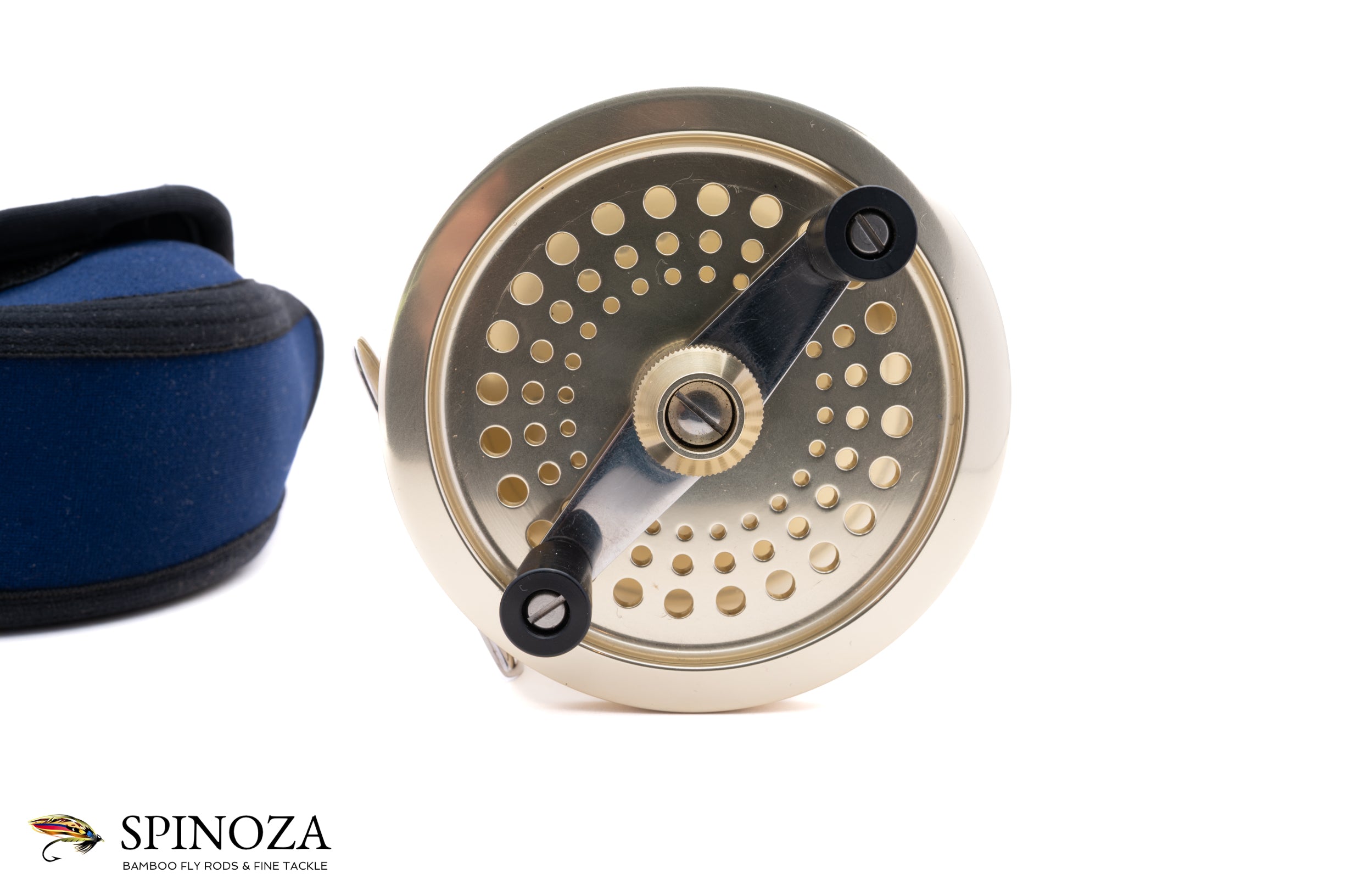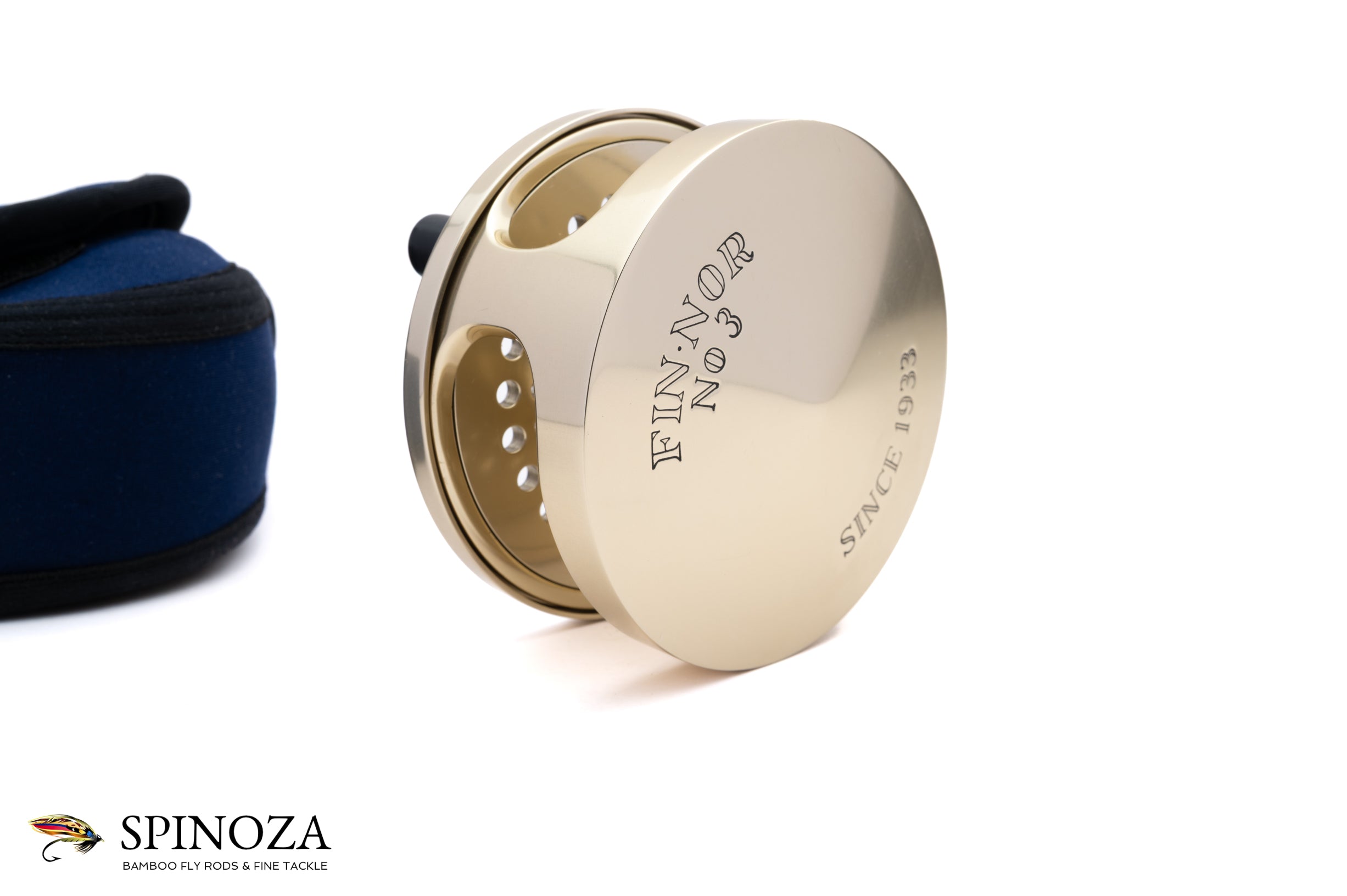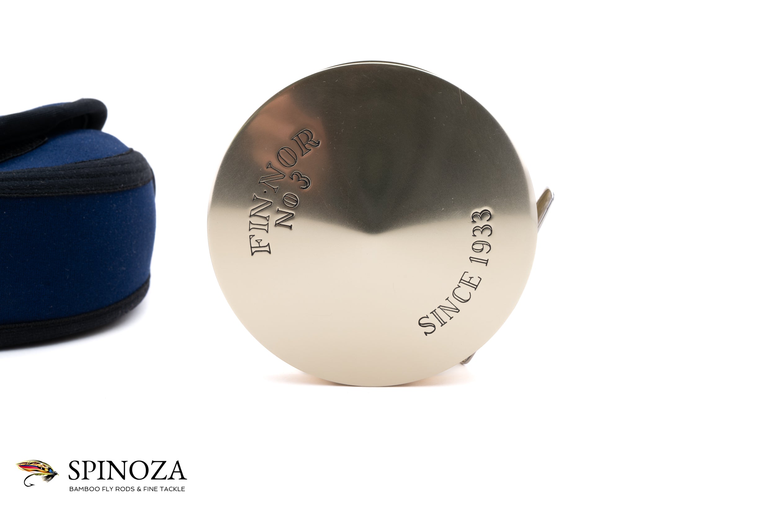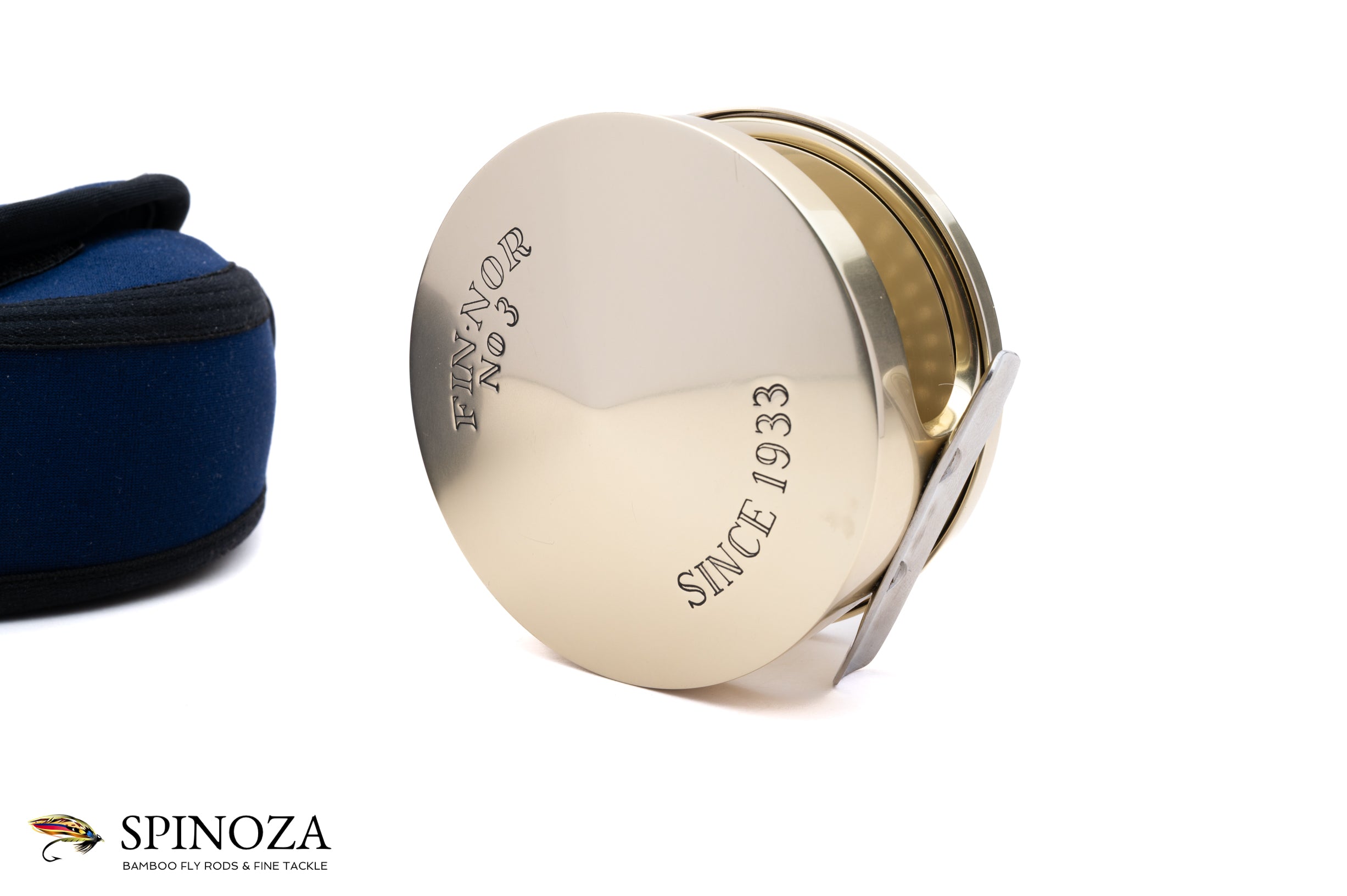 A Fin-Nor #3 fly reel, set up for LHW. Anti-reverse. 3 5/8" diameter with a 1" spool width. Weighs 14.4 ounces on my scale. The reel does not appear to have been fished at all. Dual handles. The typical gold anodized frame and spool with the silver foot. The spool is ported. The reel comes in a navy Fin-Nor neoprene pouch.