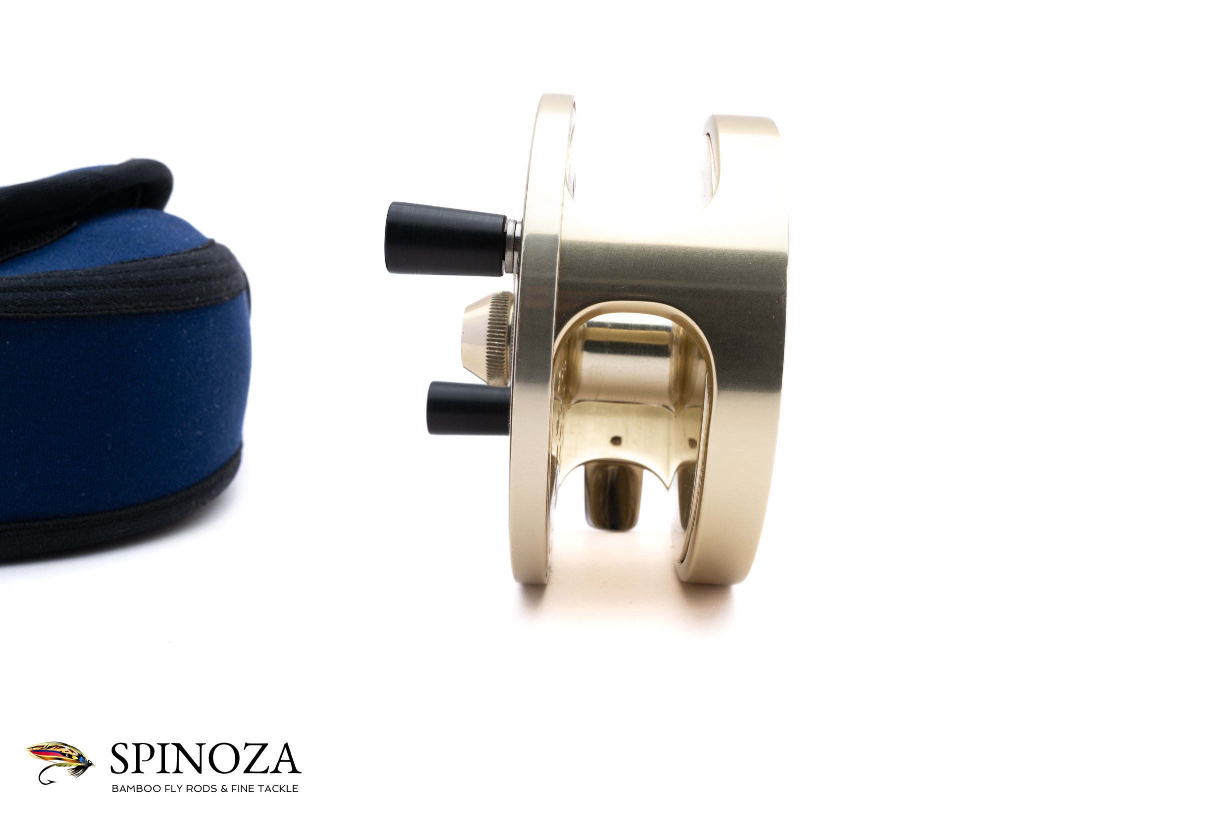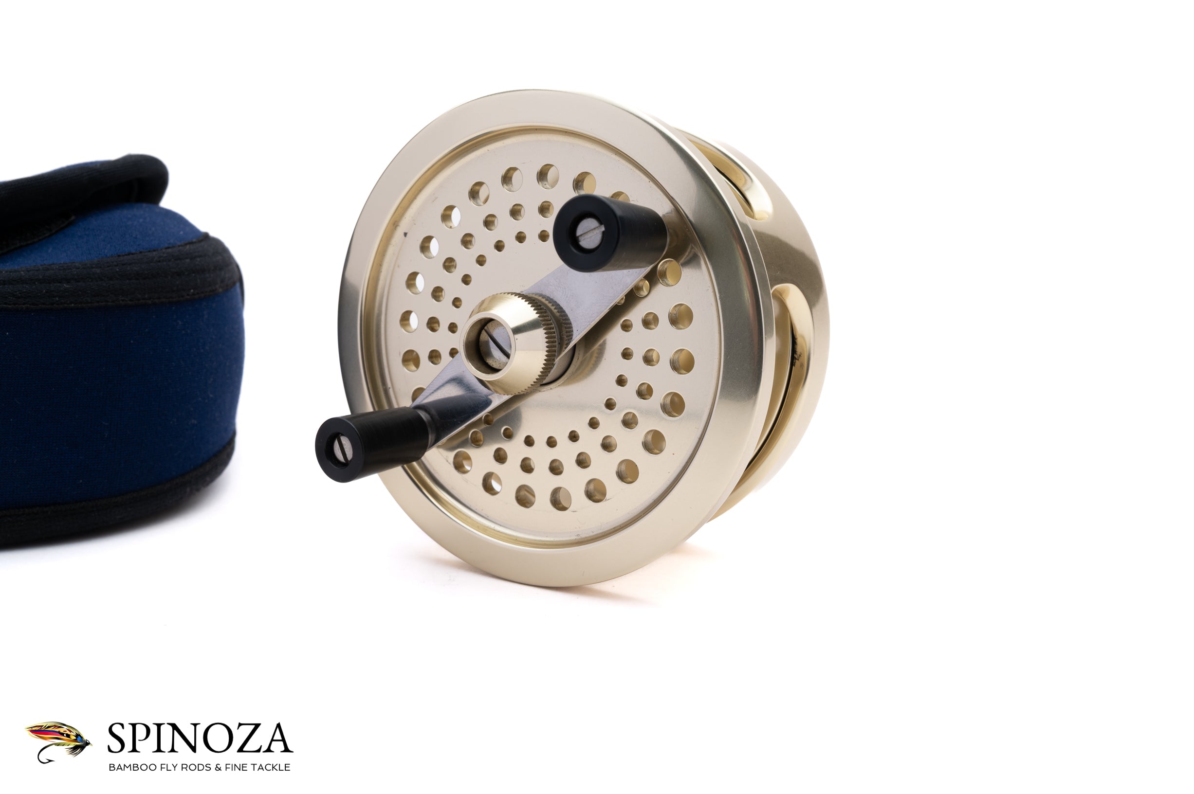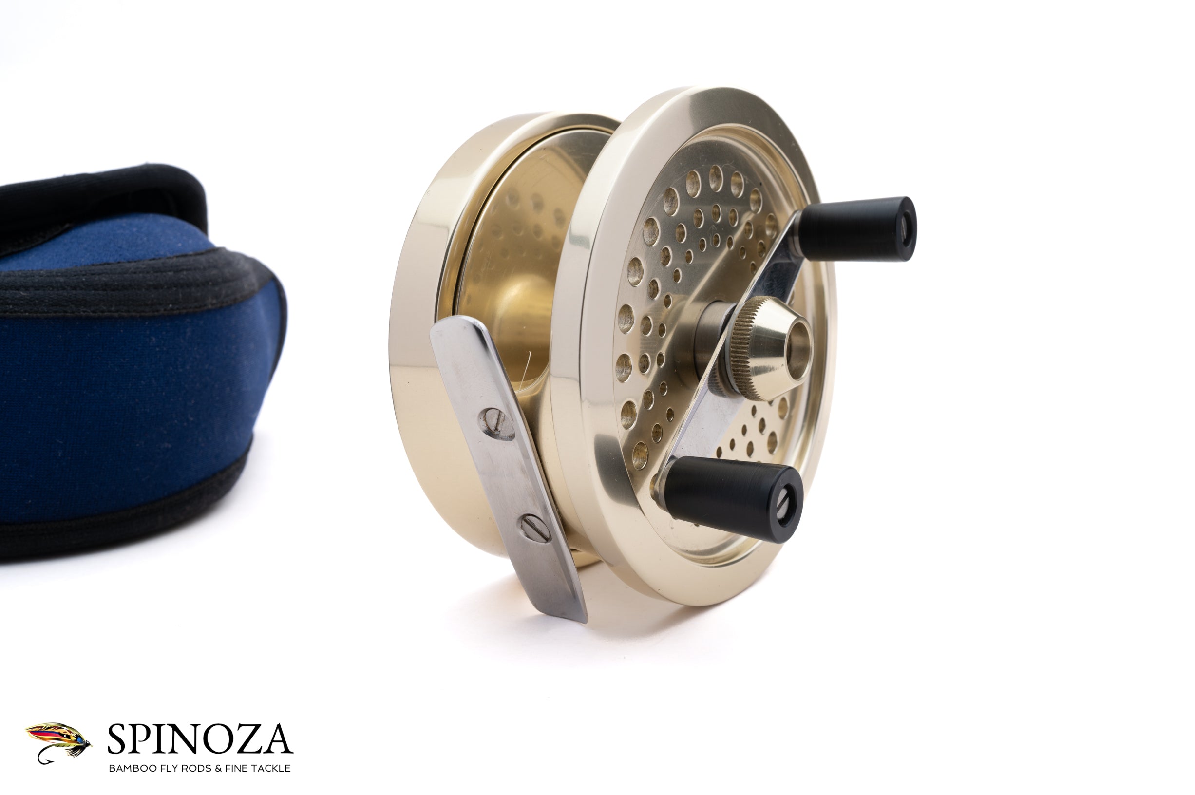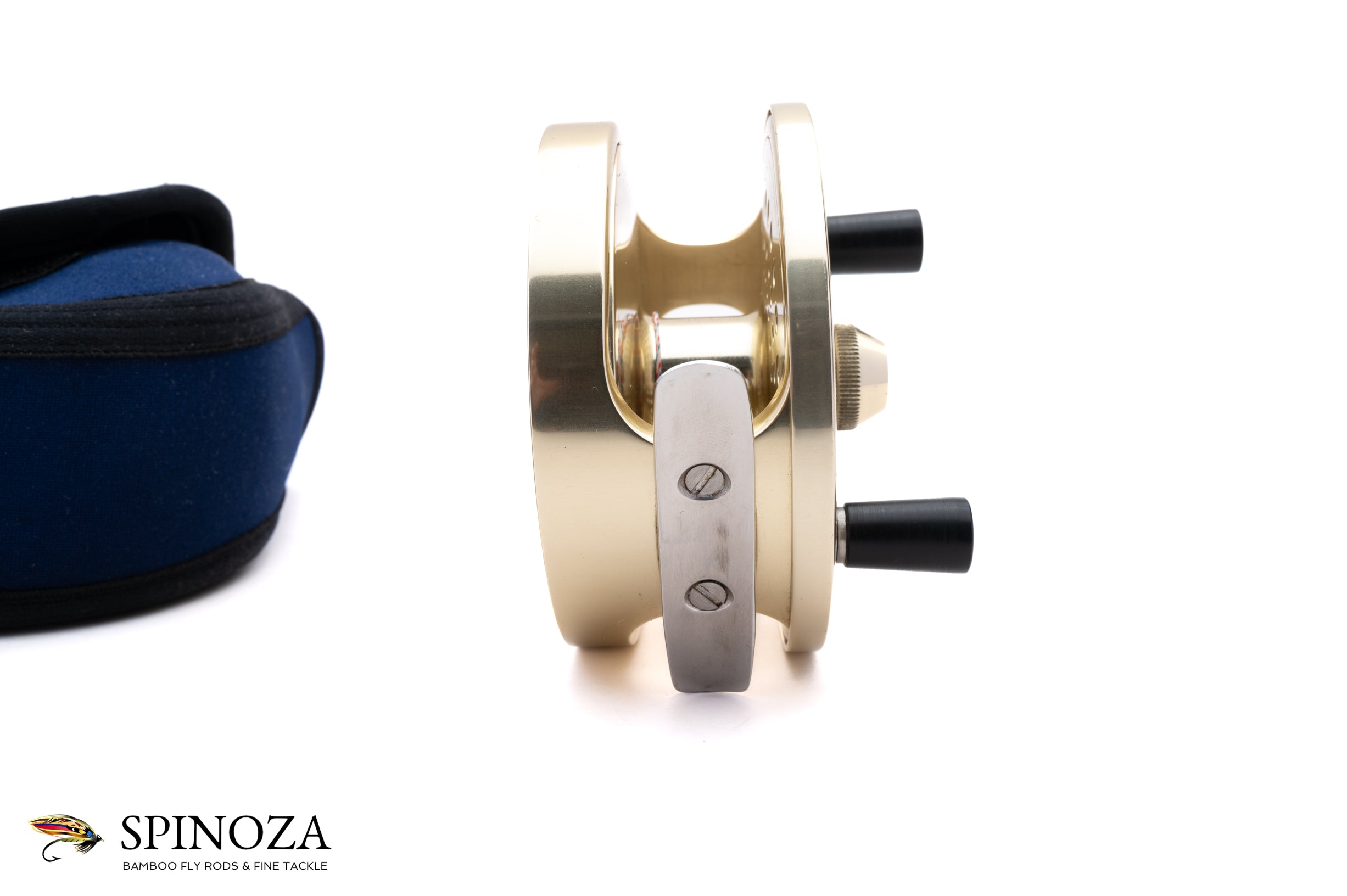 A Fin-Nor #3 fly reel, set up for LHW. Anti-reverse. 3 5/8" diameter with a 1" spool width. Weighs 14.4 ounces on my scale. The reel does not appear to have been fished at all. Dual handles. The typical gold anodized frame and spool with the silver foot. The spool is ported. The reel comes in a navy Fin-Nor neoprene pouch.