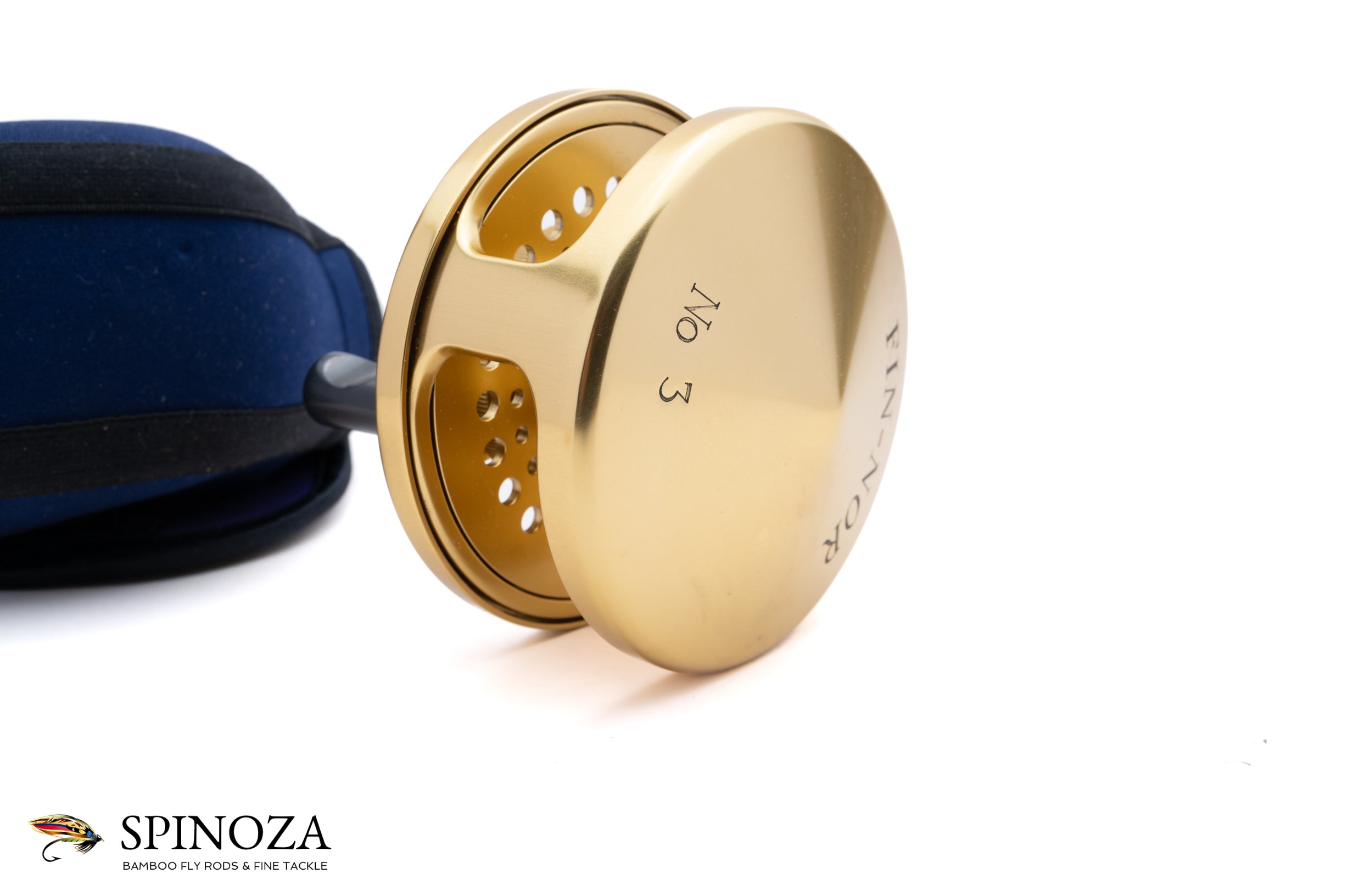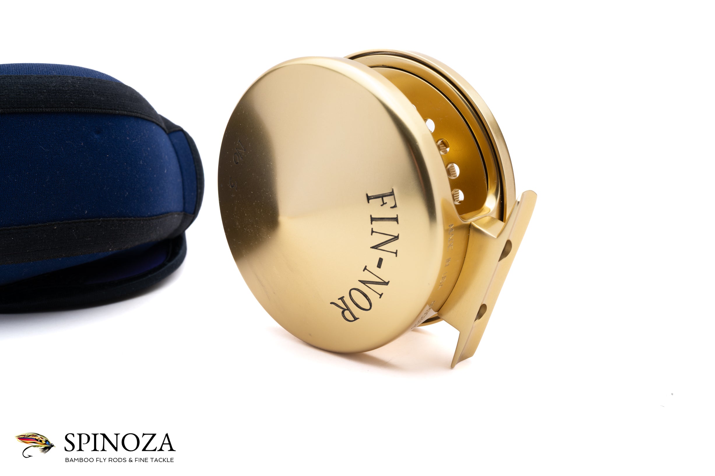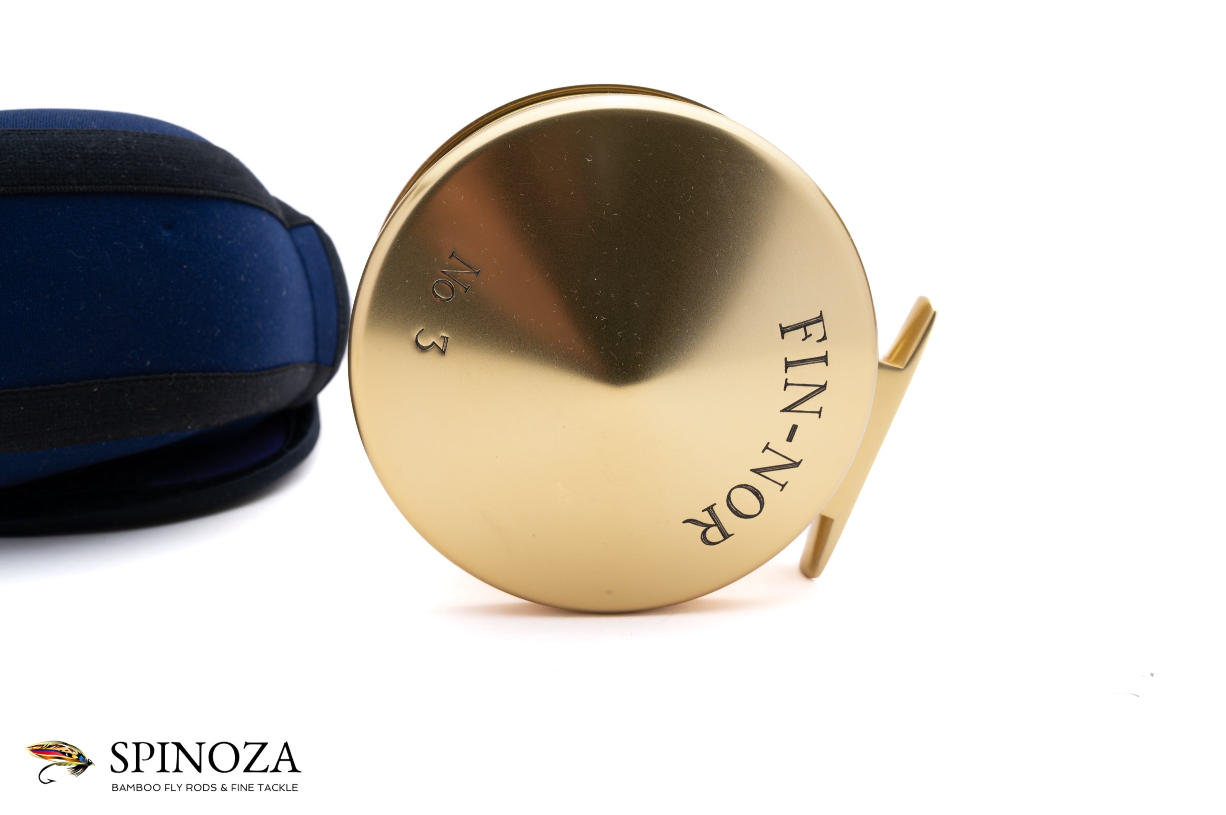 A Fin-Nor #3 anti-reverse fly reel, 3 5/8" diameter and set up for LHW. 1" spool width. Mint, unfished condition. Later single handle style design. Built to hold 250 yds of 20# nylon backing plus 40 yards of fly line. Gold anodized throughout. Serial number ARB0353. Comes with the original Fin-Nor navy neoprene pouch.