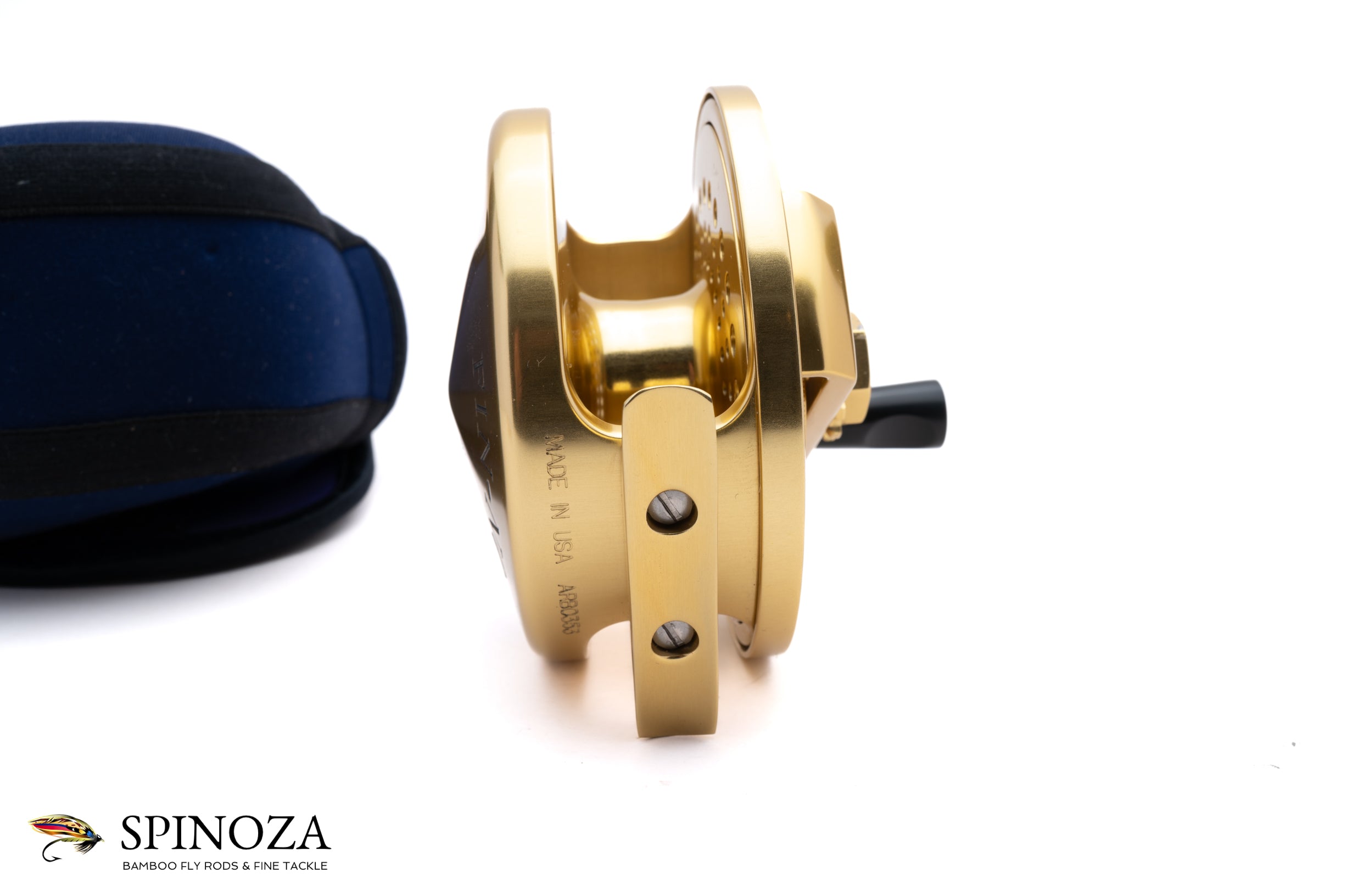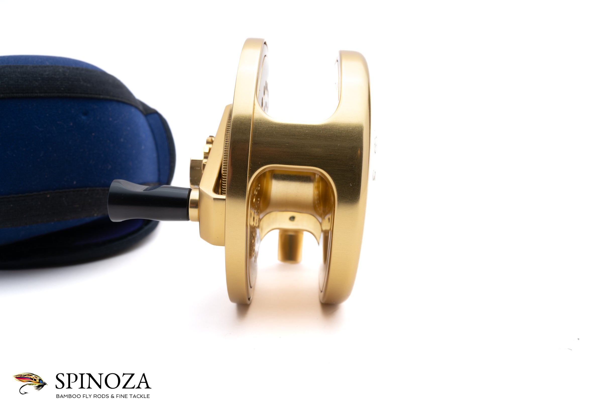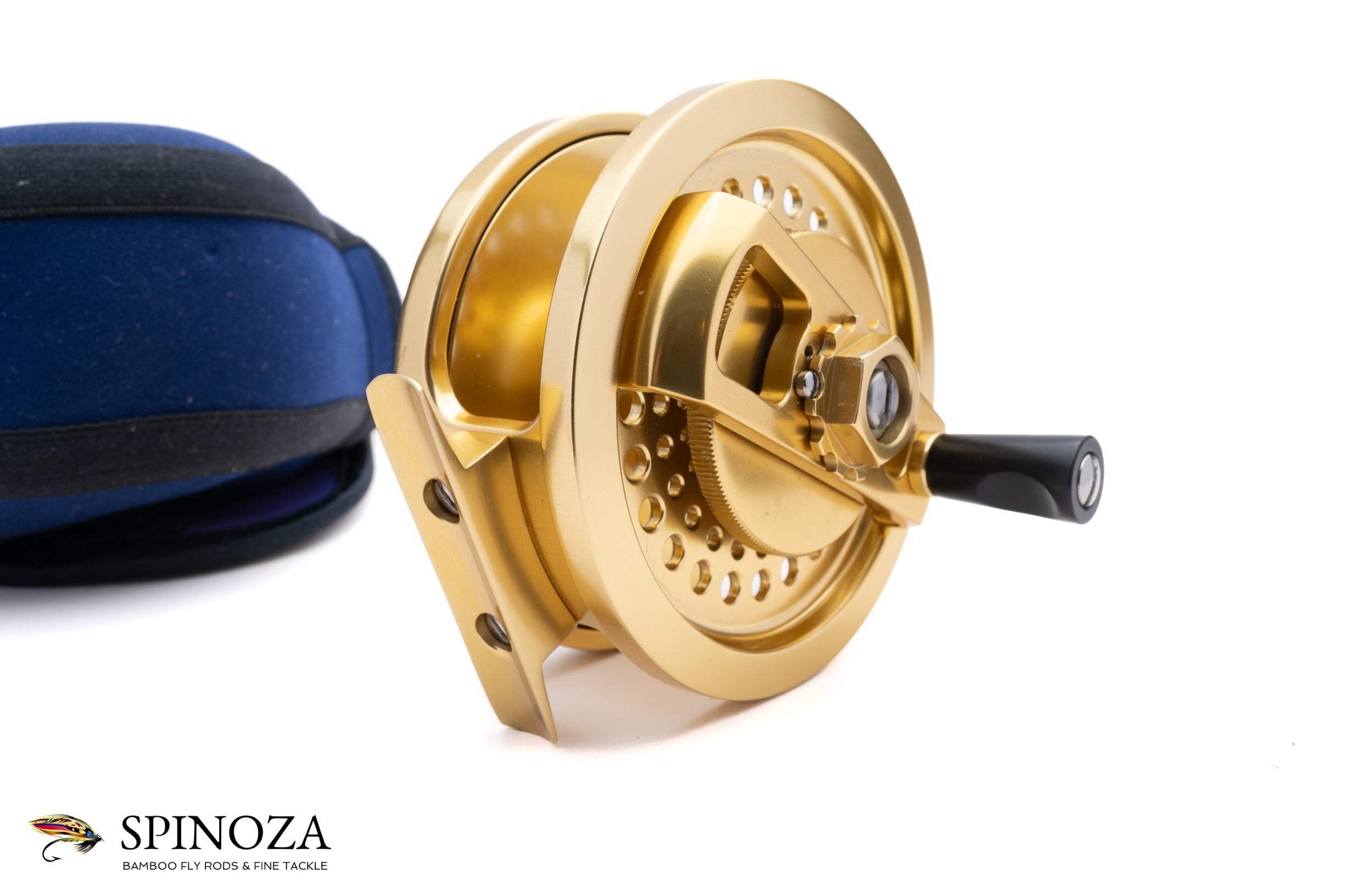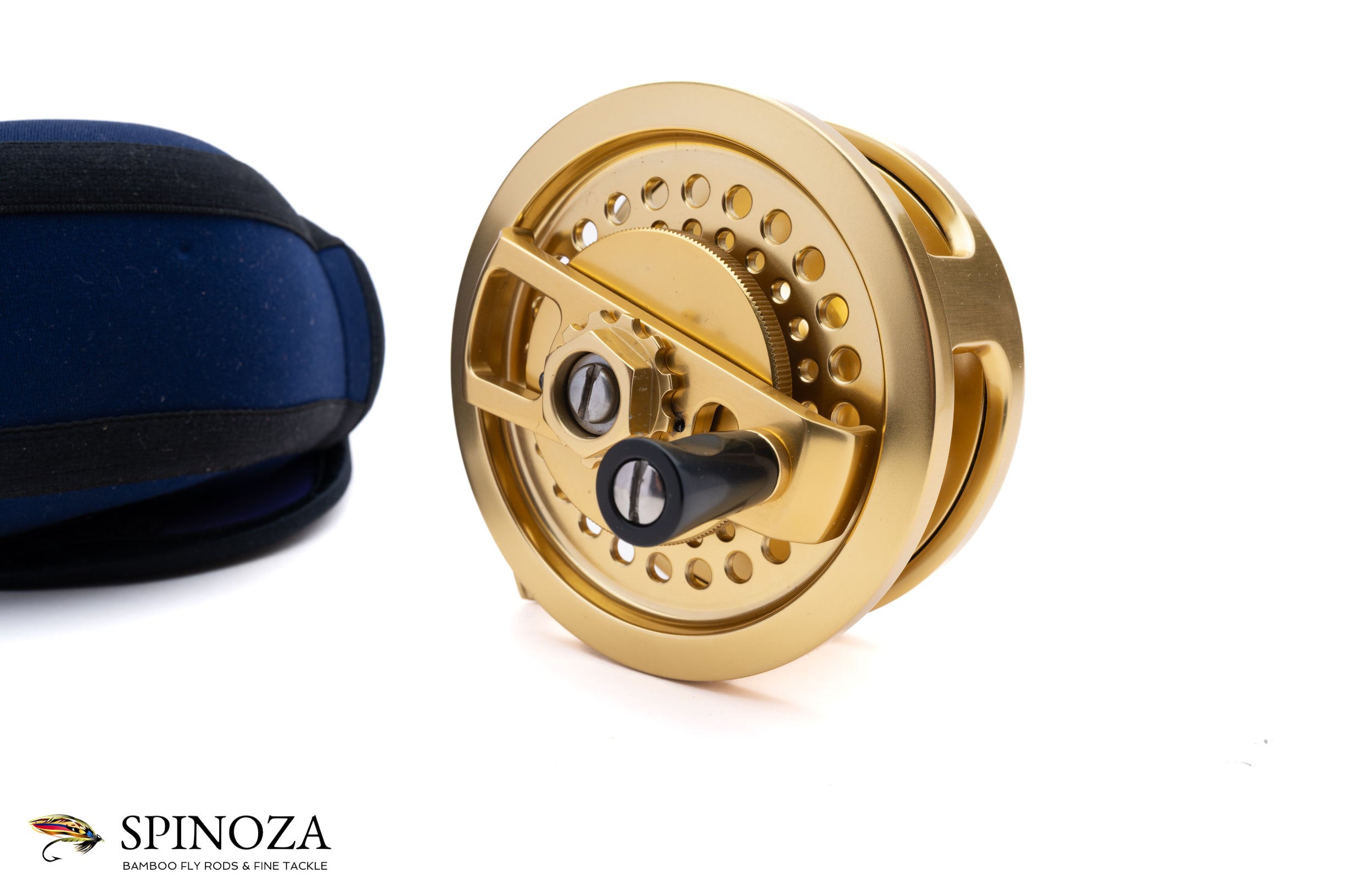 A Fin-Nor #3 anti-reverse fly reel, 3 5/8" diameter and set up for LHW. 1" spool width. Mint, unfished condition. Later single handle style design. Built to hold 250 yds of 20# nylon backing plus 40 yards of fly line. Gold anodized throughout. Serial number ARB0353. Comes with the original Fin-Nor navy neoprene pouch.