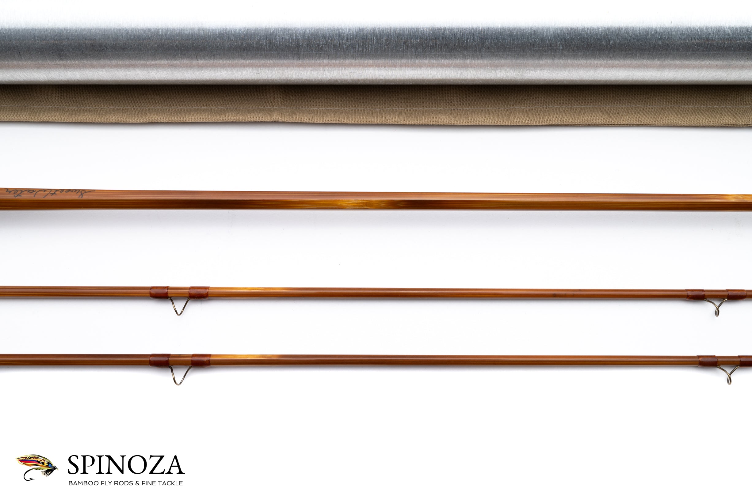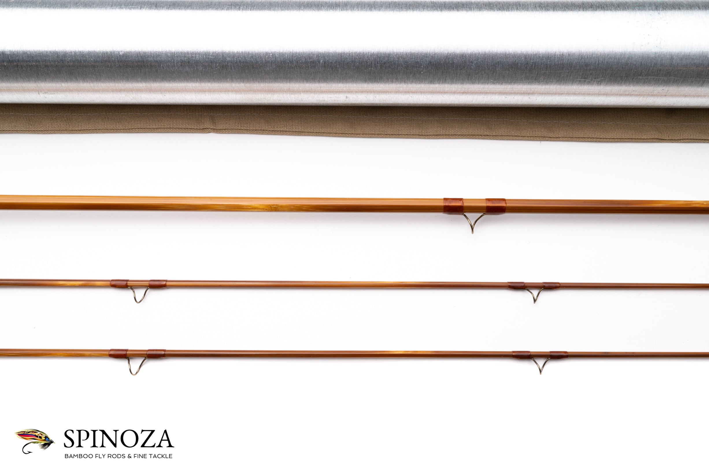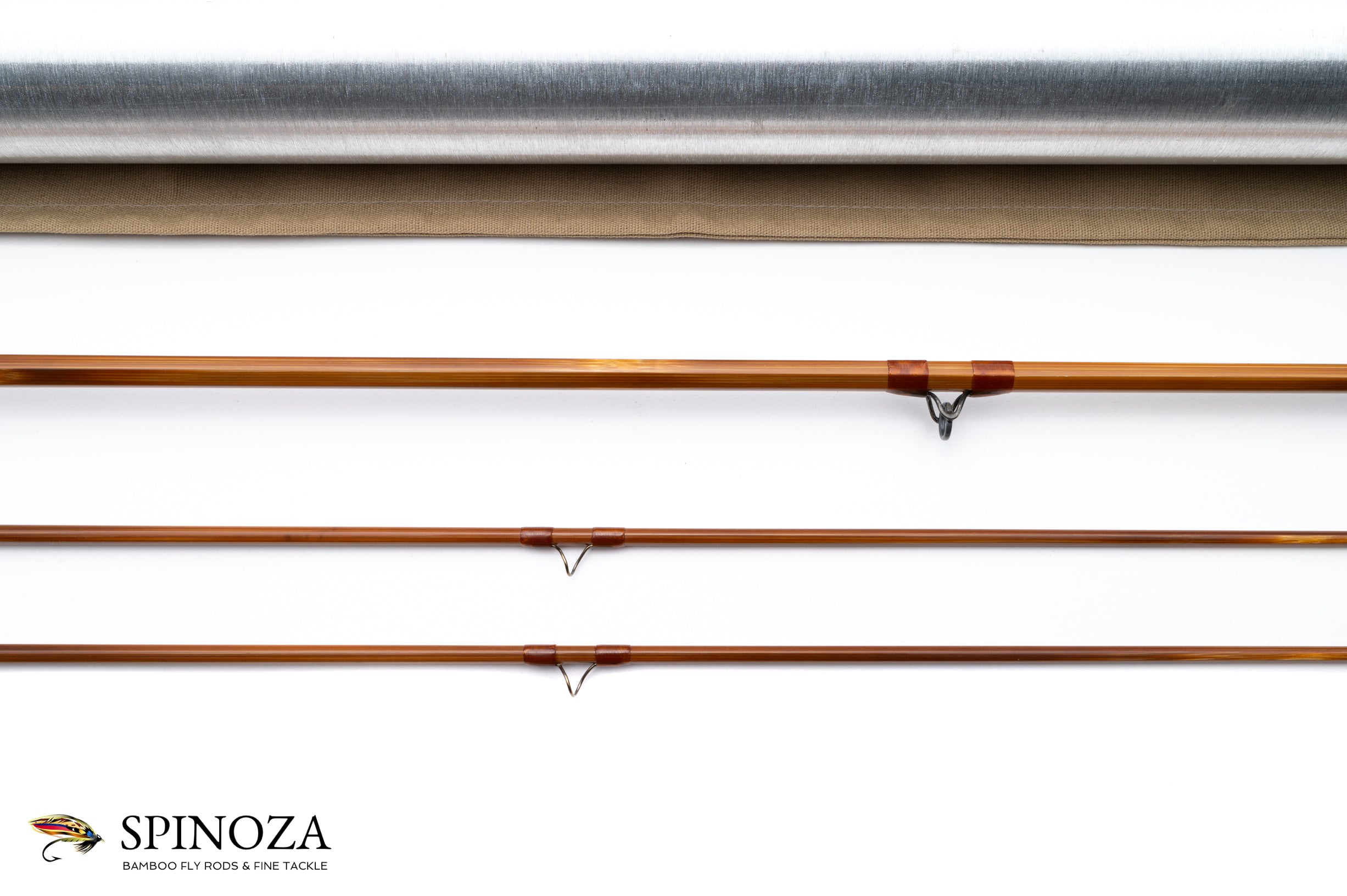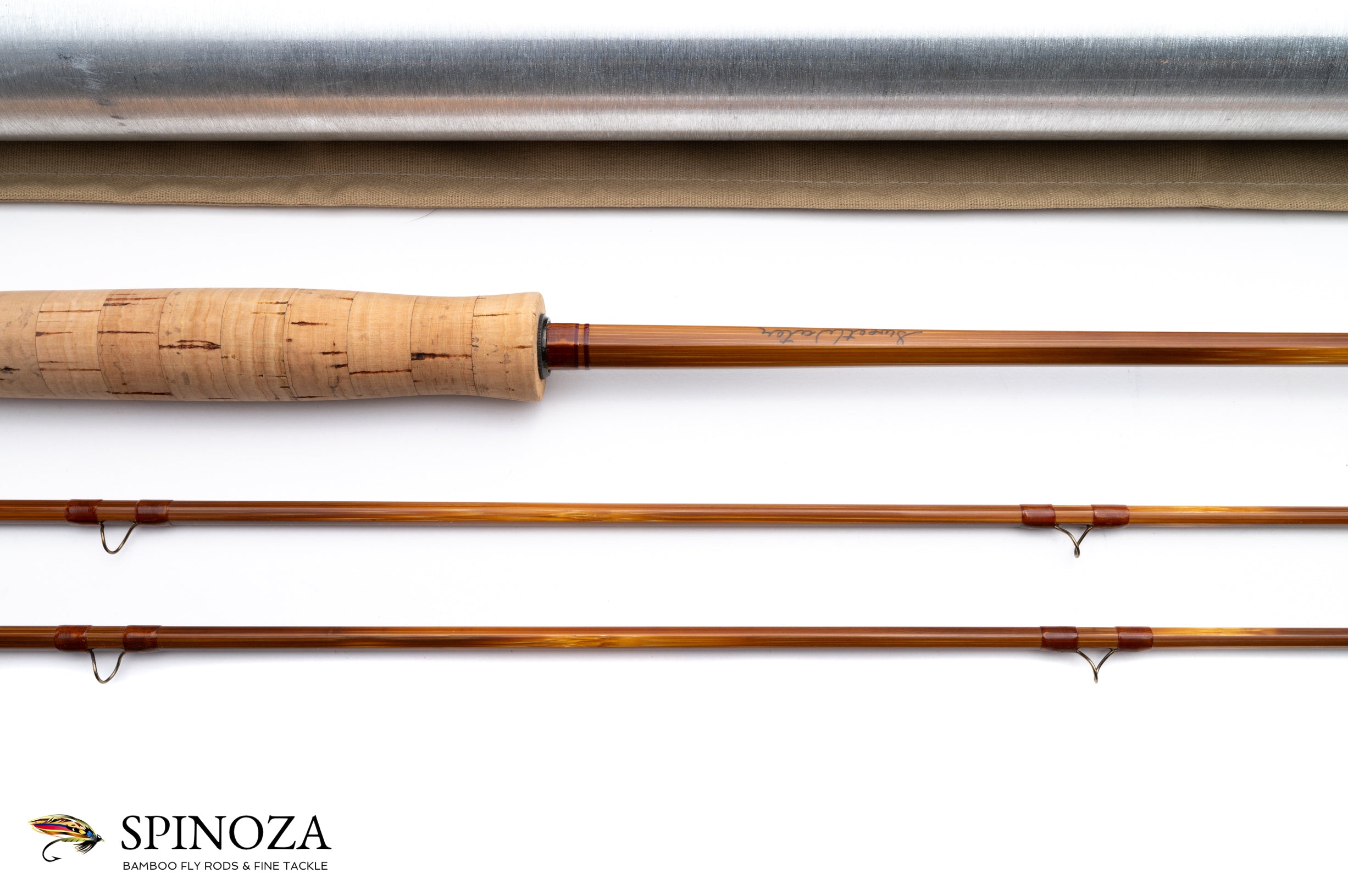 A George Maurer / Sweetwater Rods "Eagle Creek" model bamboo fly rod, 7'3", 2-piece, 2-tips, and built for a #4 or #5 line. Inked "2007-02". The rod weighs 3.8 ounces on my scale. Fast DF action. Flamed cane done in a three up node pattern. Swelled butt. Amber main wraps with cinnamon edges at the keeper. #5 SRMC stripping guide with bronzed snakes. Very light varnish coat. The ferrules are swiss style and oxidized. The cork grip is 6" long and turned to a half wells profile. The reel seat is a mortised and stabilized wood spacer under an oxidized cap and ring. The rod comes from the Maurer family after George's passing (as noted in the accompanying paperwork). The rod packs into a tan cloth bag and brushed aluminum tube with brass fittings.