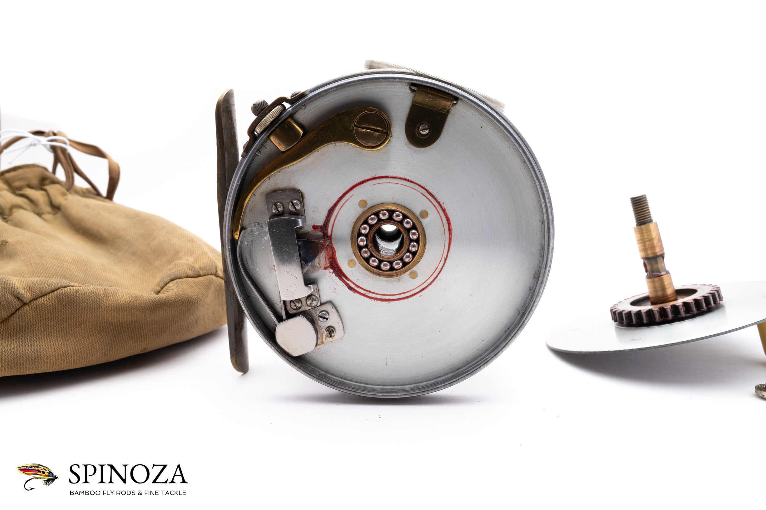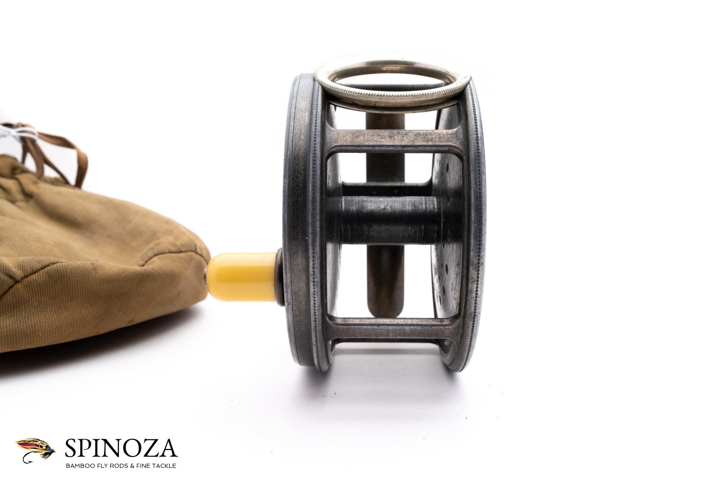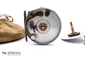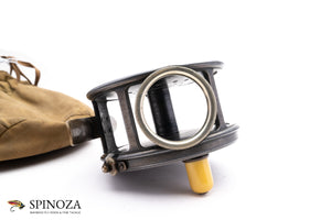 A very nice Hardy Perfect 4 1/2" wide drum salmon reel with the desirable 1912 check. A fine specimen here in excellent original condition, with very little wear for its age. The patina is in terrific shape and the reel is devoid of any issues that I could find. The foot has a very slight, almost imperceptible bend on one end but that's about it. Very nice smooth click and the spool is tight with no wobble whatsoever. Rotating nickel silver lineguard. There is no line burn on the pillars, which is rare in a reel of this vintage. The winding plate also has the initials "AB" stamped inside of a tiny circle, denoting the reelmakers Alfred/Freddie Broadley who worked on many of these early salmon perfects. The smooth brass foot is 4 1/8" long and is unmolested, with only the very slight bend previously noted. The patina is also excellent throughout. The ivorine handle spins freely with a small bit of play, and the reel has the handsome turks head nut. Put it all together and this is definitely one of the nicer examples of this rare model that you'll come across. The reel packs into a handsome Hardy selvyt drawstring pouch.