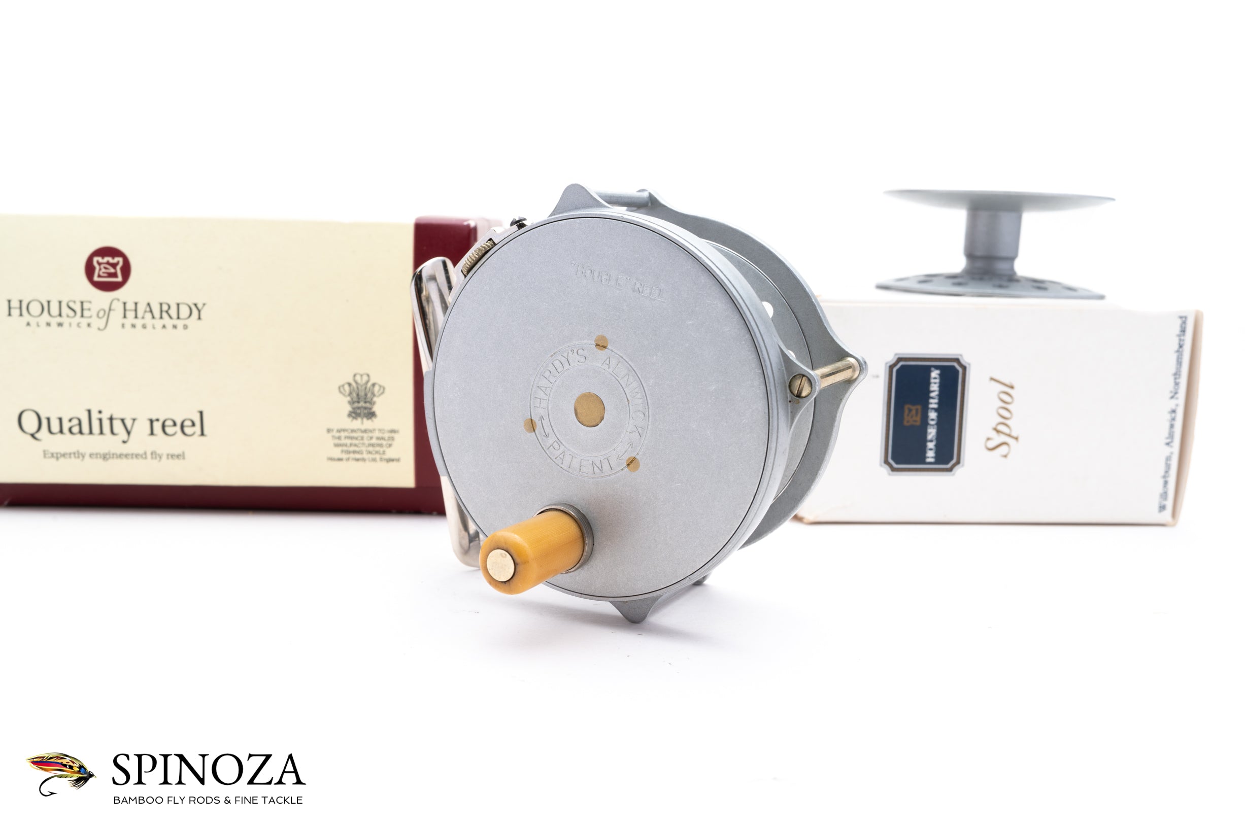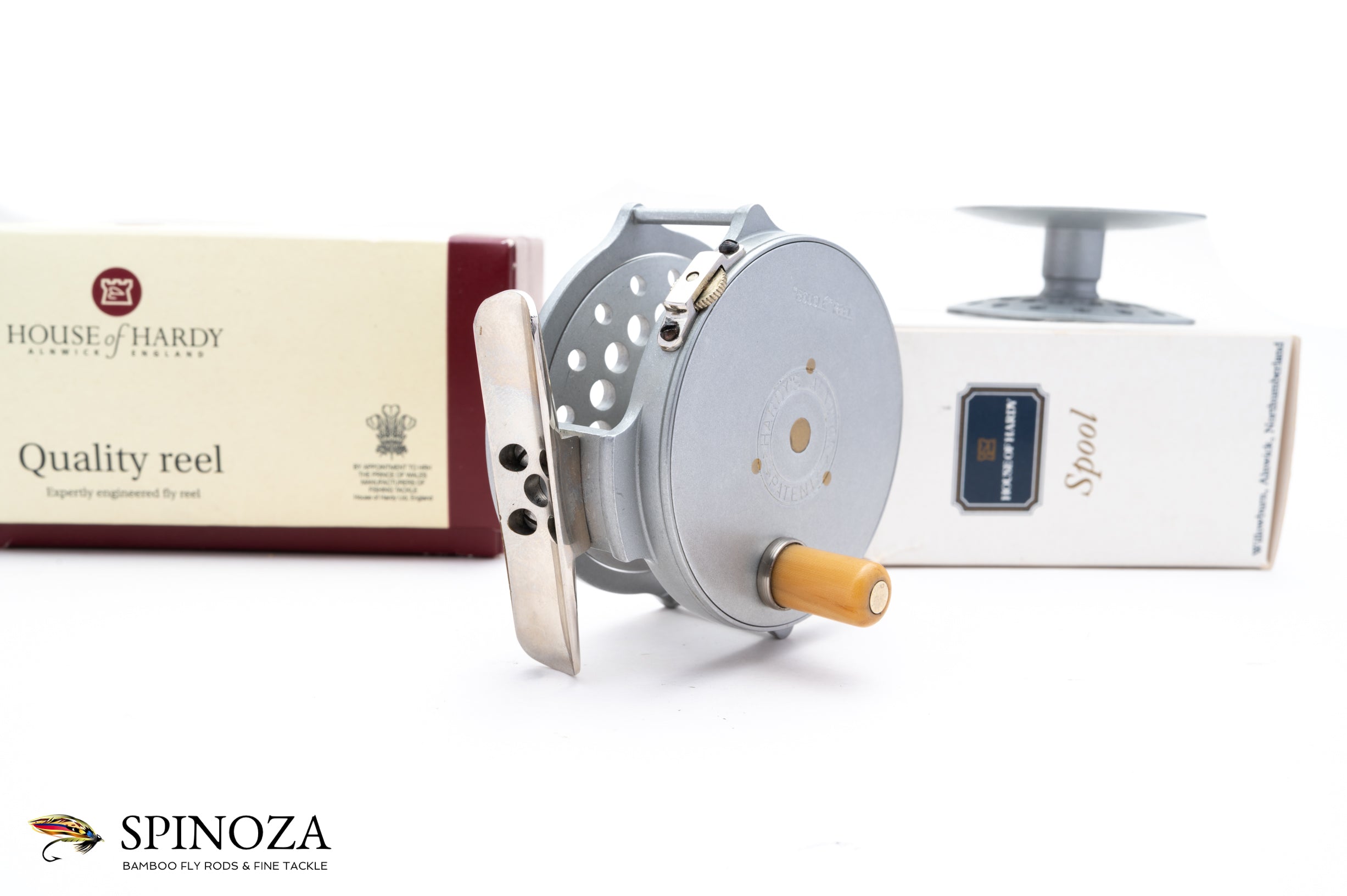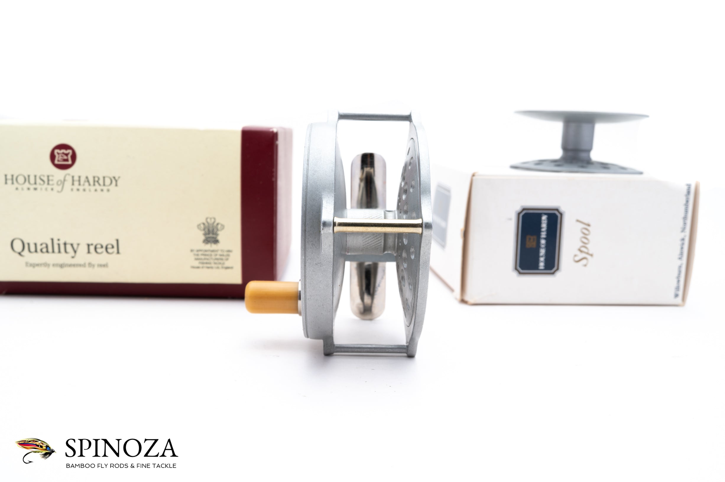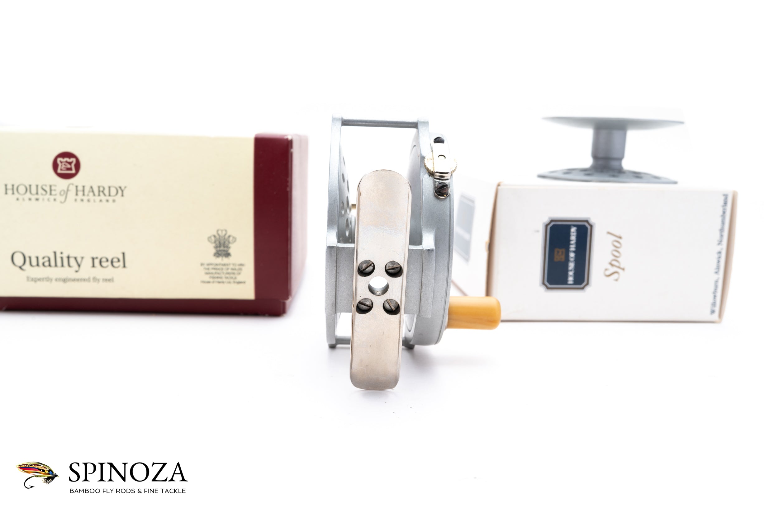 A nice Hardy Bougle Limited Edition fly reel commemorating the 1903 Hardy Bougle model. 2 1/2" frame diameter with the iconic raised pillar design. Mint condition, never lined. This reel also comes with a spare spool. These reels were all made in England and this particular one was made by I.W. Evans and is serial #242 - both the maker's initials and serial number are stamped on the inside of the frame. The reel features a 1903 style check and is silver anodized throughout with polished silver foot. It has a nice smooth click and the tension adjuster works perfectly. The reel does not come with the accompanying Hardy leather block case but does have Bougle boxes for both reel and spool.