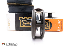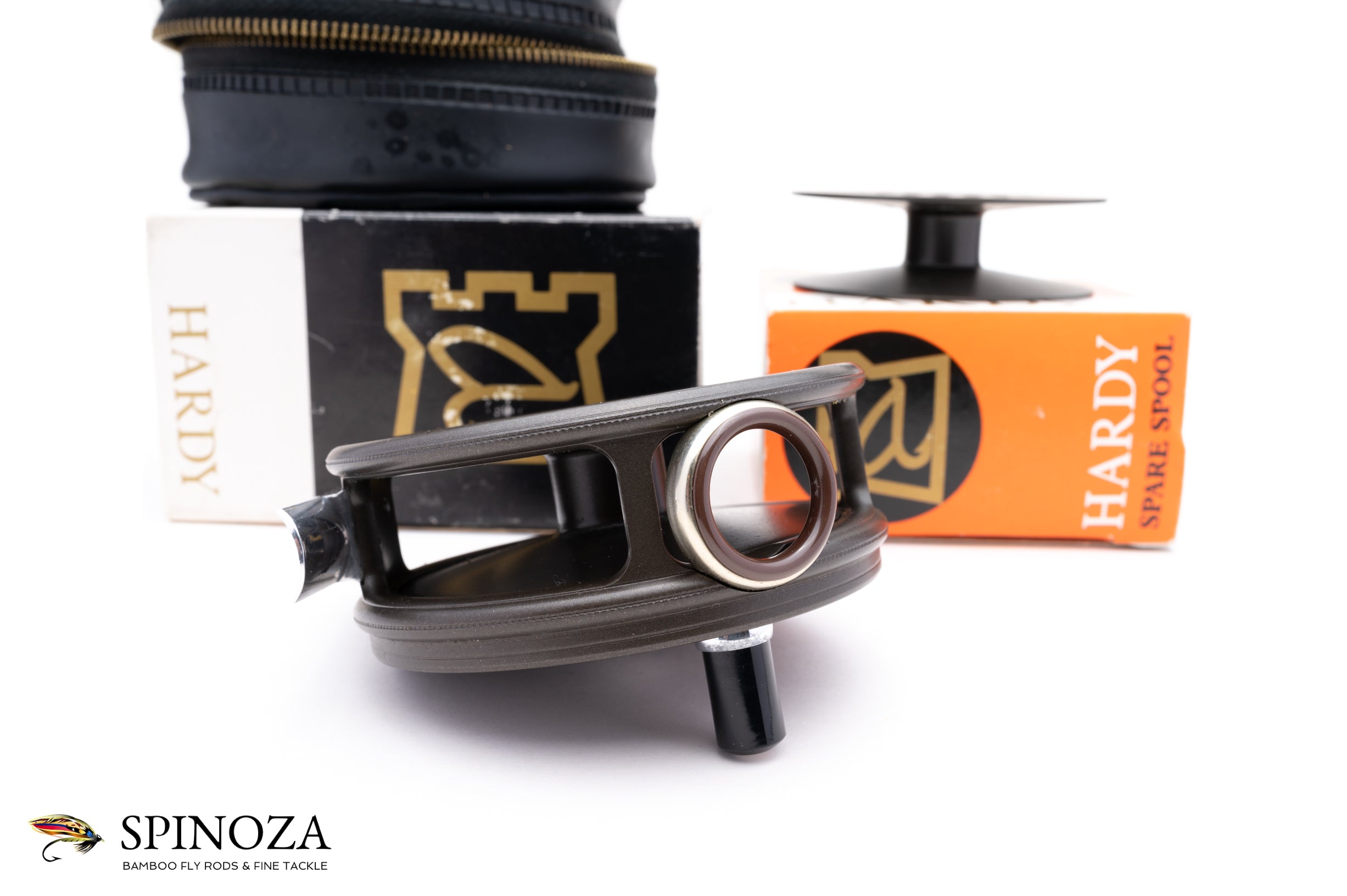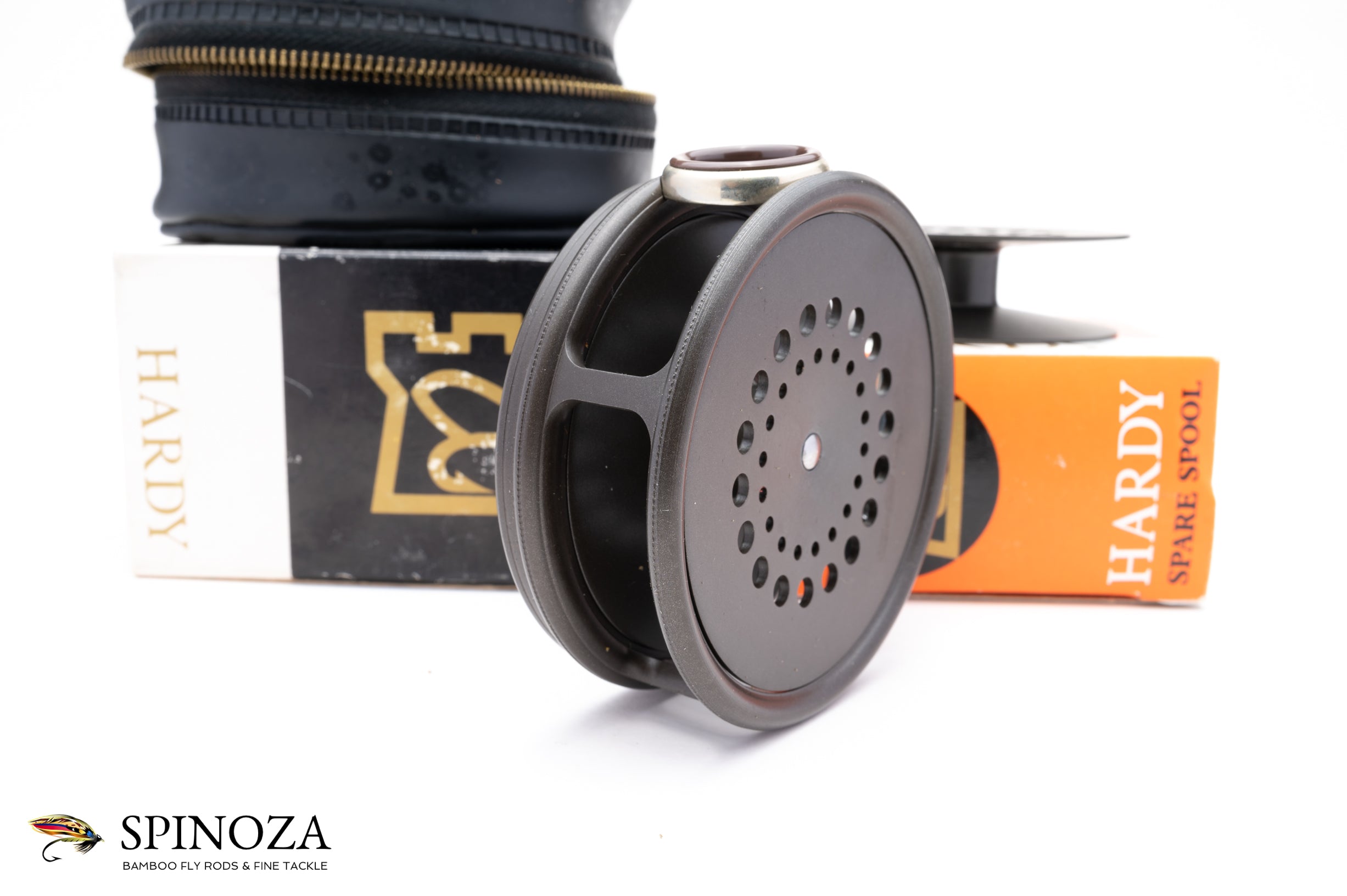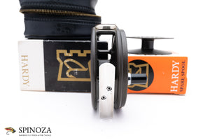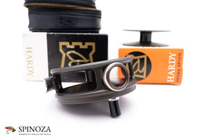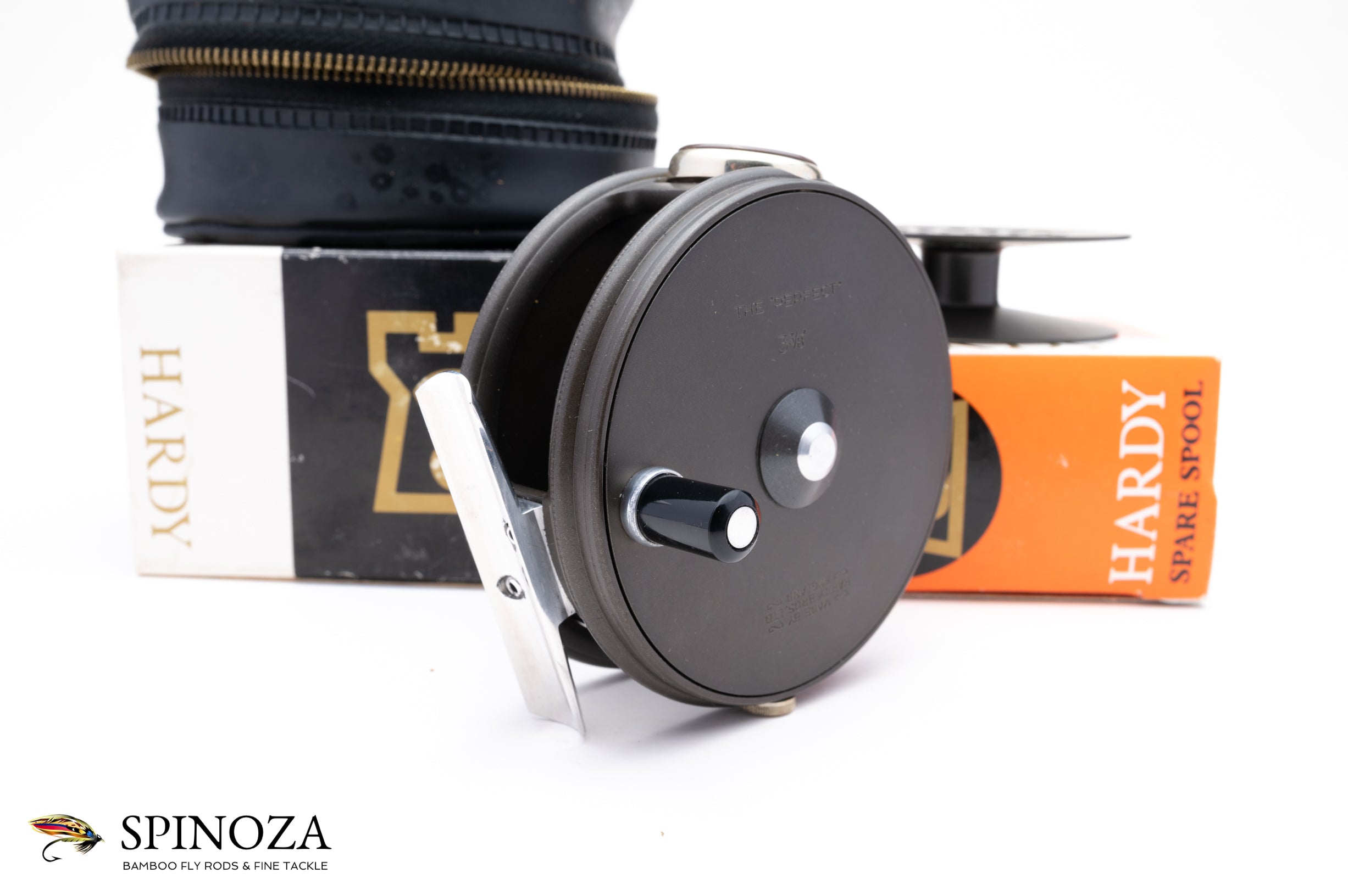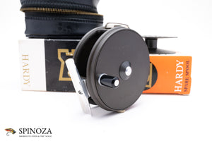 A nice Hardy Perfect fly reel with a spare spool, 3 3/8" diameter and set up for RHW. Mint, unused condition. This is a later enamel finish model. Smooth alloy foot with an ebonite handle. Ceramic line guard. The drag has a smooth pleasing click and the tensioner works as it should. Designed to hold #6/7/8 lines. The reel packs into the original black vinyl case and box and the spool packs into the original box as well. A fine example of this later model perfect.
