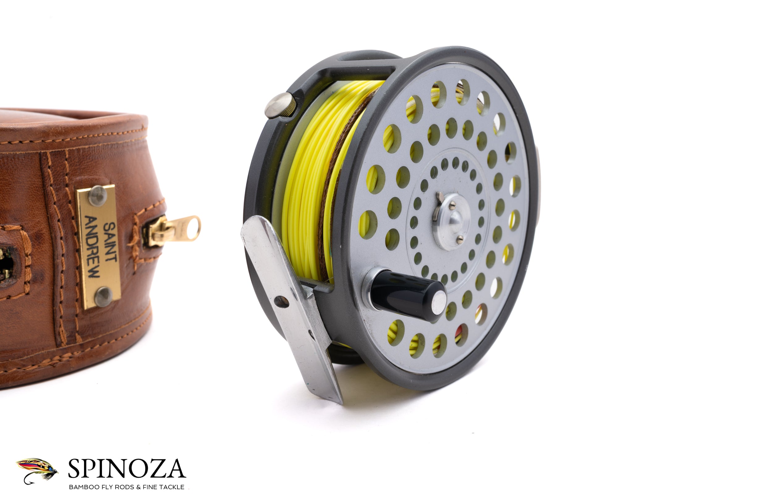 A relatively scarce Hardy St. Andrew fly reel, 4 1/8" diameter, and set up for left-hand wind. Near mint condition with a few very minor traces of wear here and there. The reel could not have been fished much. This was the largest reel in the Hardy lightweight series and boasts an adjustable click/drag. Nickel silver U-shaped line guard on the frame. Ebonite handle and ribbed alloy foot. There is a line loaded on the reel. The reel packs into a heavy-duty leather zip pouch with a small plaque on the side noting the reel model name.