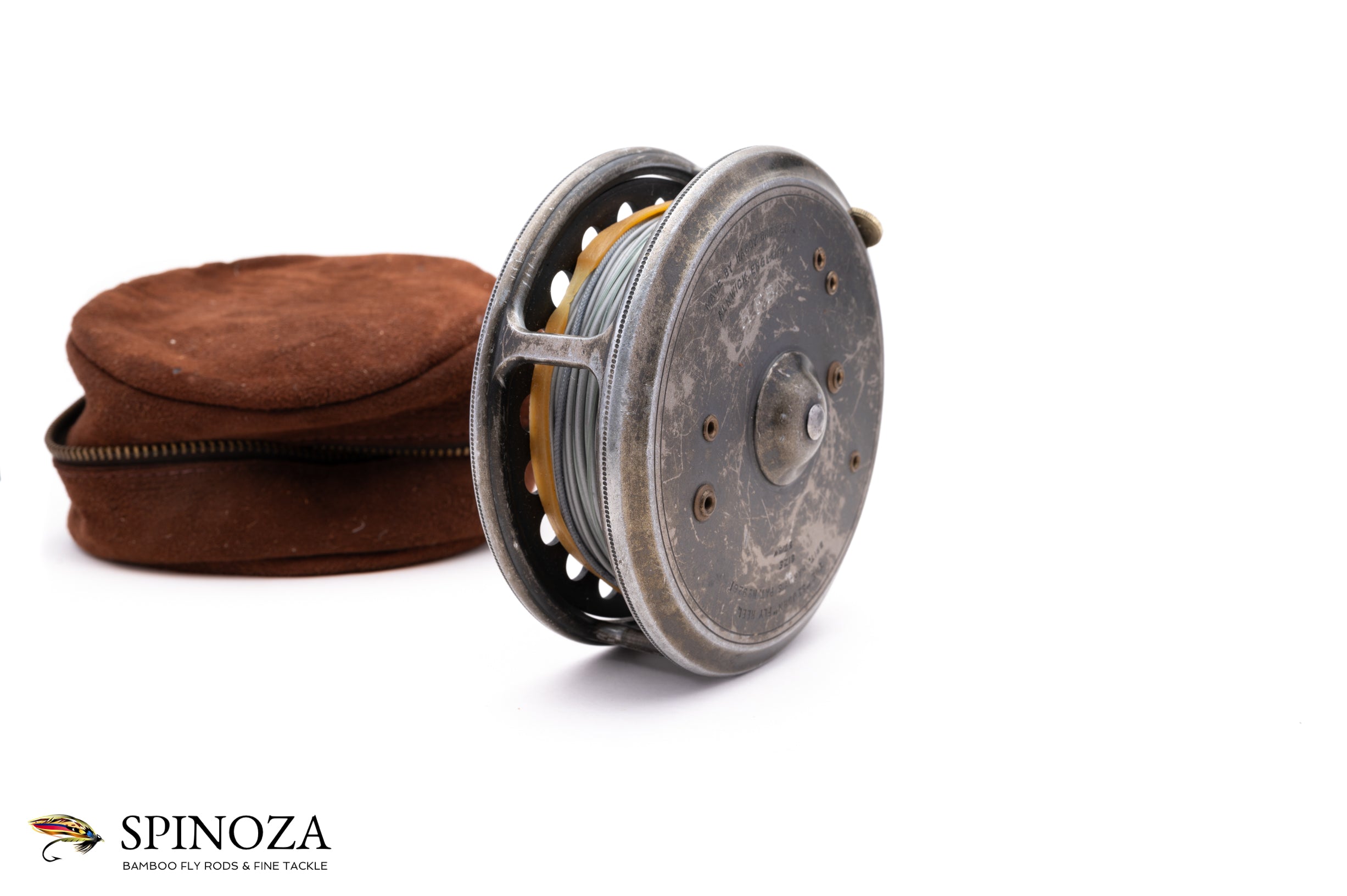 A nice Hardy St. John fly reel, 3 7/8" diameter and set up for LHW. An earlier three screw model with the initials "JS" (Jimmy Smith) stamped into the inside of the frame. Duplicated Mark II style check. Good used condition with plenty of cosmetic wear and loss of finish, but no major issues that I could find. Canoe-style ribbed brass foot. Nice loud click and the tension adjuster works as it should. Nice tight spool. A line and backing are currently loaded on the reel. The original owner's initials are engraved in small block letters on the backplate. The reel packs into a non-original suede zipper pouch.