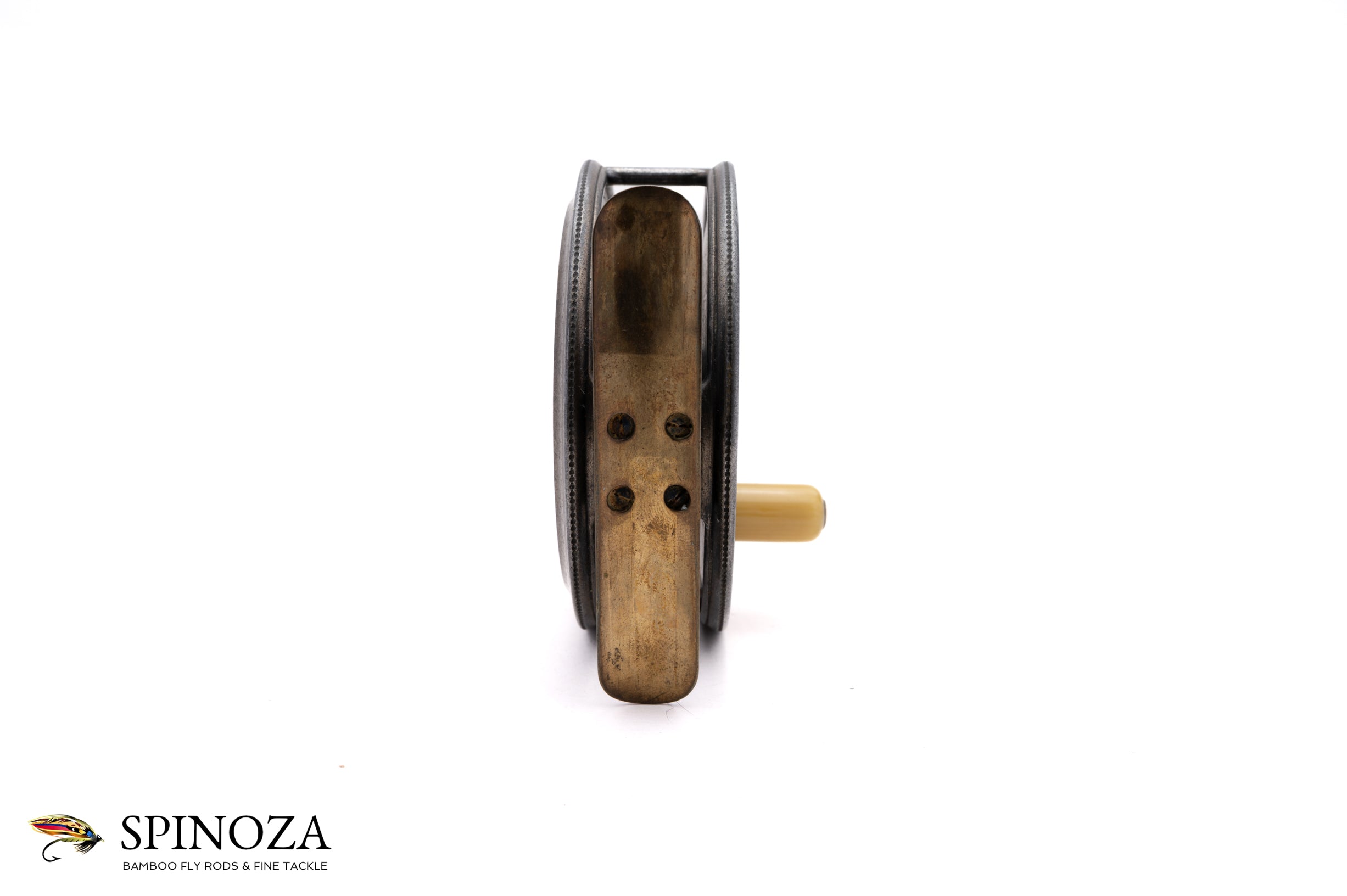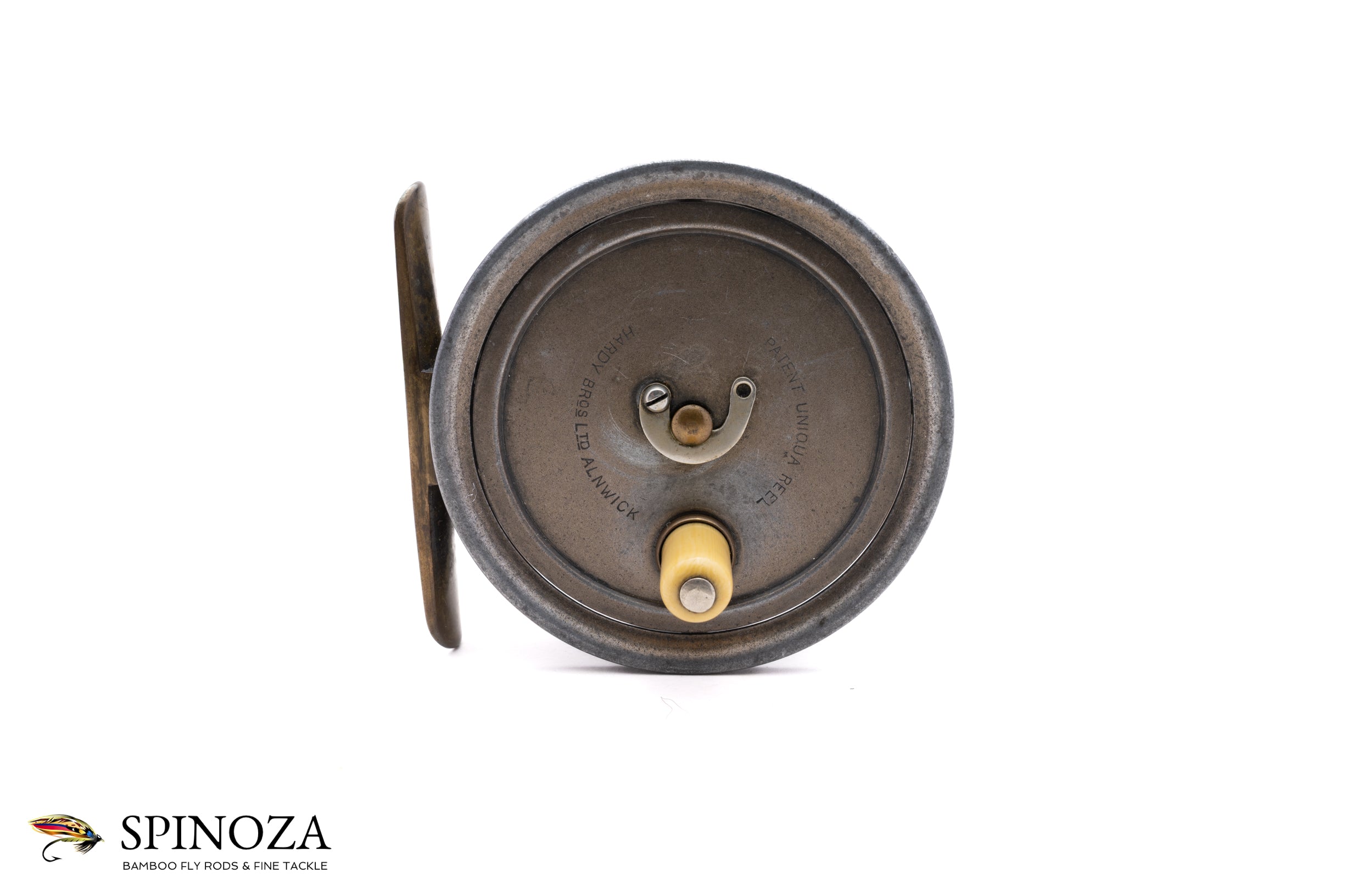 A scarce Hardy Uniqua fly reel, 3-1/8" diameter, set up for the traditional right-hand wind. This is a circa 1910 model with a unique check mechanism that Hardy used for a brief period with the Uniqua. The reel also boasts several interesting features, including the semi-circular stamping on the spool only, while the backplate sports two concentric targets around the spindle cover (and no writing). I can't recall seeing this combination on this model before. The reel has a horseshoe latch, an ivorine handle, and a smooth brass foot. Excellent overall condition with some typical finish loss throughout, but no major issues, and the spool is remarkably tight for this model. The inside of this frame sports the initials "JS" (Jimmy Smith, 1908–1960) and the frame and spool have matching parts stamps. No bag. A very fine and interesting example of this model.
