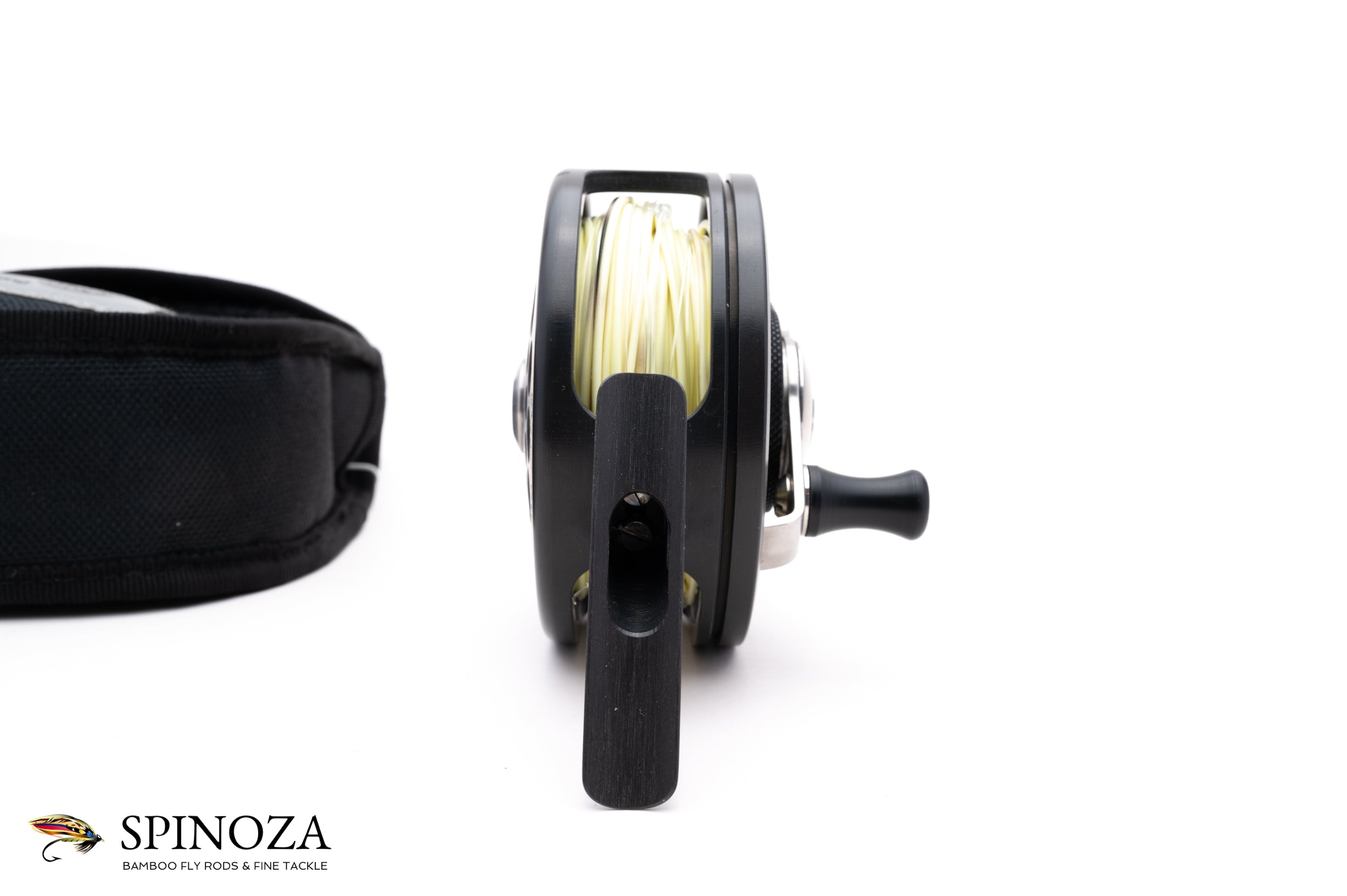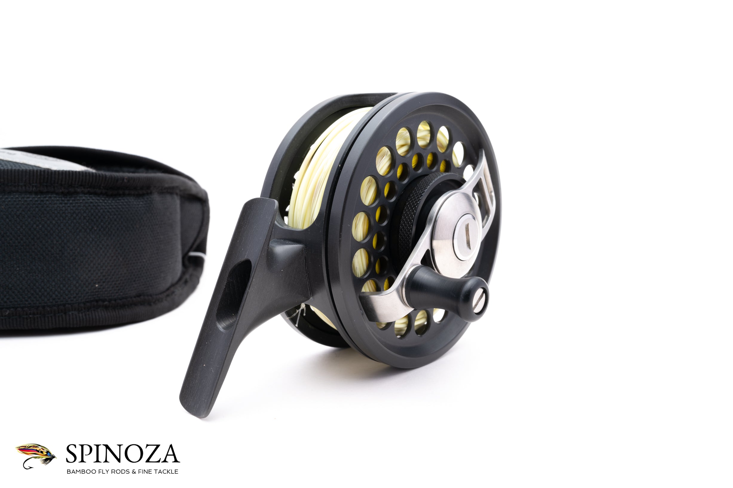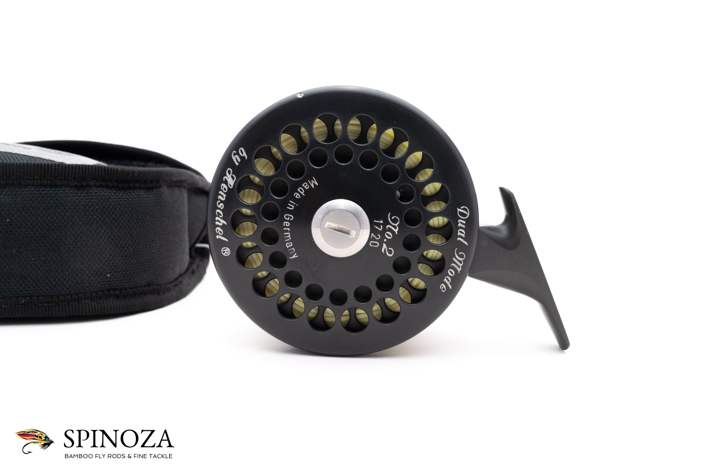 A Henschel Dual Mode #2 fly reel, 3.38" diameter and set up for RHW. The reel weighs 11.4 ounces with a line and backing loaded on it. Made in Germany. I believe this was machined from Titanium for extra corrosion resistance. Dual mode drag with porting on both sides and a "foot forward" design. Good used condition with few nicks on the frame edge from use. The drag is adjusted via a dial under the handle. Designed to hold #7 and #8 lines and approximately 200 yards of backing. The reel packs into the original black cordura pouch.