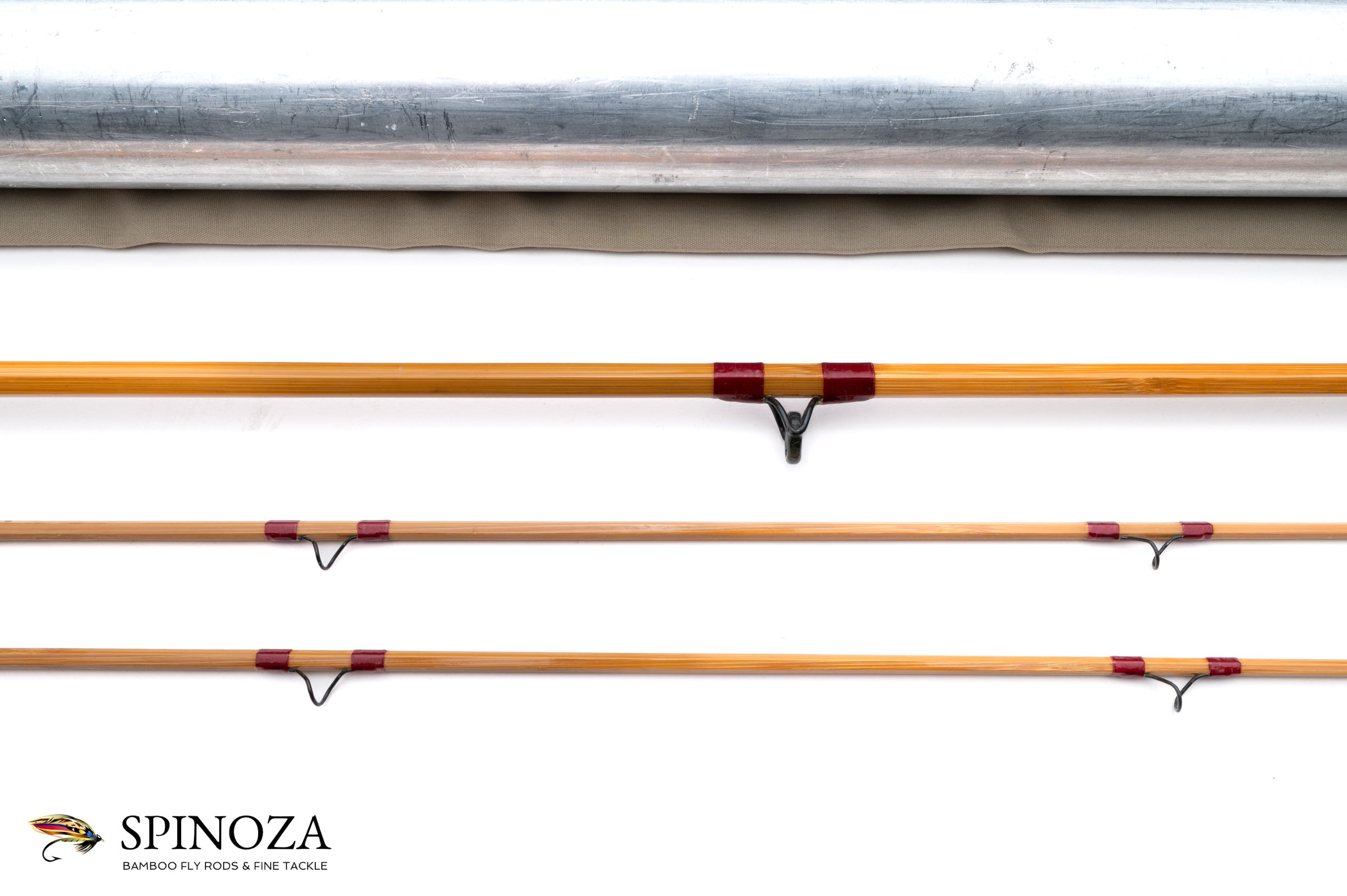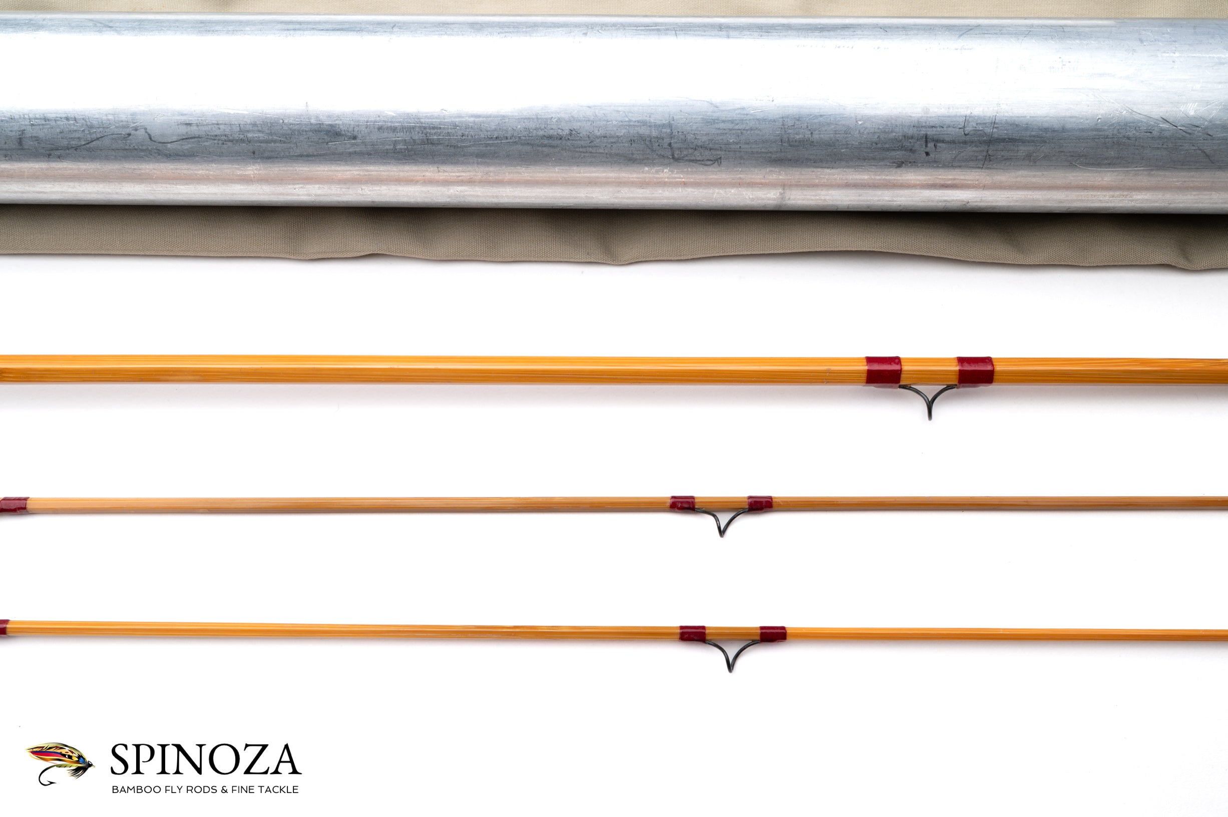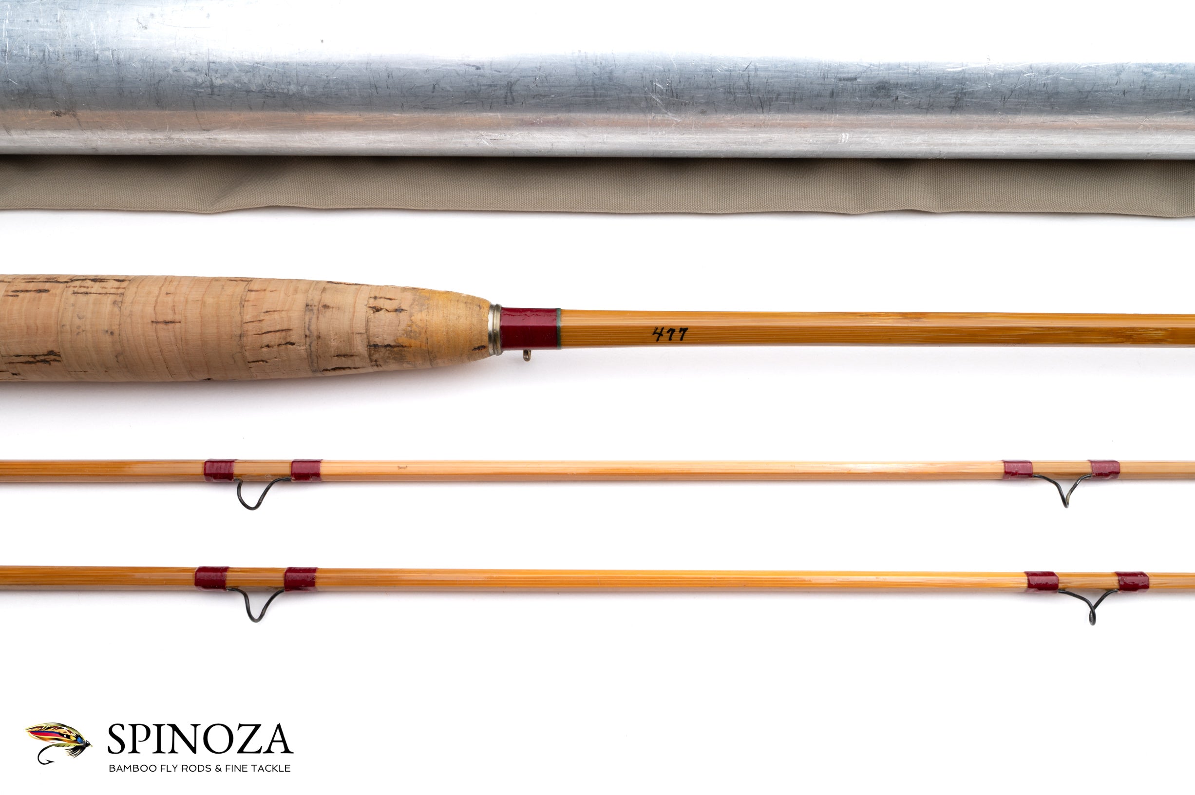 A scarce H.L. Leonard 66L bamboo fly rod, 8', 2-piece, 2-tip, and built for what feels like a #5 line. 4 ounces. Serial #477. Used condition, with some ridging to the grip from cleaning. The ferrule fits are serviceable but not quite factory. There is a wee bit of downward set in the tips. Blond cane done in a three-up node pattern. Brush-coated varnish. Red/maroon wraps. Carbide stripper and black snake guides. The step ferrules are polished bright. The action is on the slower side. The medium cigar grip is 6" long. The reel seat wood is varnished butternut with an aluminum downlock square thread screw lock, and a nickel silver pocket cap with the stamp "H.L.L., H.L. Leonard Rod Co., Makers." The poplin bag has a stiffener. The aluminum tube has brass top, collar, and bottom but no Leonard data sticker.