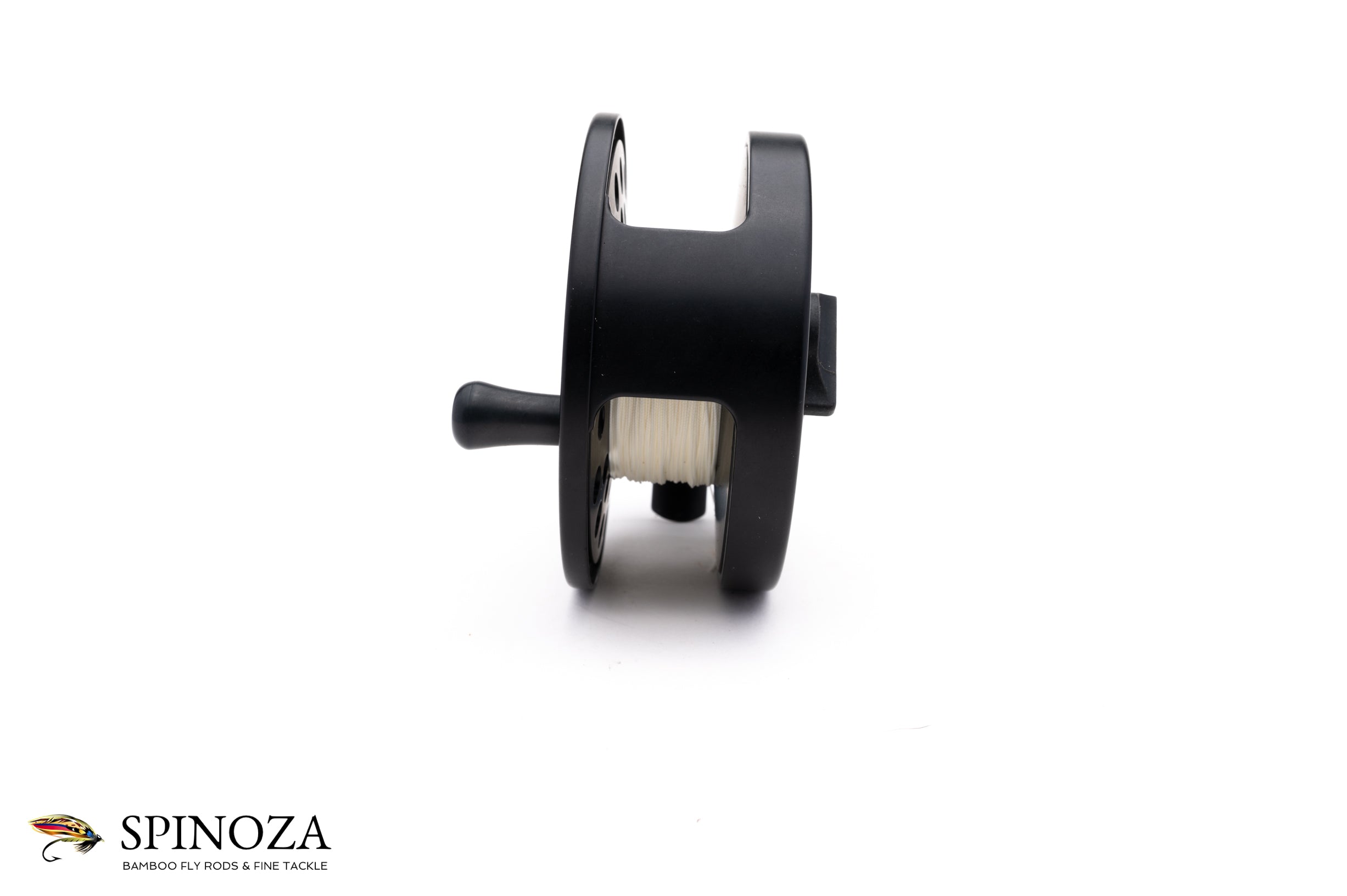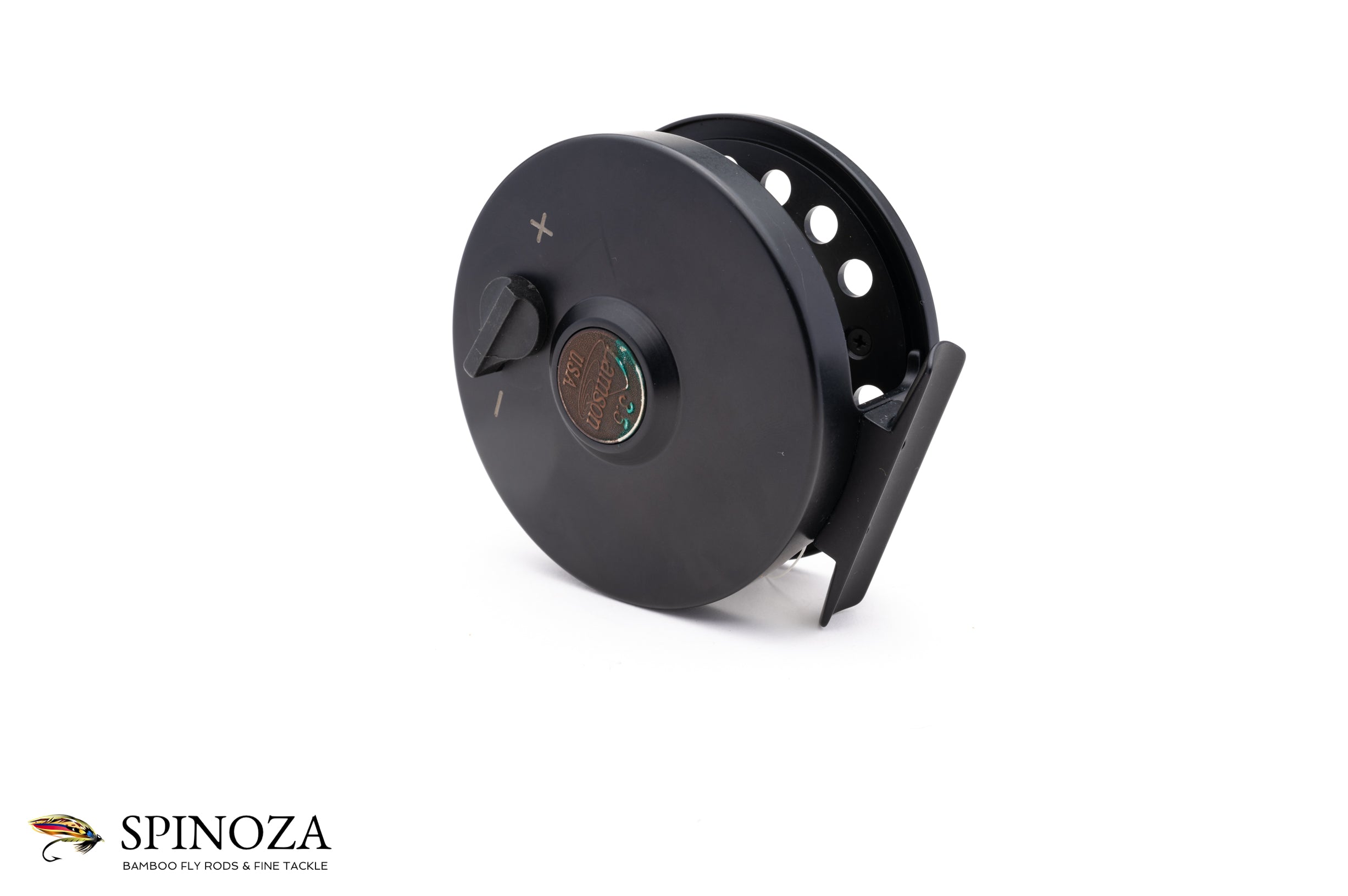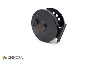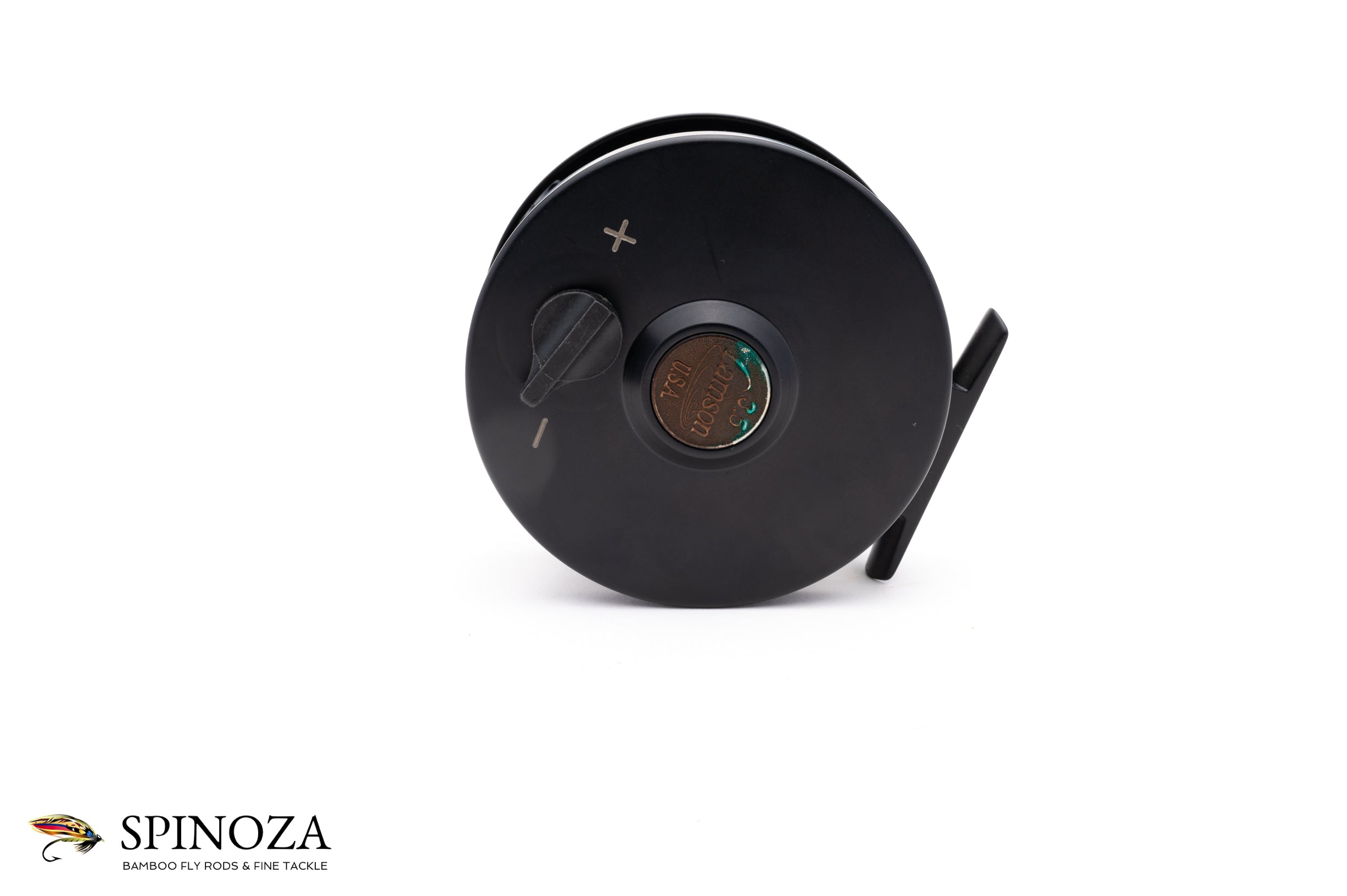 A Lamson 3.5 Trout reel, 3 1/2" diameter and set up for RHW. Near mint condition with just a few tiny mounting marks on the foot, but the reel is exceptionally clean otherwise. The reel weighs 8.8 ounces with backing loaded on it. Black anodized throughout with a ported spool ported. The drag is adjusted via a lever on the backplate. No bag.
