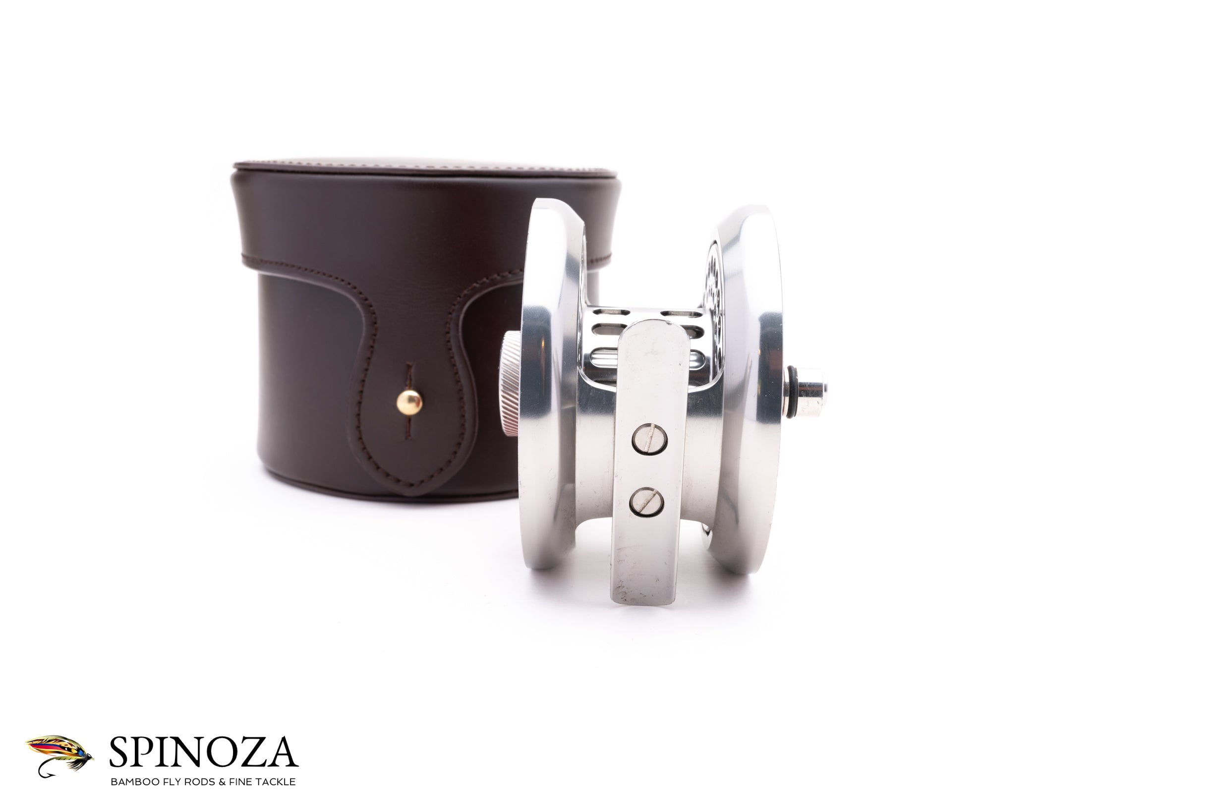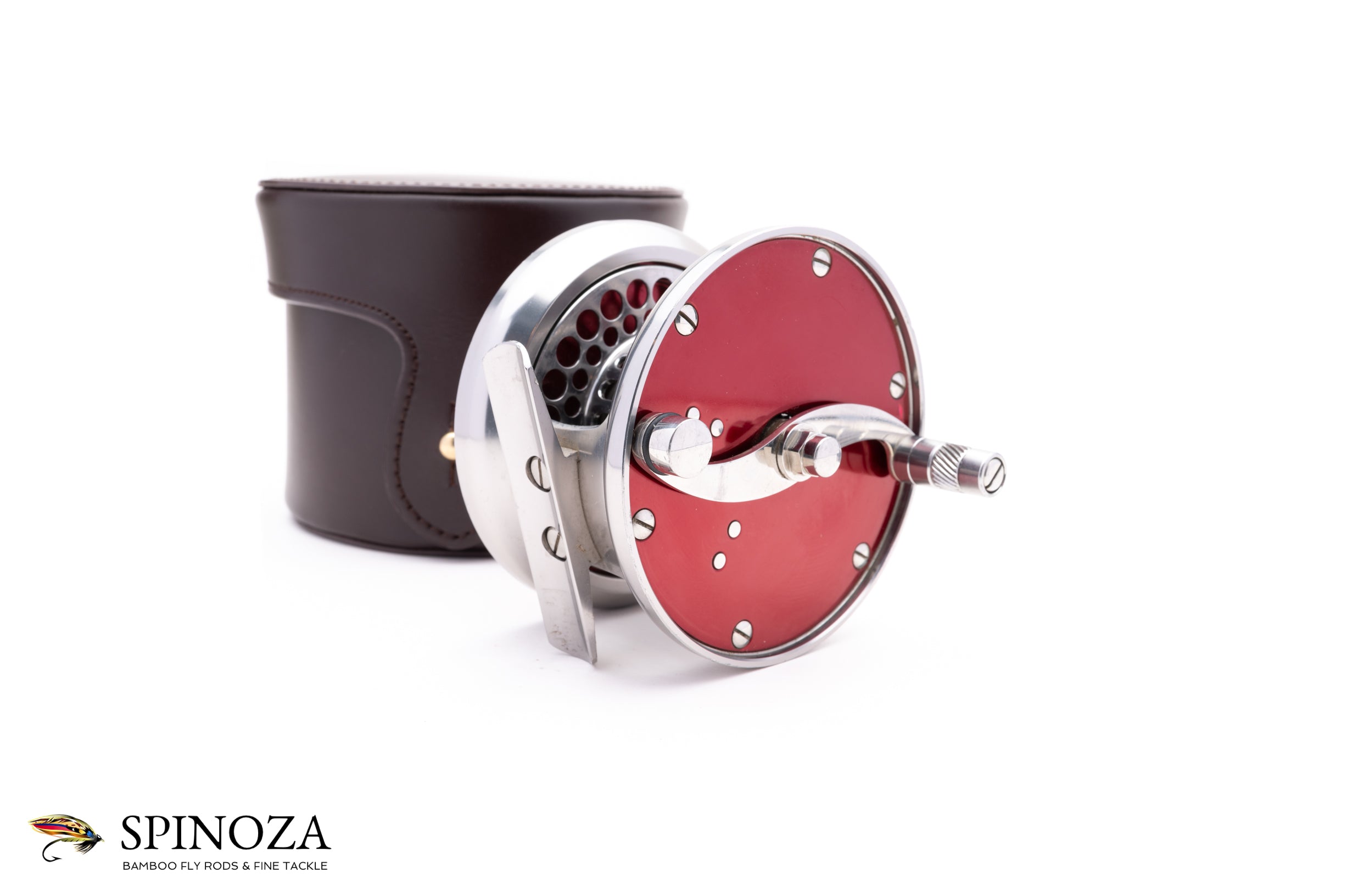 A Loop Classic 46 fly reel, 3 1/4" diameter and set up for RHW. The reel weighs 7.8 ounces on my scale. Good used condition with a moderate amount of minor rim rash on the frame edges and a little bit of scuffing on the drag adjuster dial, but the reel is clean otherwise and mechanically perfect. Red anodized sideplates. Serial number 21. Designed to hold a WF5 with 120 yards of 20lb backing. The reel packs into the original Loop leather case with a foam lining.
