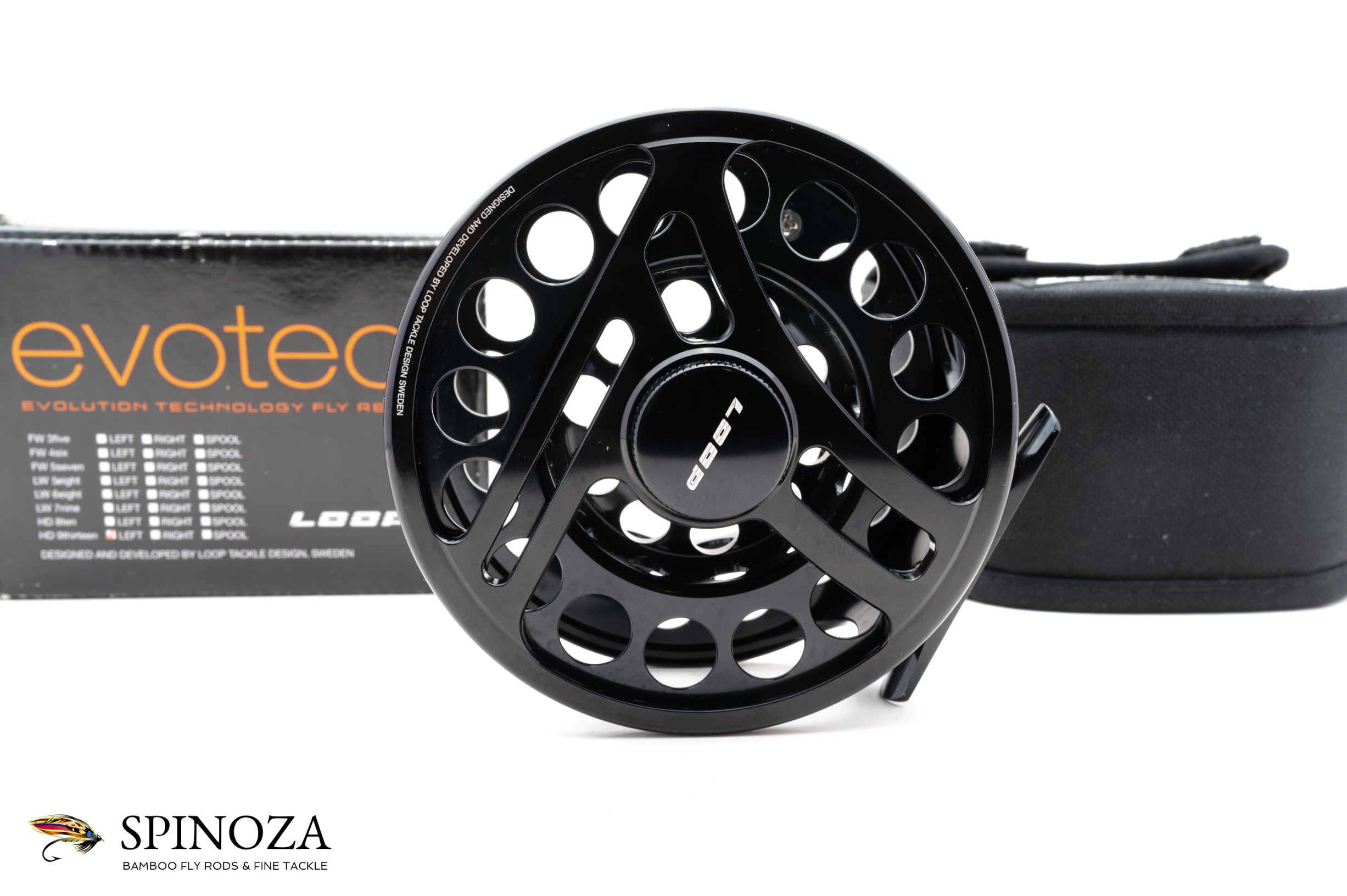 A Loop Evotec HD 9/13 Reel, 4 3/8" diameter and set up for LHW. 4th generation model. Mint unused condition. Contemporary large arbor design and heavily ported to reduce weight. Black anodized throughout. The drag is adjustable via the knob on the backplate. The reel comes in the original pouch and box.