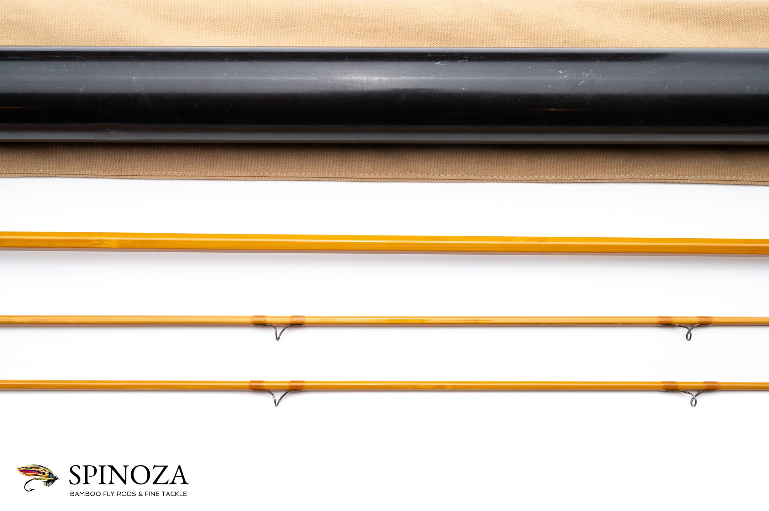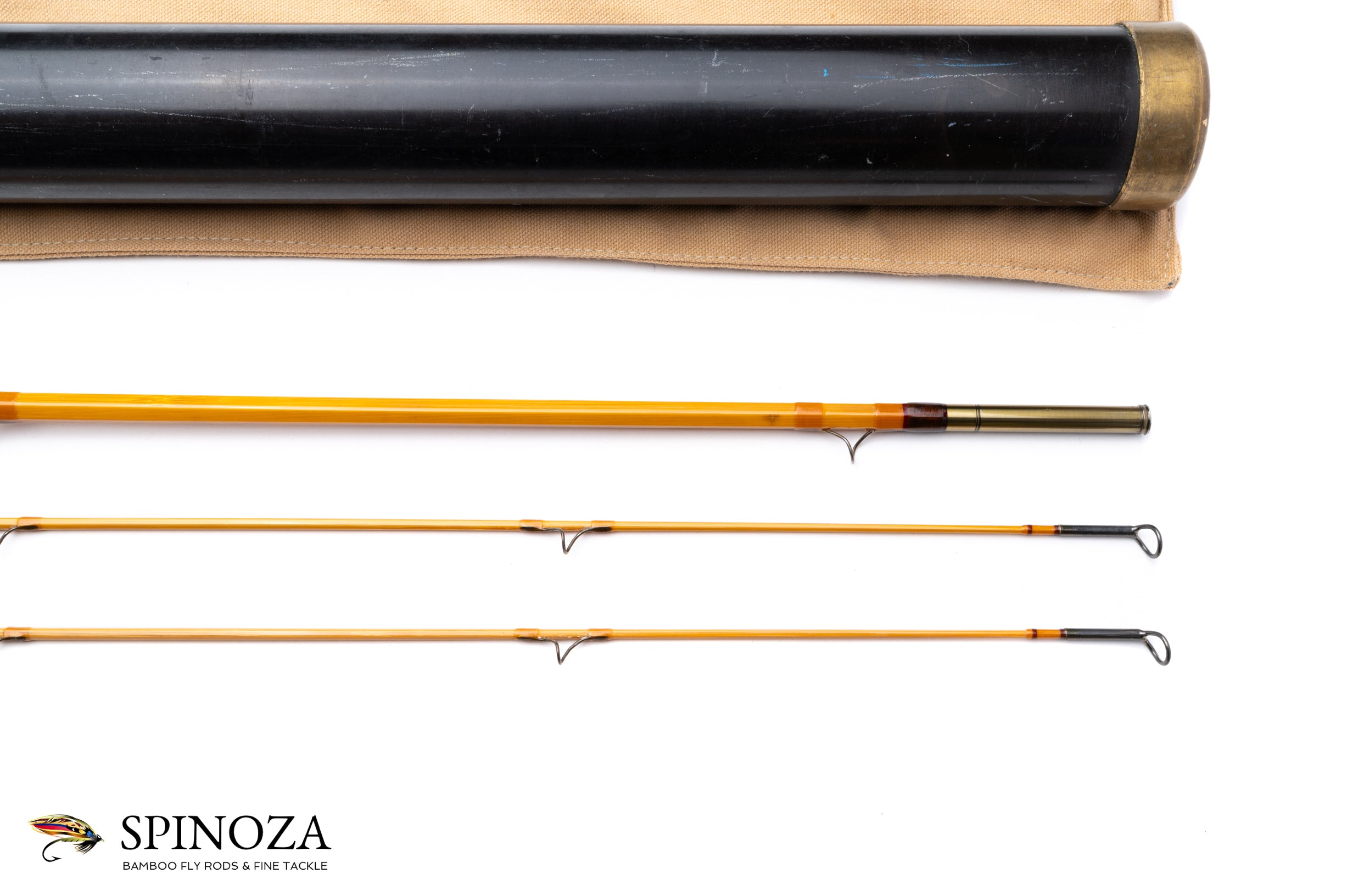 An HL Leonard model 39M-5 bamboo fly rod, 7'6", 2-piece, 2-tip, and built for a #5 line. Serial #434. Built in 1979 during the Maxwell period. The rod weighs 4 ounces on my scale. Medium to faster action for a #5. Very light use with just a hint of brassing to the interior of the guides and a little edgewear to the cap and ring oxidation (which is about 98% intact). There are no casting cracks to the ferrule wraps or edgewear to the ferrules. Blonde cane done in a three up node pattern. The varnish is superb. The main wraps are a honey color with maroon edges at the keeper with brown wraps at the ferrules and tip top. The step ferrules have the classic Maxwell Leonard pewter oxidized color. The grip is 5 1/2" long and shaped to a slim cigar profile. The reel seat is a mortised and varnished piece of curly maple with a pewter oxidized cap and ring (with a tiny bit of the aforementioned edgewear). The rod is factory straight with perfectly fitting ferrules. The rod packs into a tan cloth bag and a black anodized aluminum tube with brass fittings. These lovely Maxwell period rods are getting scarcer and scarcer, especially in this kind of condition.