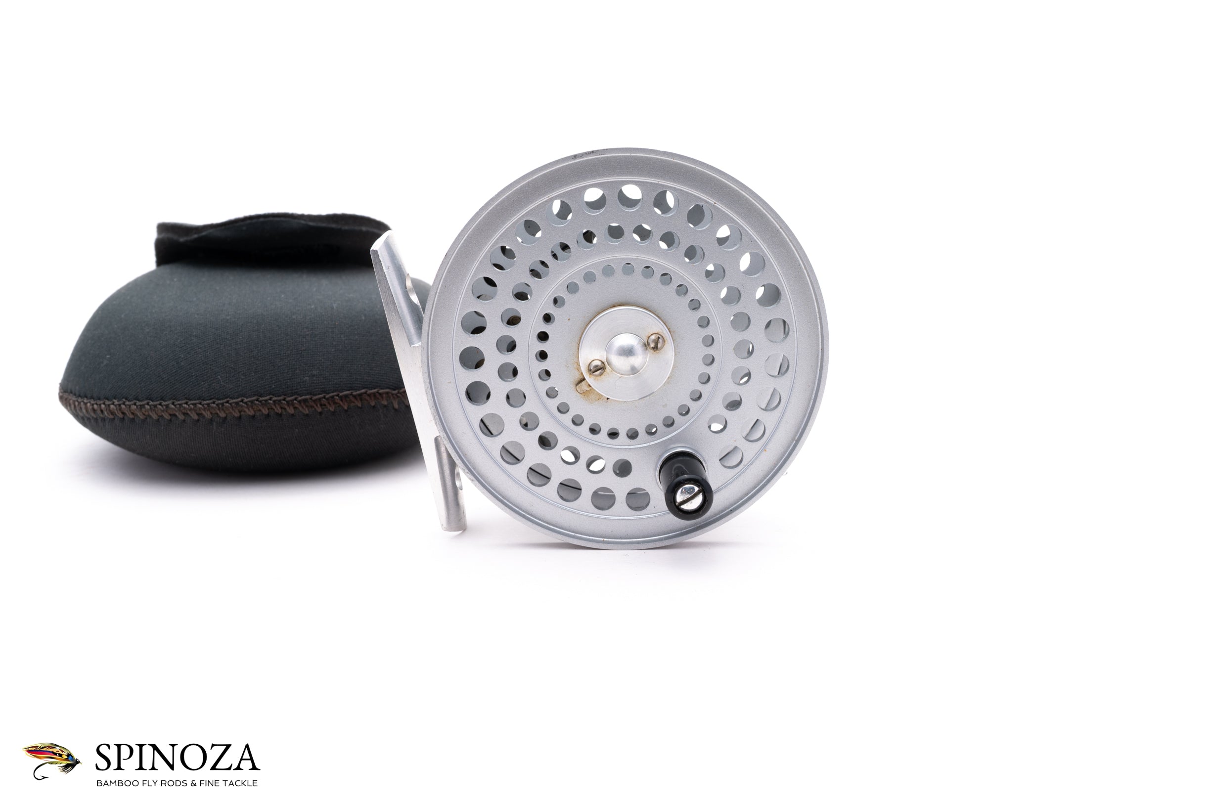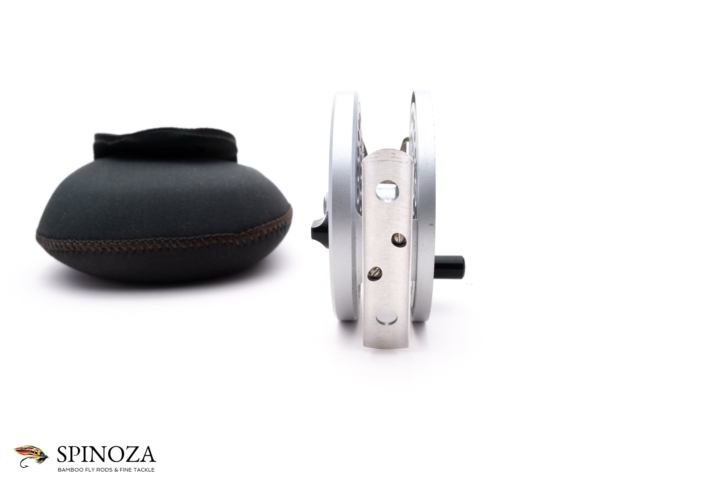 A nice Orvis CFO III 20th Anniversary fly reel, 3" diameter and set up for LHW (though reversible). This model was made in the early 1990's to commemorate the 20th year of production of the CFO line of reels. Near mint condition with just a few minor touches of cosmetic wear to the frame and some mounting marks on the foot, but very clean throughout. Made in England for Orvis by Hardy. Silver anodized with the frame heavily ported to reduce weight. Adjustable click and pawl drag. The reel packs into a brown neoprene Orvis pouch.